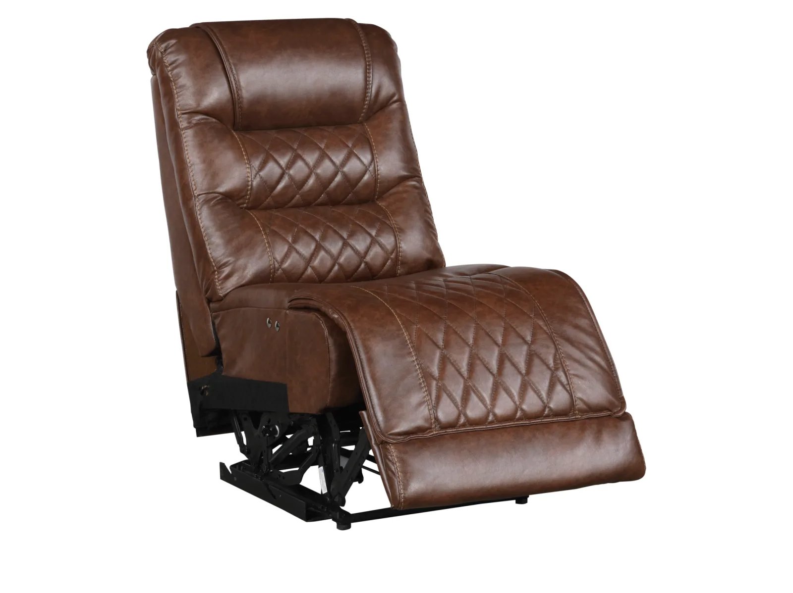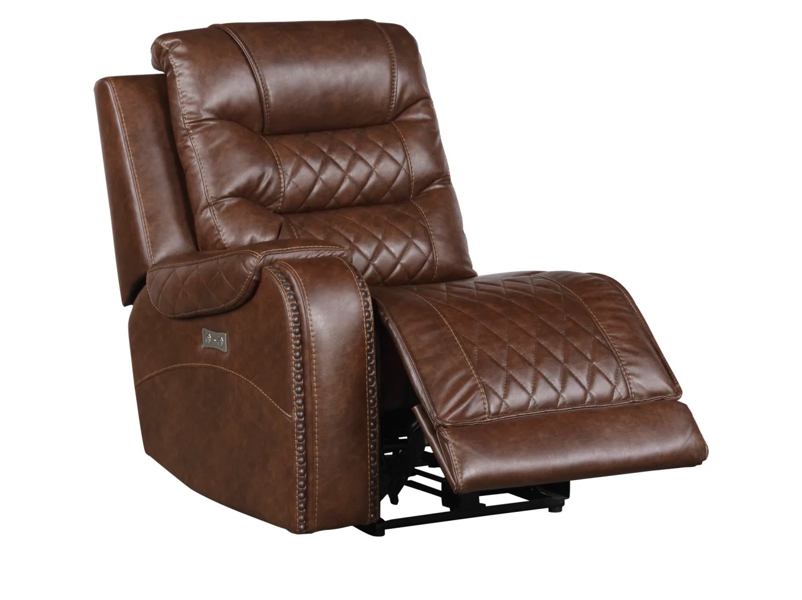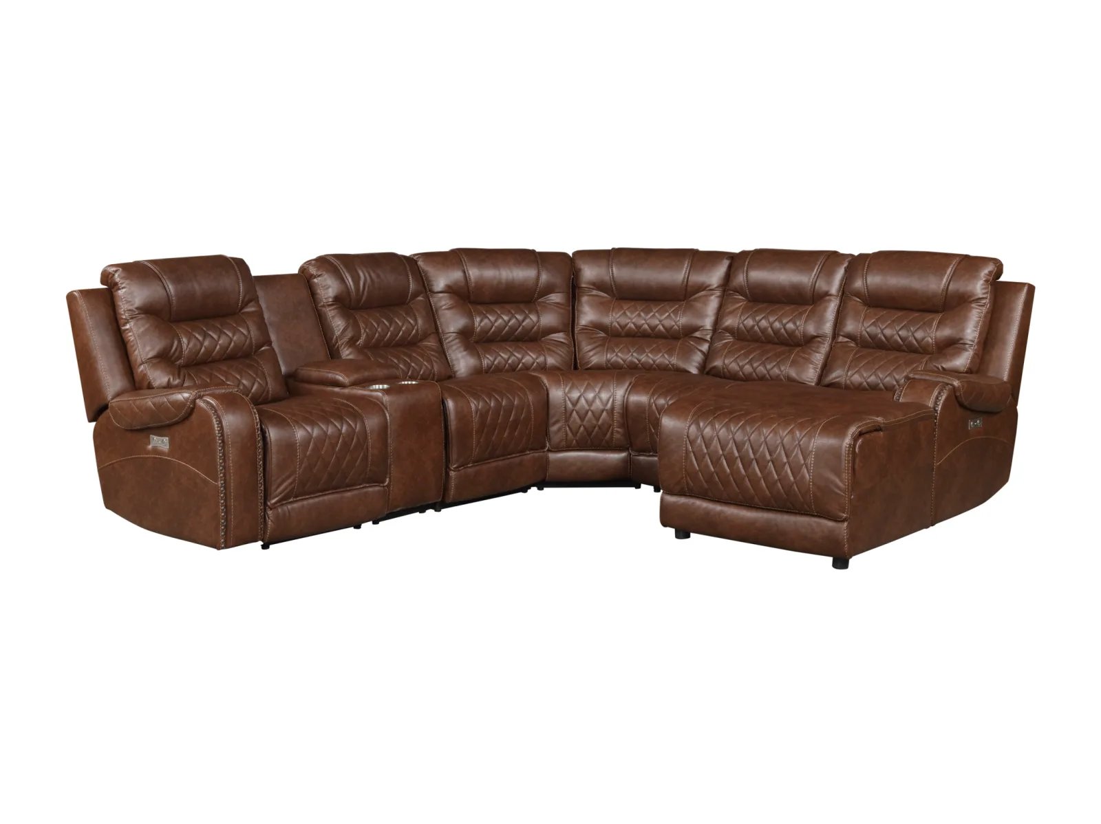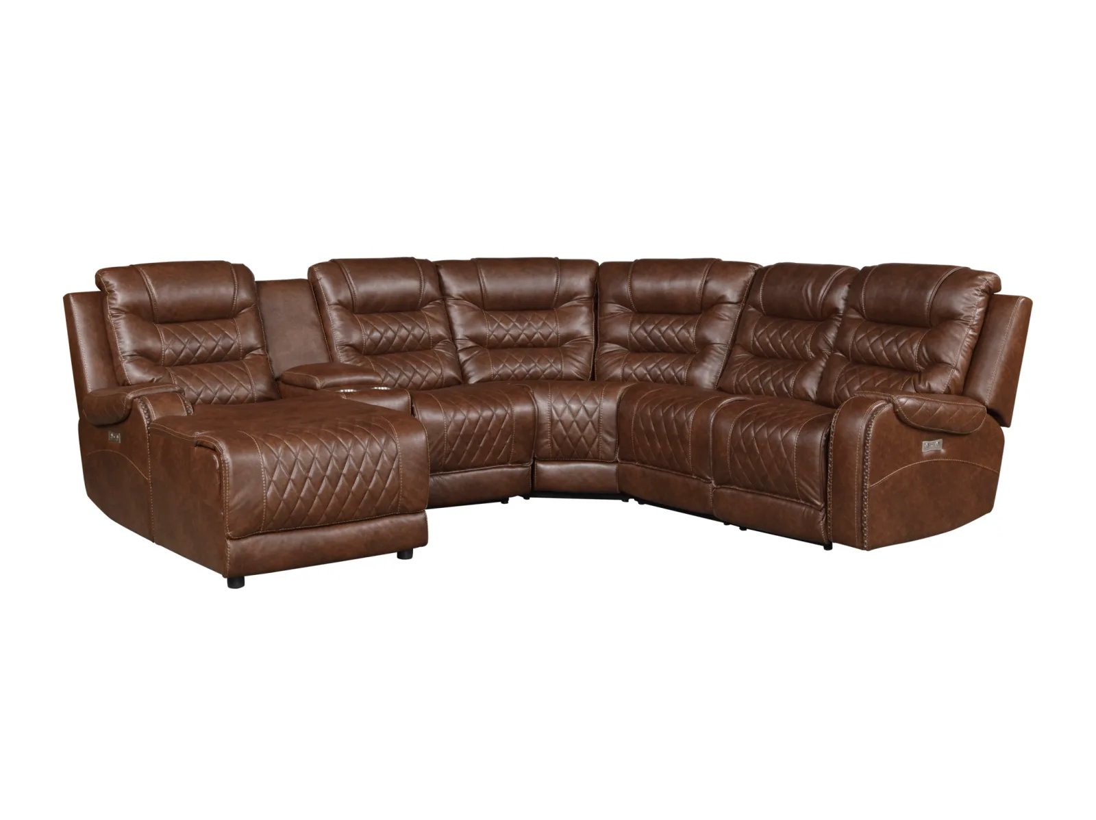 The Geoffery 6 Pc. Power Chaise Reclining Sectional will serve as a functional, stylish, and comfortable seating group for your living room. Flanking the center corner unit are the left-side or right-side chaise, featuring power reclining mechanisms and USB port, allowing for perfect placement within your available space and configurable to your individual needs. The console features cupholders and power receptacles. Expanding the profile of the sectional are the power recline armless chair and armless chair. The Geoffery 6 Pc Power Reclining Chaise Sectional is offered in a brown breathable faux leather with diamond pattern stitching and nailhead-adorned arms for a classic decorative effect.