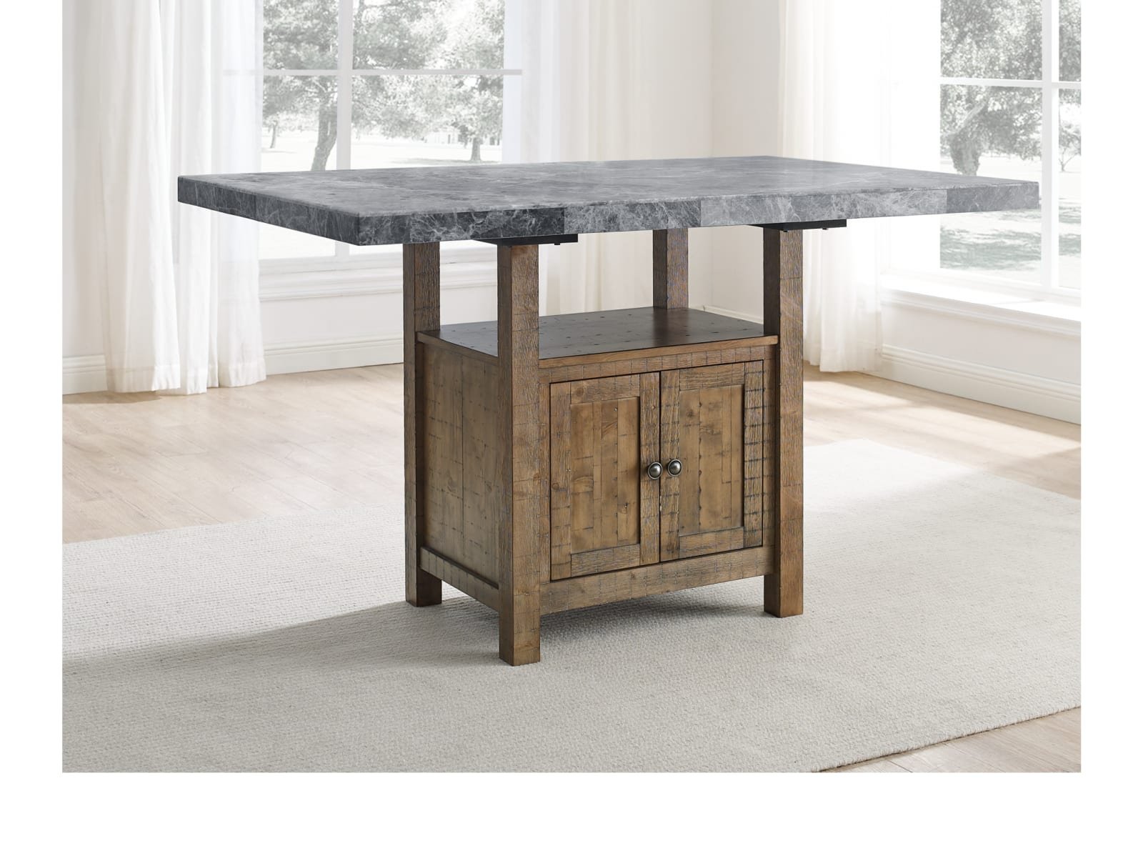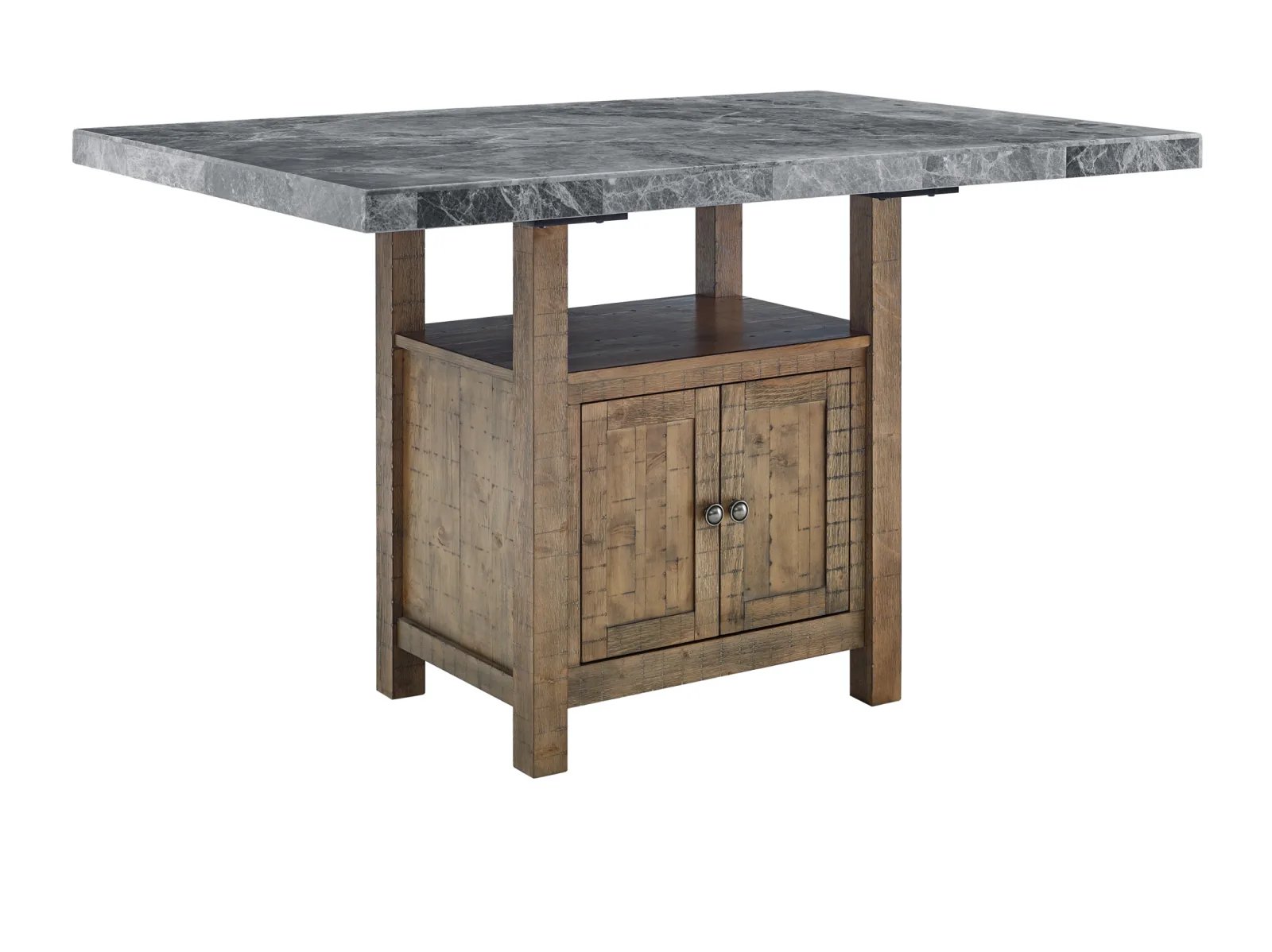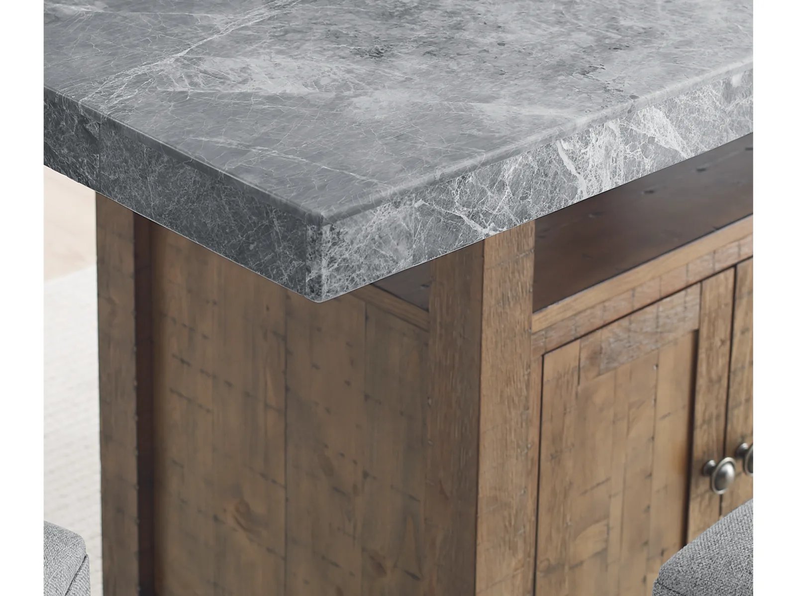 - Constructed with gray marble tops and hardwood solids in a driftwood finish