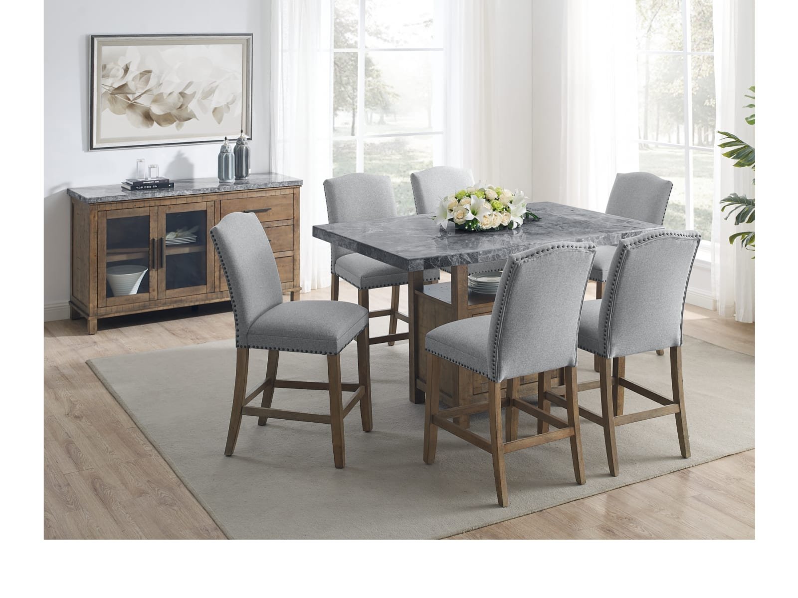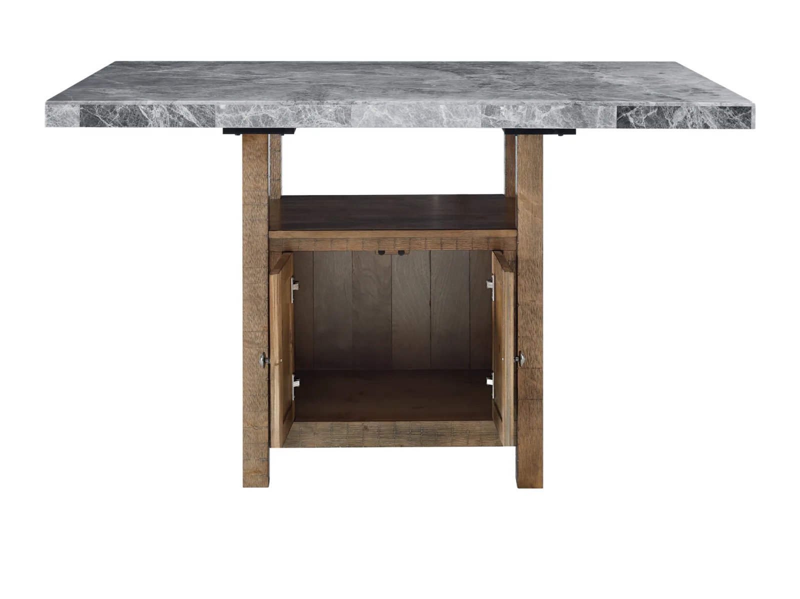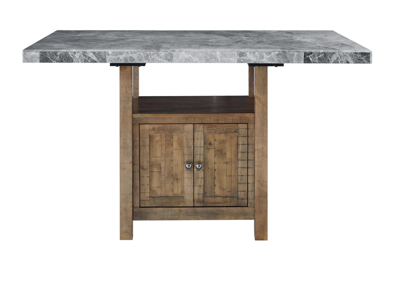 - Constructed with gray marble tops and hardwood solids in a driftwood finish