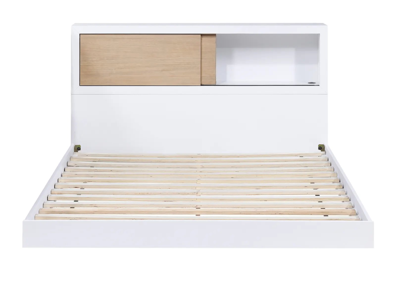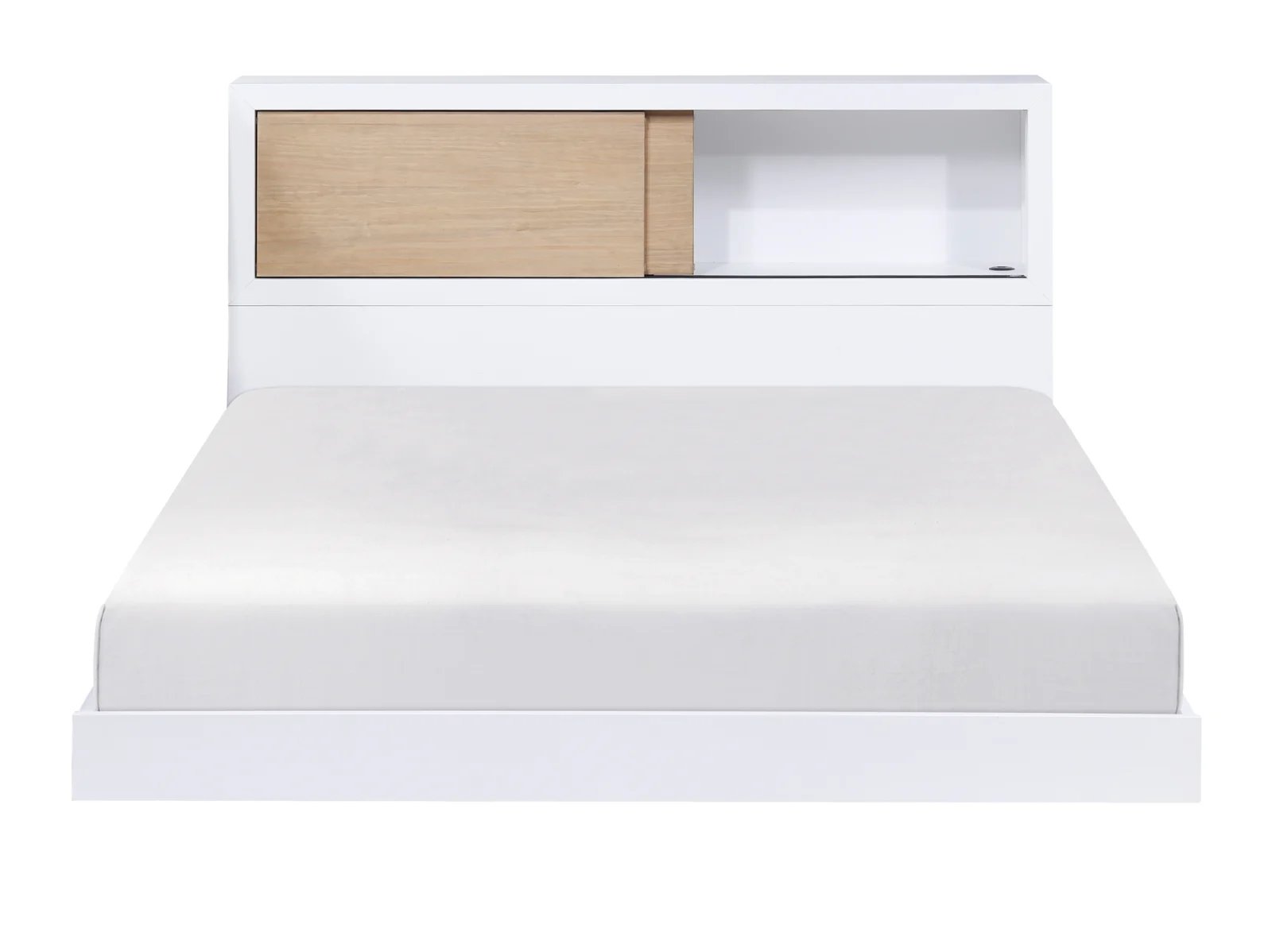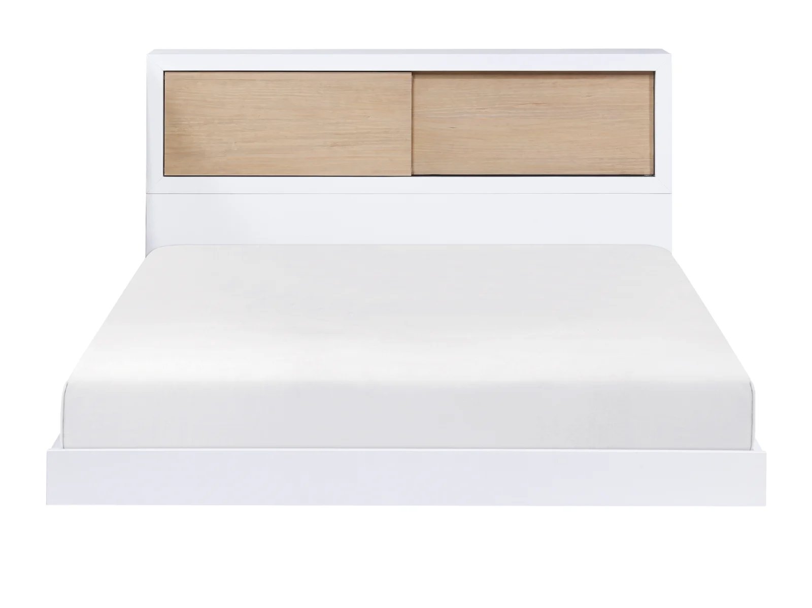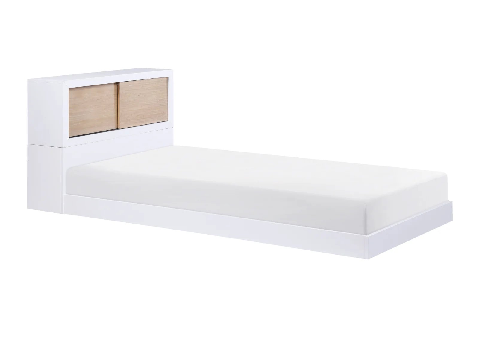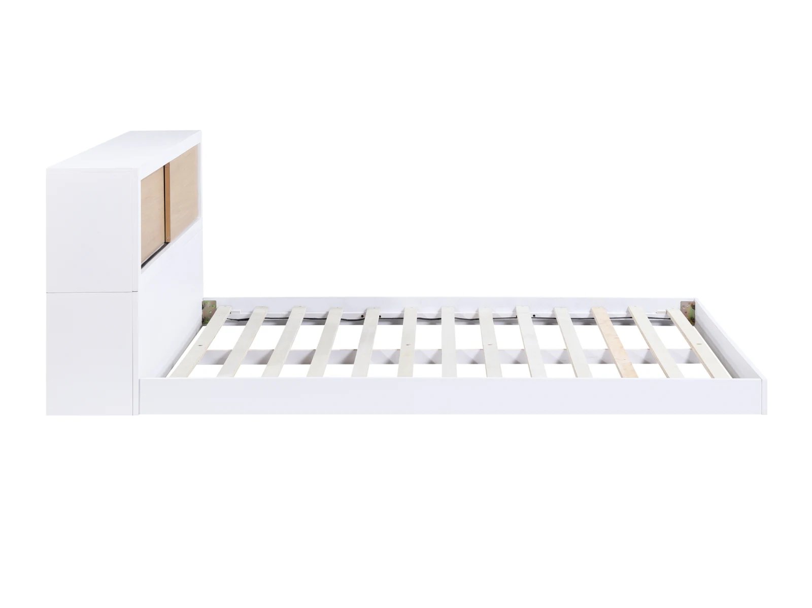Providing the perfect landing pad for your child’s bedroom, the Gianna Collection is a fun and functional addition to their space. The two-tone white and natural finish of the pine veneer is paired with the mid-century modern design to create a classic profile. The bed’s floor level ultra-low profile platform features a sliding door bookcase headboard which provides an enclosed storage space.