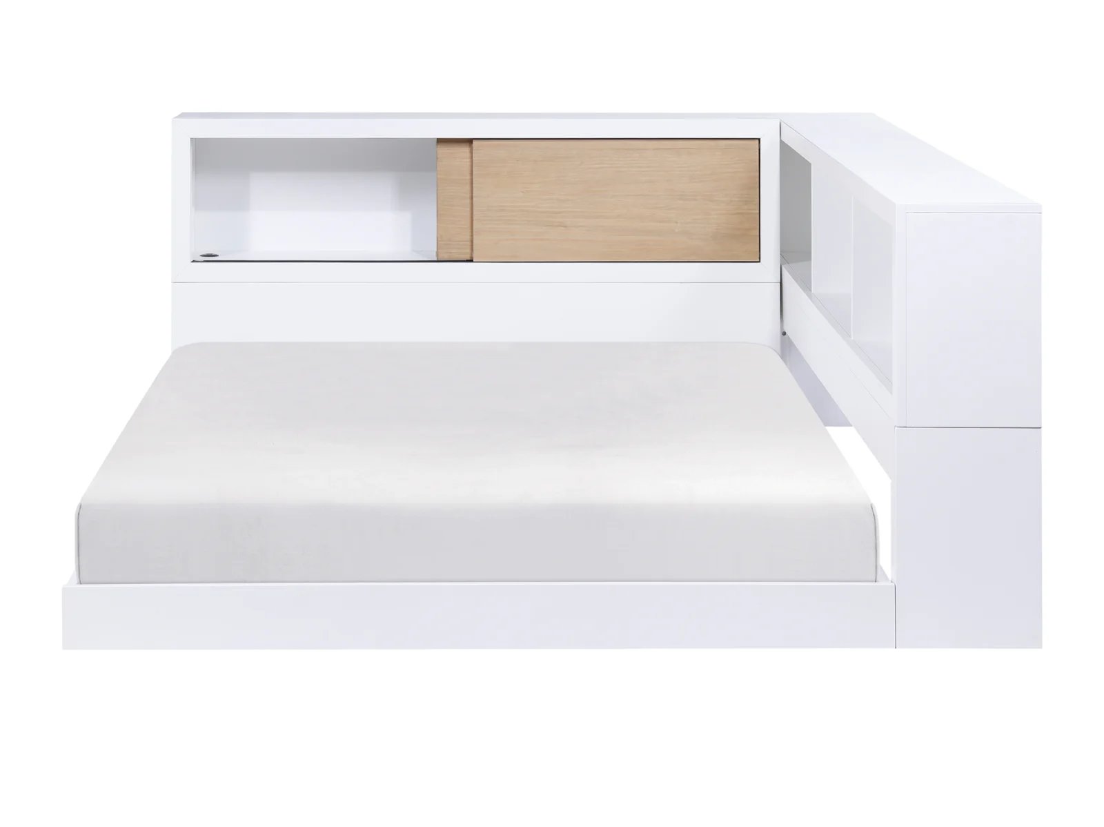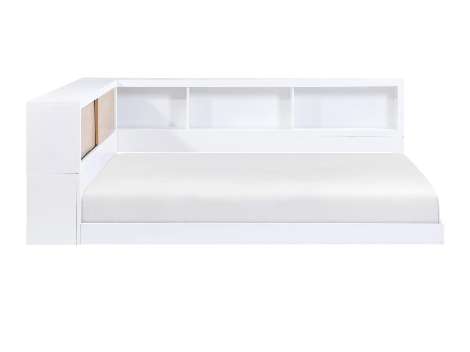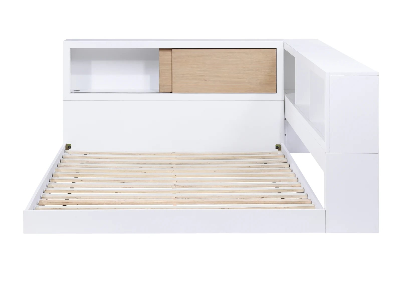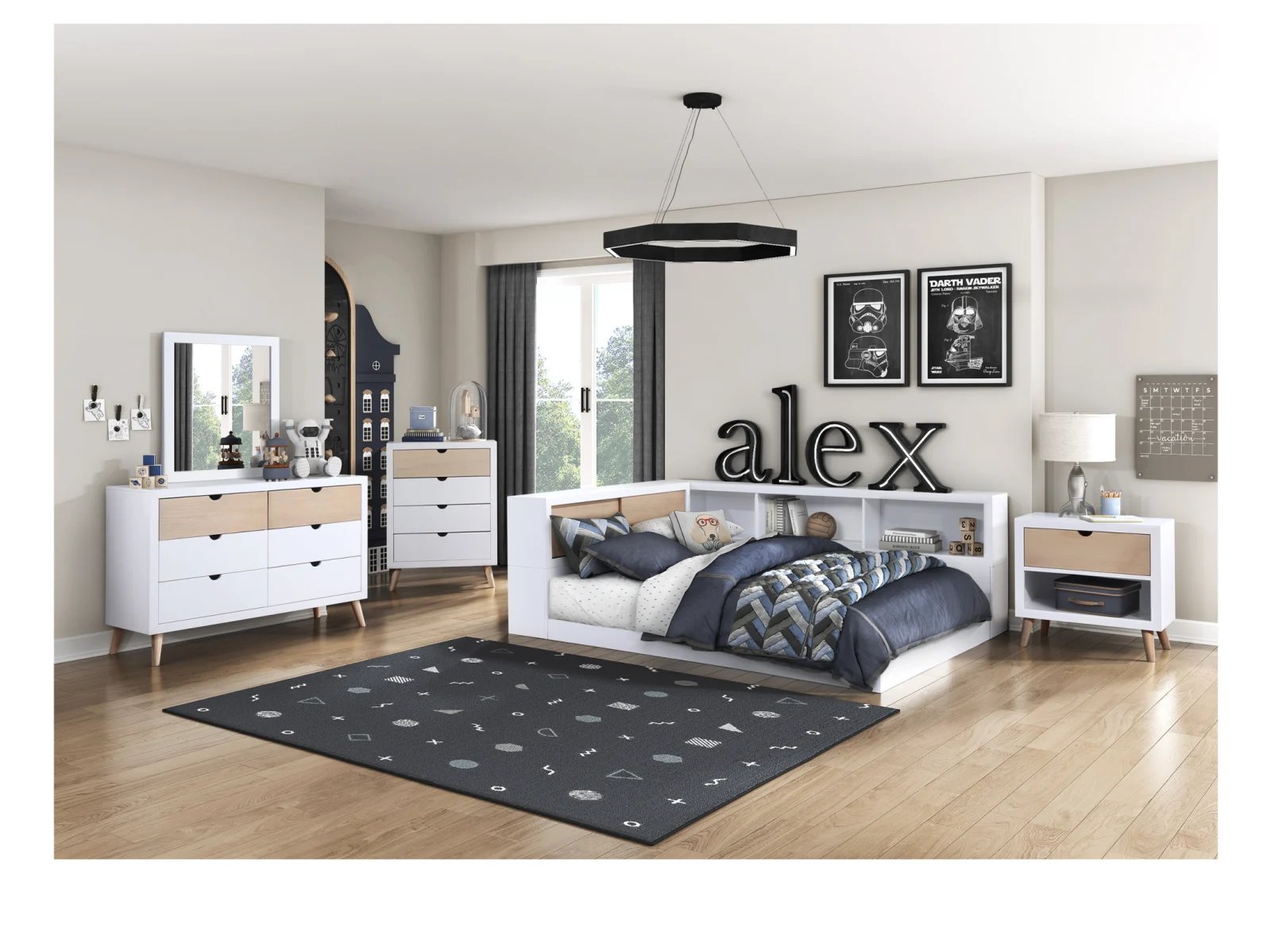 Providing the perfect landing pad for your child’s bedroom, the Gianna Collection is a fun and functional addition to their space. The two-tone white and natural finish of the pine veneer is paired with the mid-century modern design to create a classic profile. The bed’s floor level ultra-low profile platform features a sliding door bookcase headboard while the side-mounted bed-length open bookcase provides plenty of display storage.