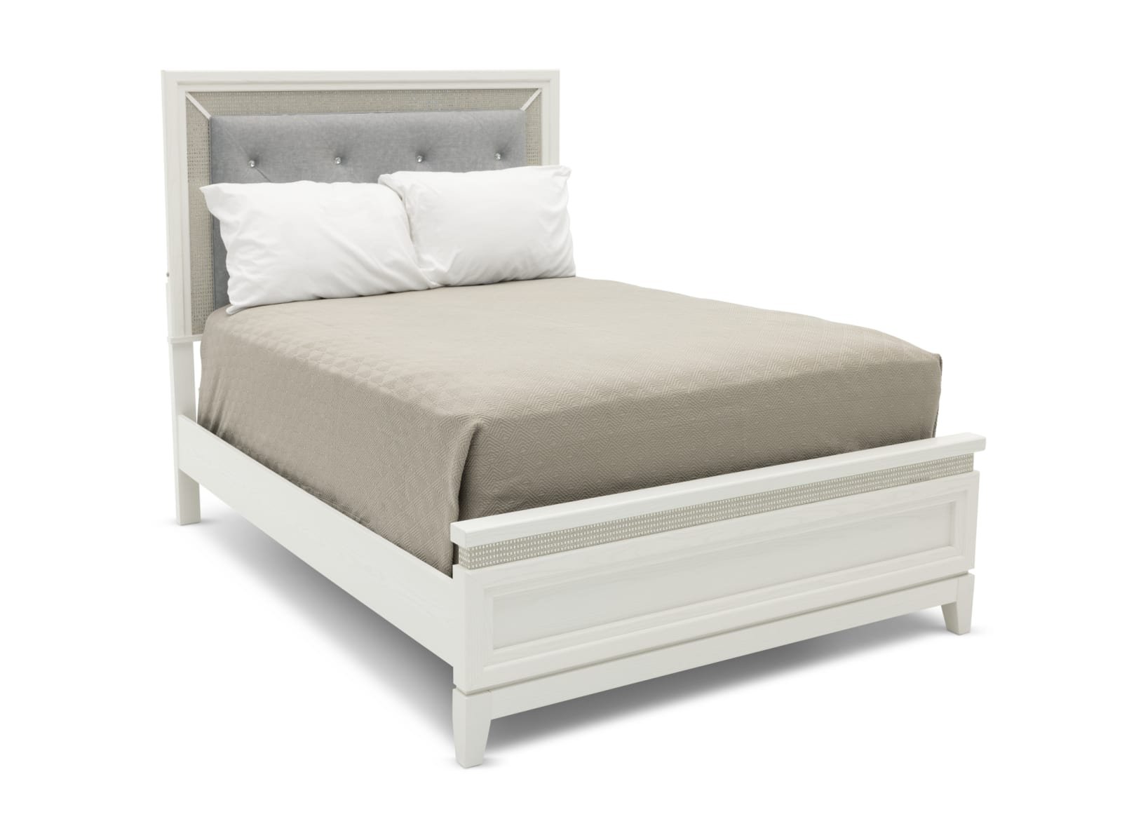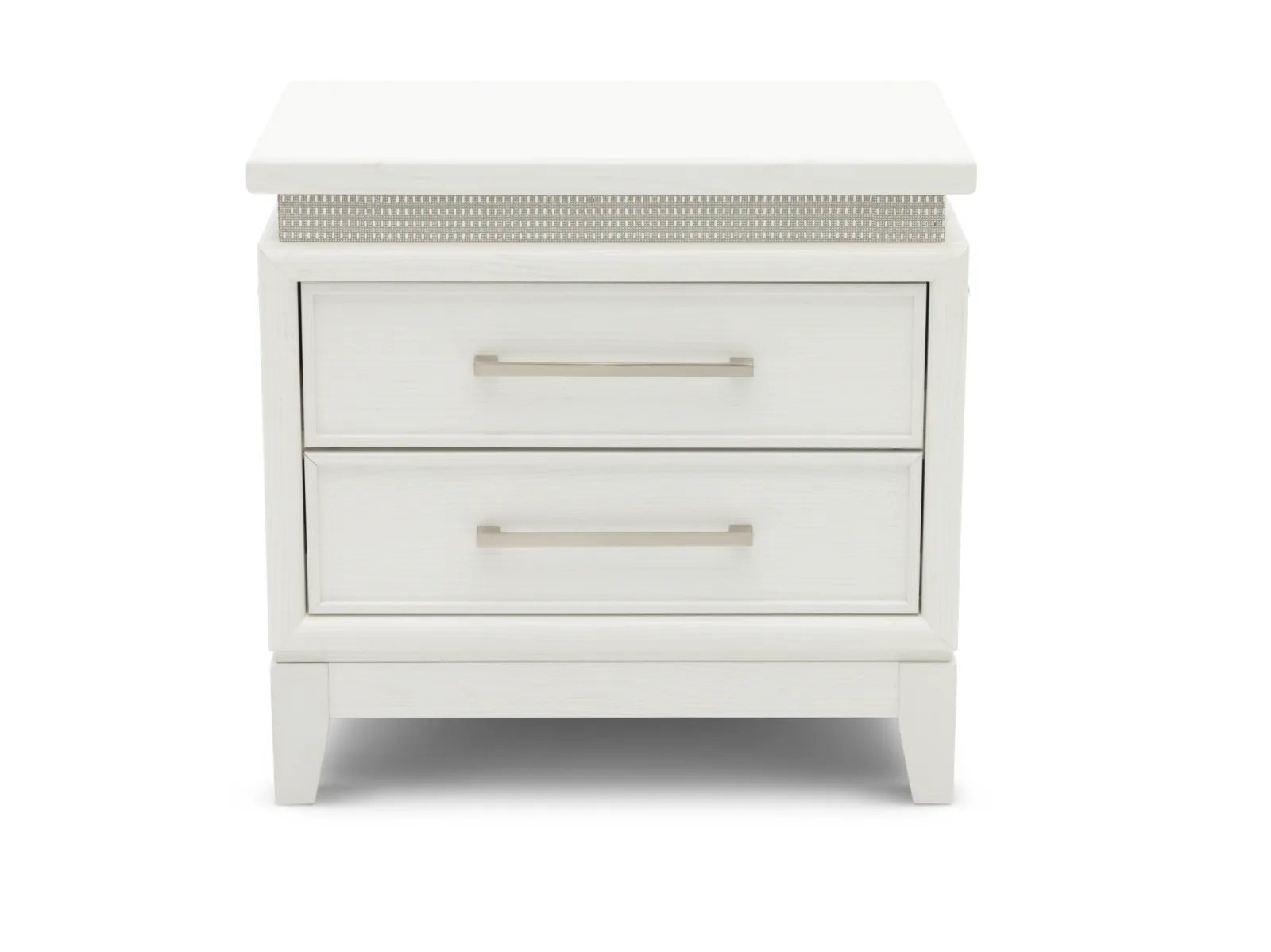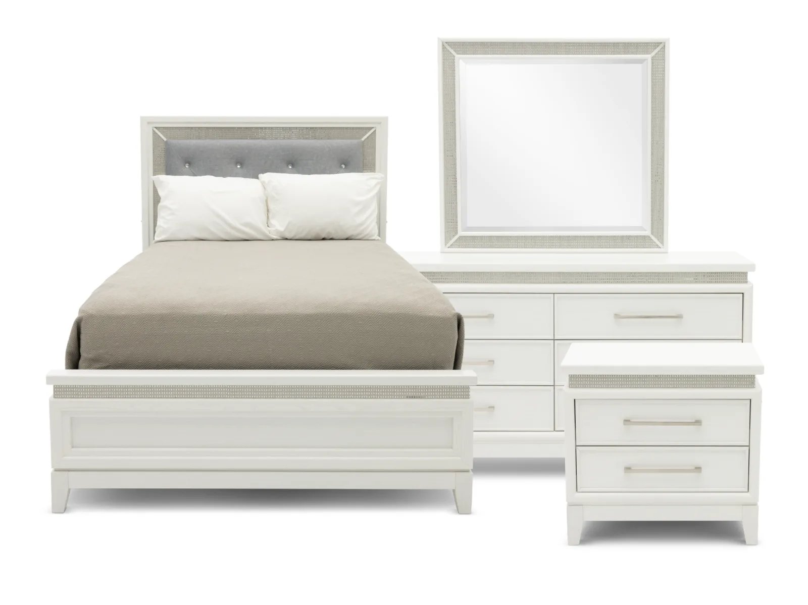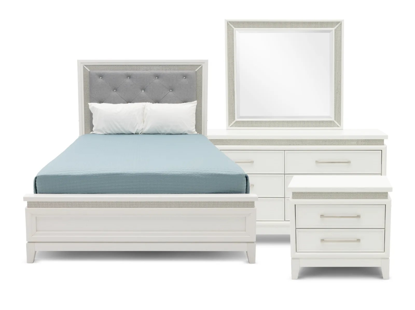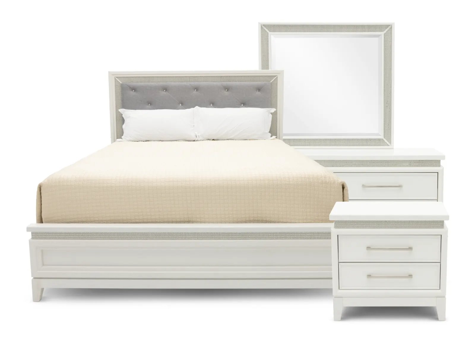 Create the sleep sanctuary of your dreams with the Glamour 4 Pc. Bedroom Set. Constructed from rubberwood solids and paper laminates, this set showcases a pearl white finish and features a blend of floating tops, LED lights, and rhinestones accents to deliver a chic bedroom aesthetic. If that wasn’t enough, the headboard is upholstered with chenille upholstery while the drawers feature sophisticated nickel pull hardware – plus the nightstand is outfitted with built-in USB charge ports for a final touch of convenience. Glam up your private oasis with the Glamour 4 Pc. Bedroom Set today! This set includes the Glamour Upholstered Bed, Dresser, Nightstand and the Glamour Mirror for a full bedroom ensemble.
