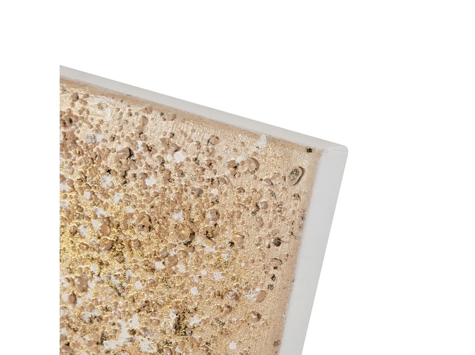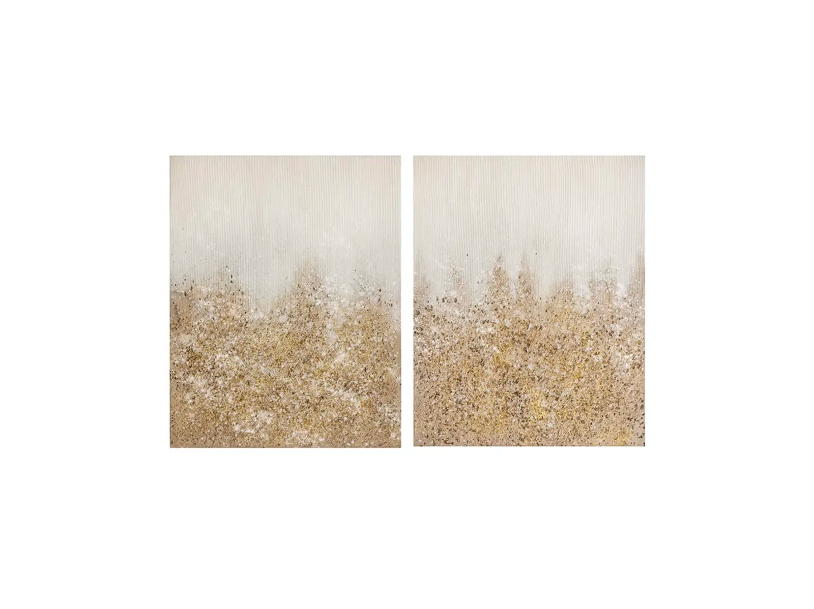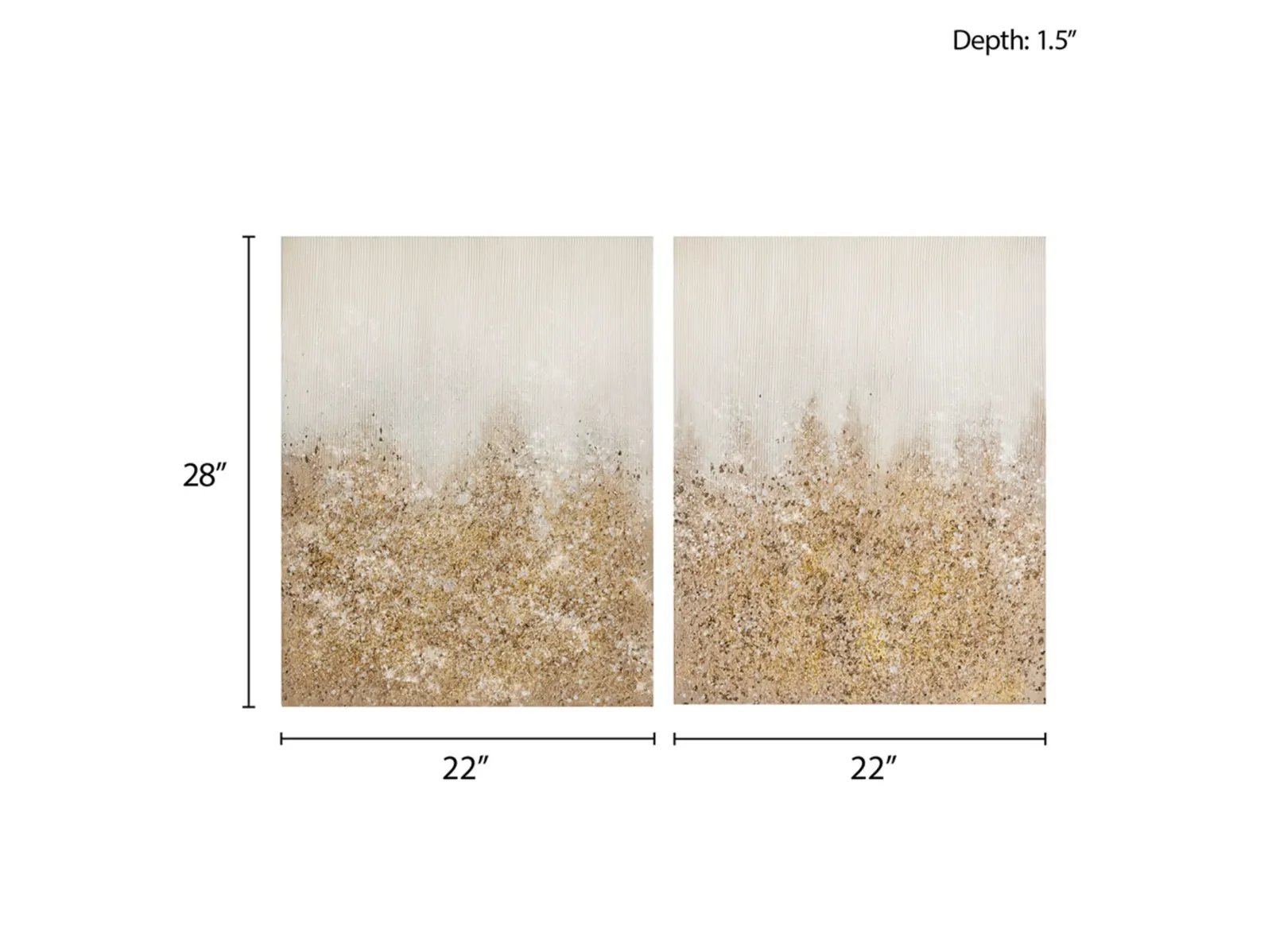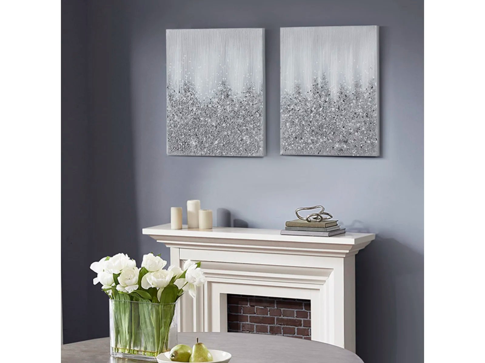 Elevate your home décor with the Glimmer Heavily Embellished Canvas Wall Art 2 Pc Set. This stunning set features a captivating gradient abstract design in metallic gold or silver hues, adding a touch of modern glam to any space. Hand-brushed and embellished with real rock and stone, each piece offers unique texture and dimension. The luxurious glitter finish adds a beautiful sheen and luster, catching the light and creating a captivating focal point. Easy to hang with D-rings on the reverse and finished with a sturdy cardboard backing, this set is designed for effortless display. Choose from the warm, inviting glow of gold or the cool, elegant shimmer of silver to perfectly complement your existing décor. Please note that due to the hand-embellished nature of this artwork, slight variations in color and glitz may occur, making each piece a unique work of art.