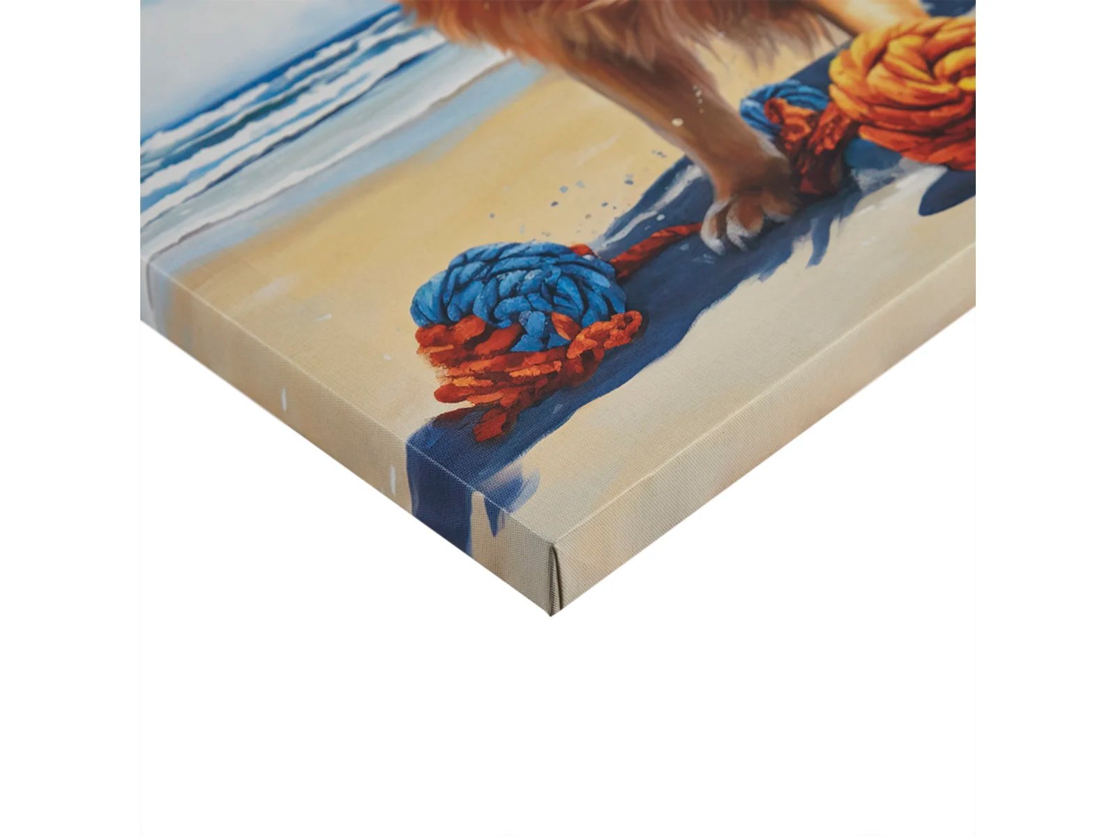 Bring the joy of the beach home with this charming Golden Retriever Beach Dogs Canvas Wall Art. Featuring a playful Golden Retriever frolicking on the sandy shore with its rope toys, this vibrant canvas print captures the essence of summer fun. Created by artist Tessa Kane, this piece is perfect for dog lovers and beach enthusiasts alike. The pre-installed sawtooth hanger makes it easy to display in any room, adding a touch of warmth and happiness to your living space. Simply spot clean to maintain its vibrant colors. Consider pairing with other Beach Dog canvases for a coordinated and cheerful wall display. Ideal for living rooms, bedrooms, or any space that needs a touch of playful charm.