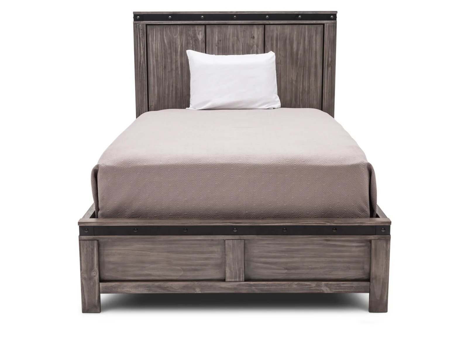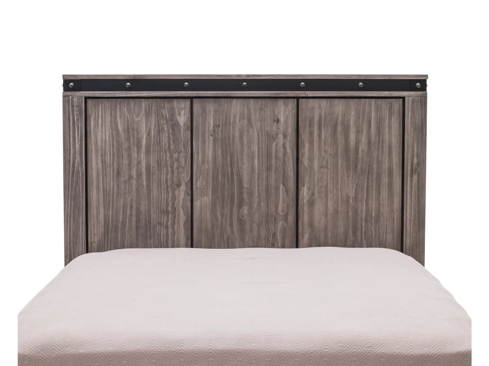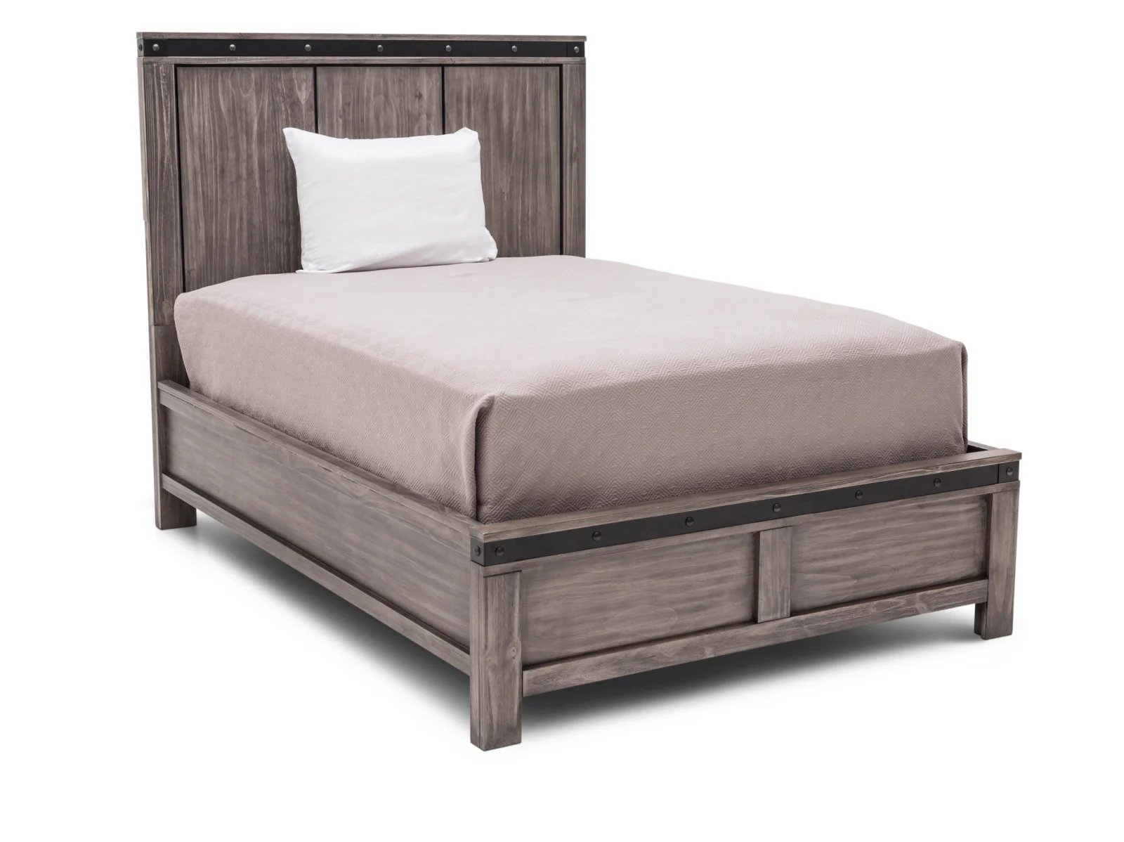 The Gunsmoke Panel Bed curates retro-industrial allure in any room. A wire-brushed gray finish on pine solids and veneers is paired with brushed metal trim and oversized nailhead accents for added edginess. Available in full, queen, and king sizes, this stylish bed is transitional and can complement an array of styles and color palettes. Add some sultry, industrial flair to your room with the Gunsmoke Panel Bed.