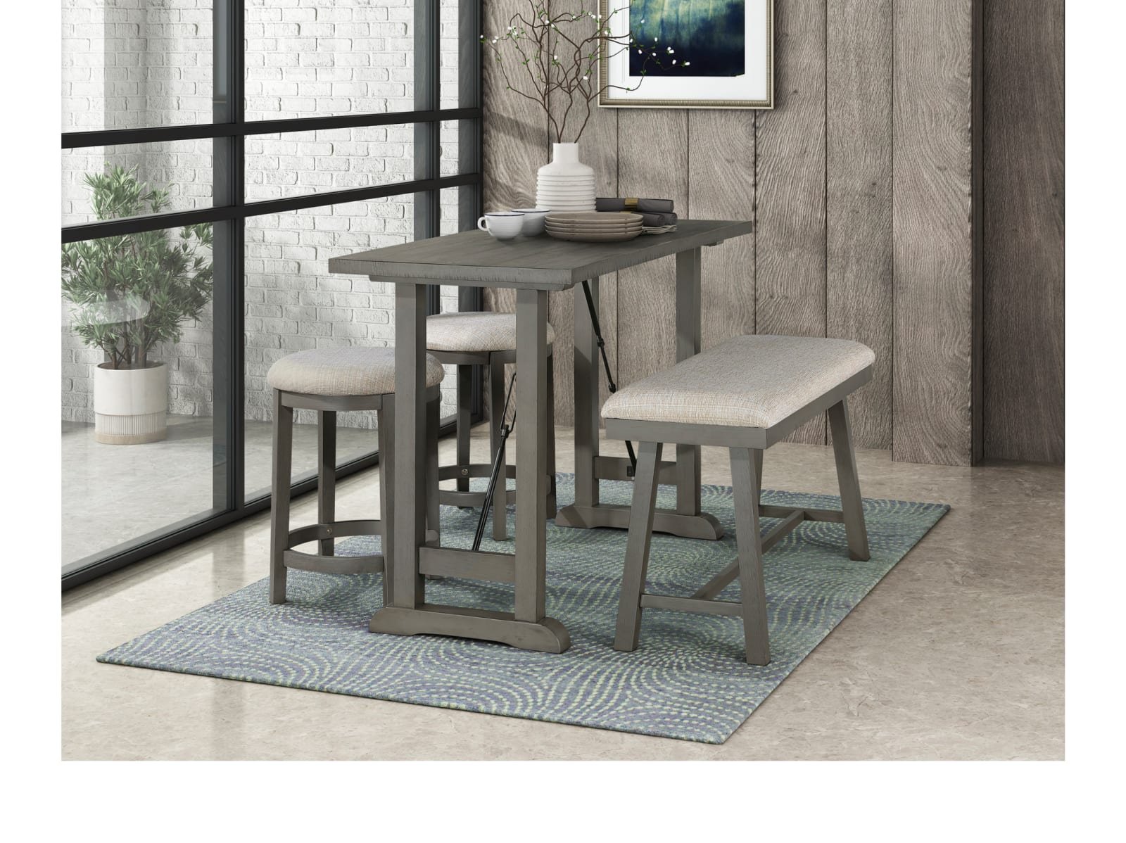 & Free ShippingBring a touch of industrial charm to your dining space with the Hagerstown 4 Pc. Counter Height Dining Set. This set features a turnbuckle base with black metal supports paired with a light gray acacia veneer tabletop, offering a striking contrast and transitional appeal. Ideal for smaller areas or those seeking a taller dining height, it includes 2 comfortable stools and an inviting bench with neutral upholstered seats for stylish gatherings. Make every meal a special occasion with this durable and attractive set.