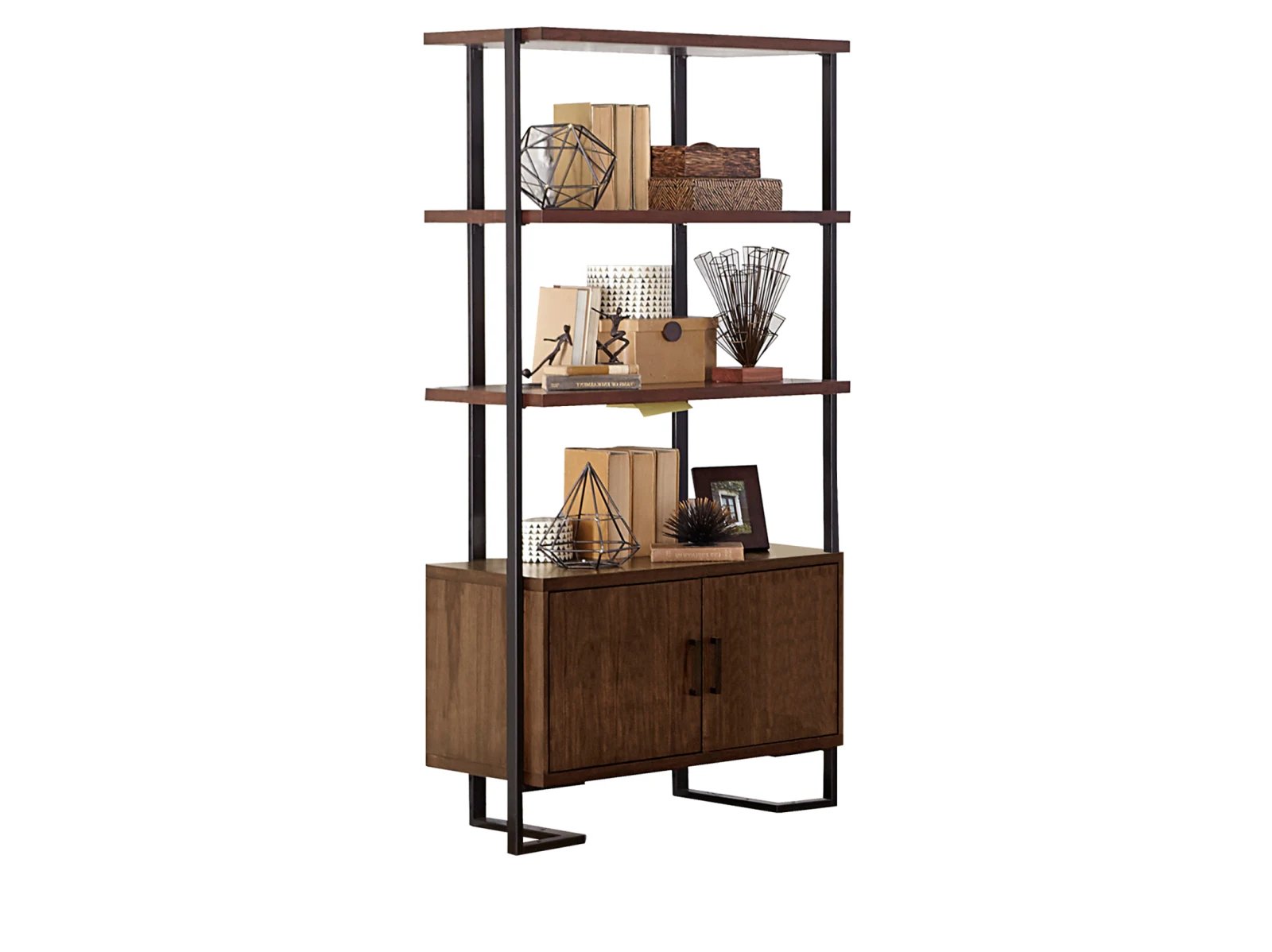 Whether your home leans to transitional or contemporary design, the Helena Collection will be the perfect fit for your needs. From the distinct walnut veneer pattern to the unique framing of the file cabinet, each design component lends to placement in a variety of home office settings. The dark metal horizontal hardware and metal support framing complements the finish of the group while providing distinct contrast. Convenience factors include drawer storage and hanging file support rods.
