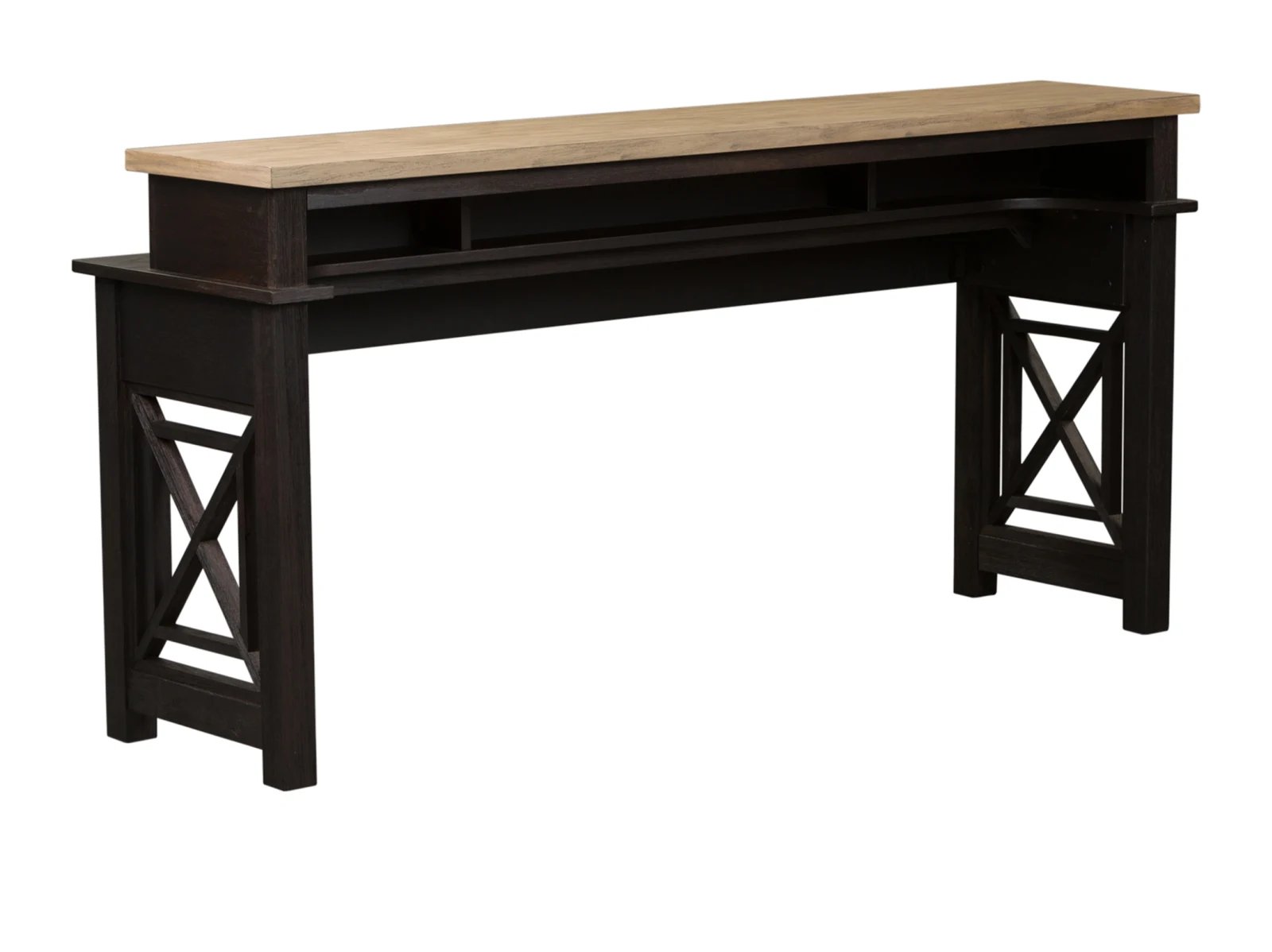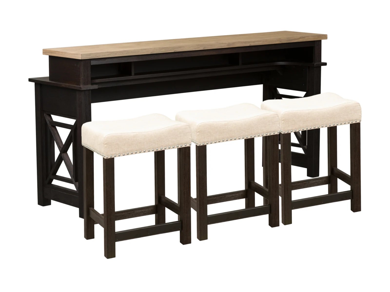 & Free ShippingWhether your style is rustic, urban or farmhouse Hempstead is sure to complement. Crafted of poplar solids and acacia veneers with a charcoal and ash finish. Features appealing open grid end panels with block legs, two electrical outlets and two USB ports for easy access charging, three cubbies for storage. Stools offer upholstered padded saddle style seats for comfort with nail head accents. Comfortability fits three barstools and is perfect for behind your sofa or kitchen nook. Kit consists of one console bar table and three console stools.