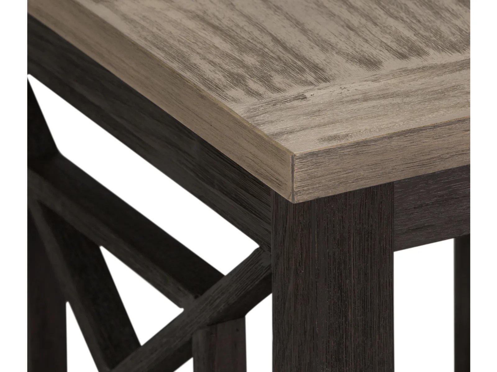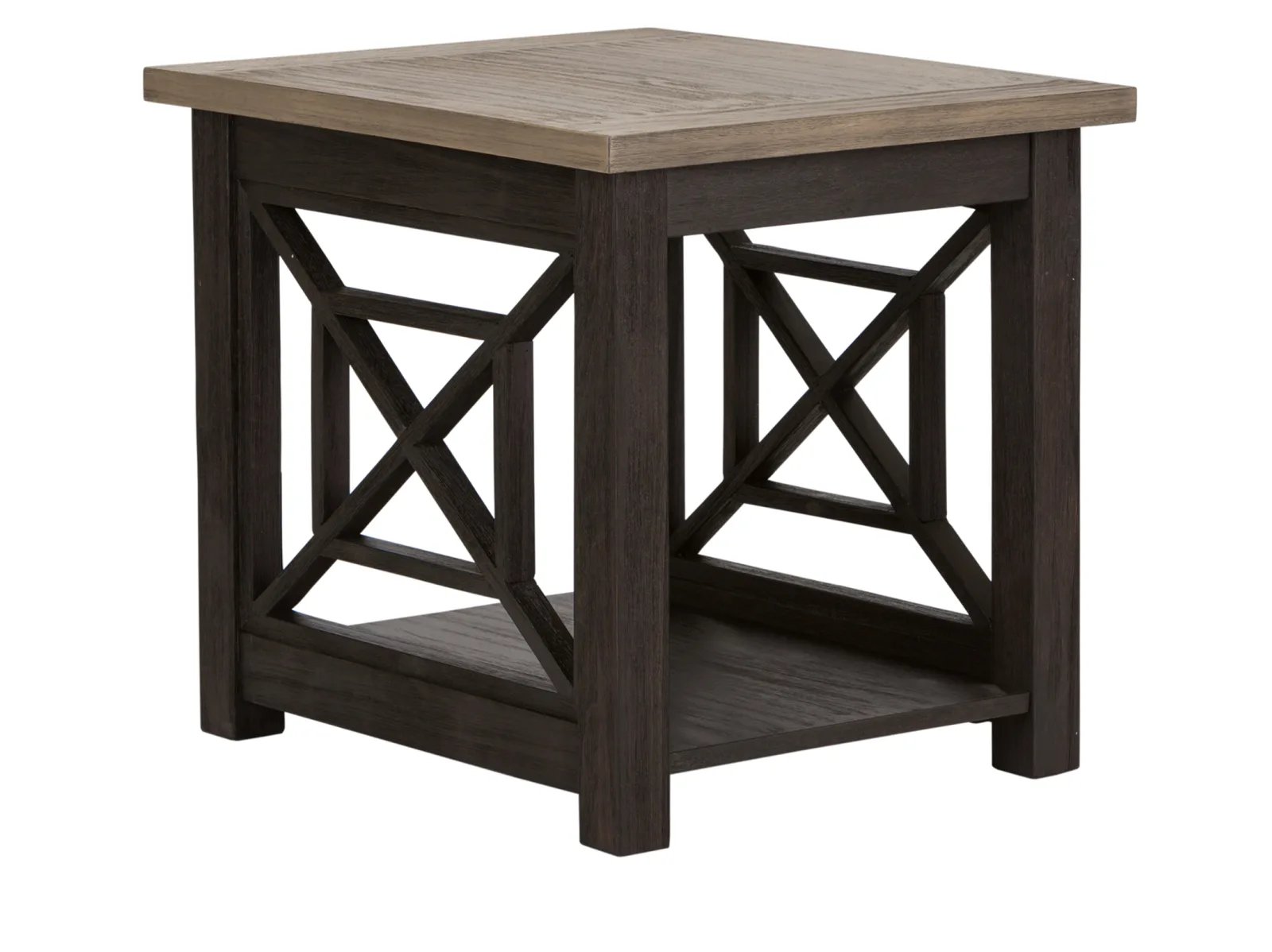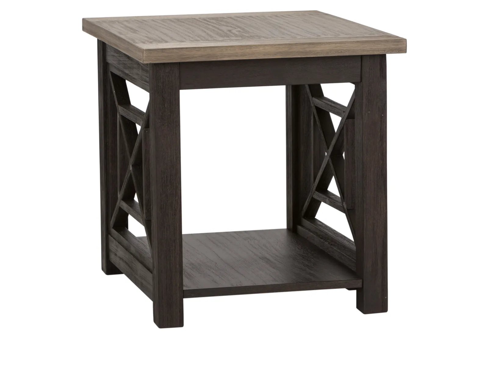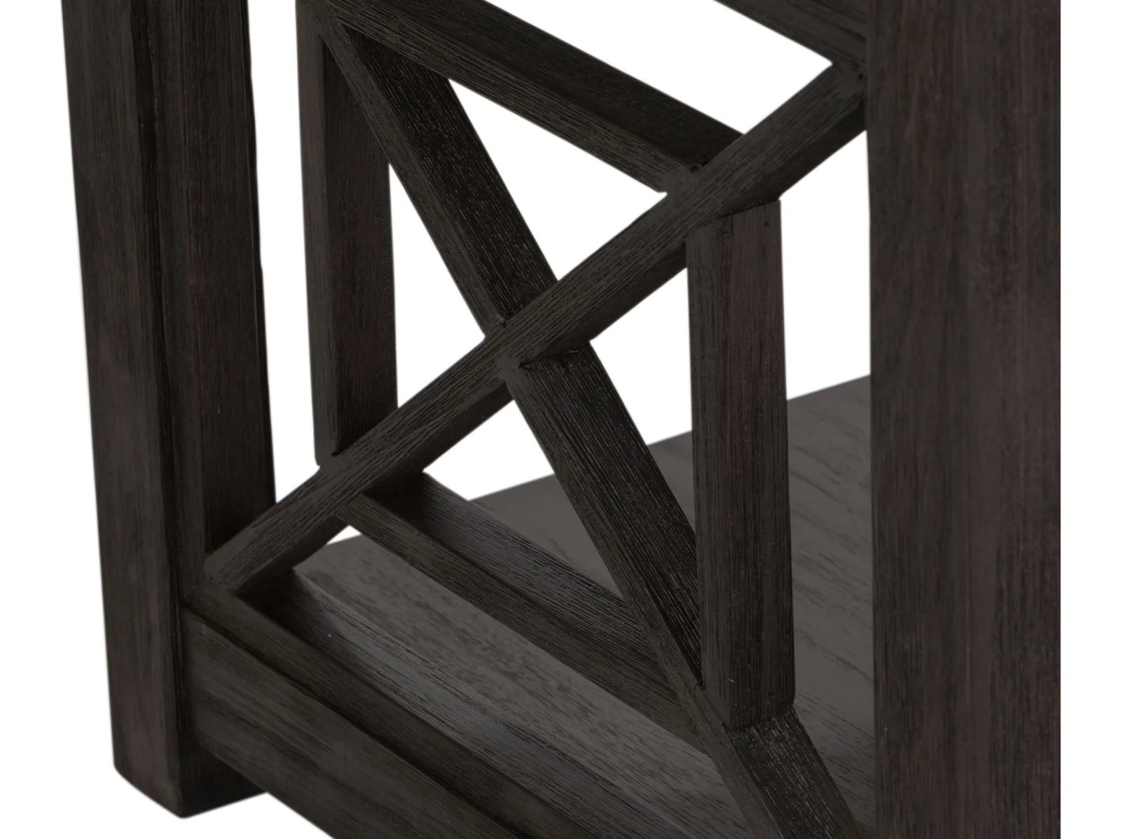 Accent your space with the Hempstead End Table. Crafted of poplar solids and acacia veneers, this piece features a charcoal and ash finish, bottom shelf for additional storage, appealing open grid end panels, anchored by a block leg design. This unique end table would be a wonderful accent piece in any home.