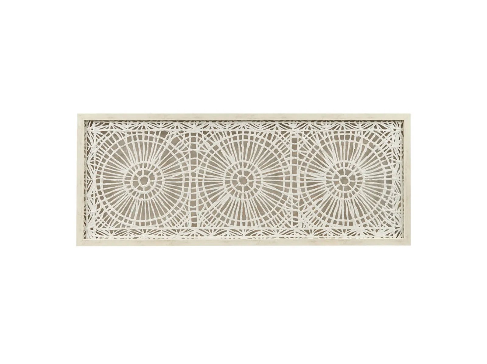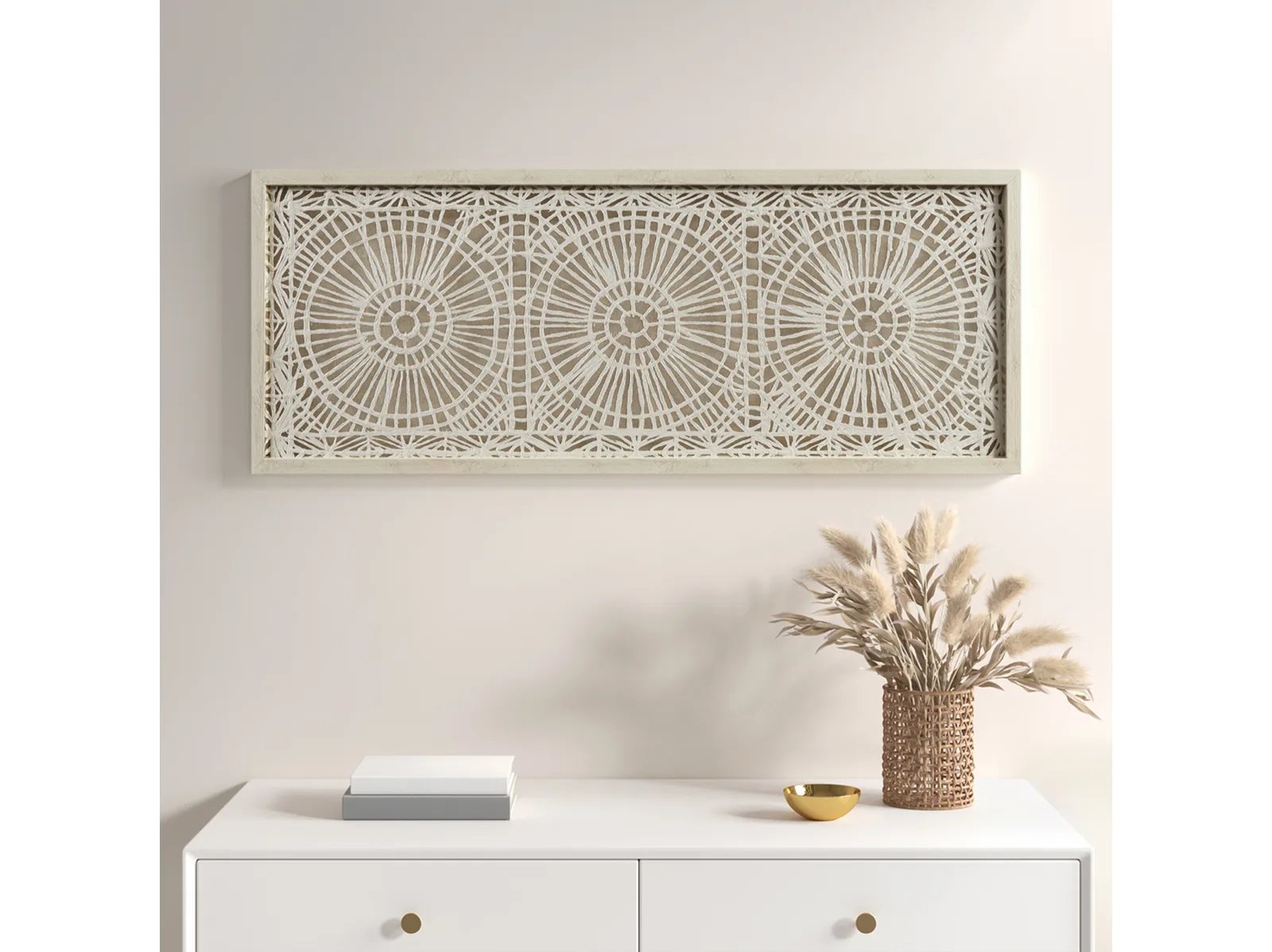 Adorn your wall with the Henna Medallion Rice Paper Shadow Box Wall Decor. This alternative piece features medallion motif design handmade into a delicate natural rice paper that adds unique, artisan style. Showcasing sculpt patterns in natural tones and textures. Full of dimension, this work of art comes ready to hang in a shadow box frame under glass. 4 D-rings are finished on the reverse of each piece making this set easy to hang. A fascinating addition to modern and boho spaces.