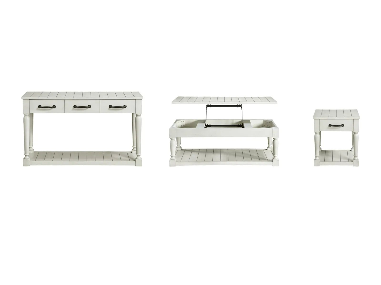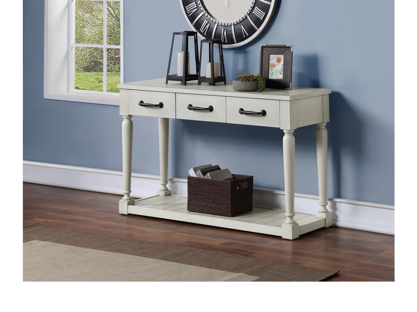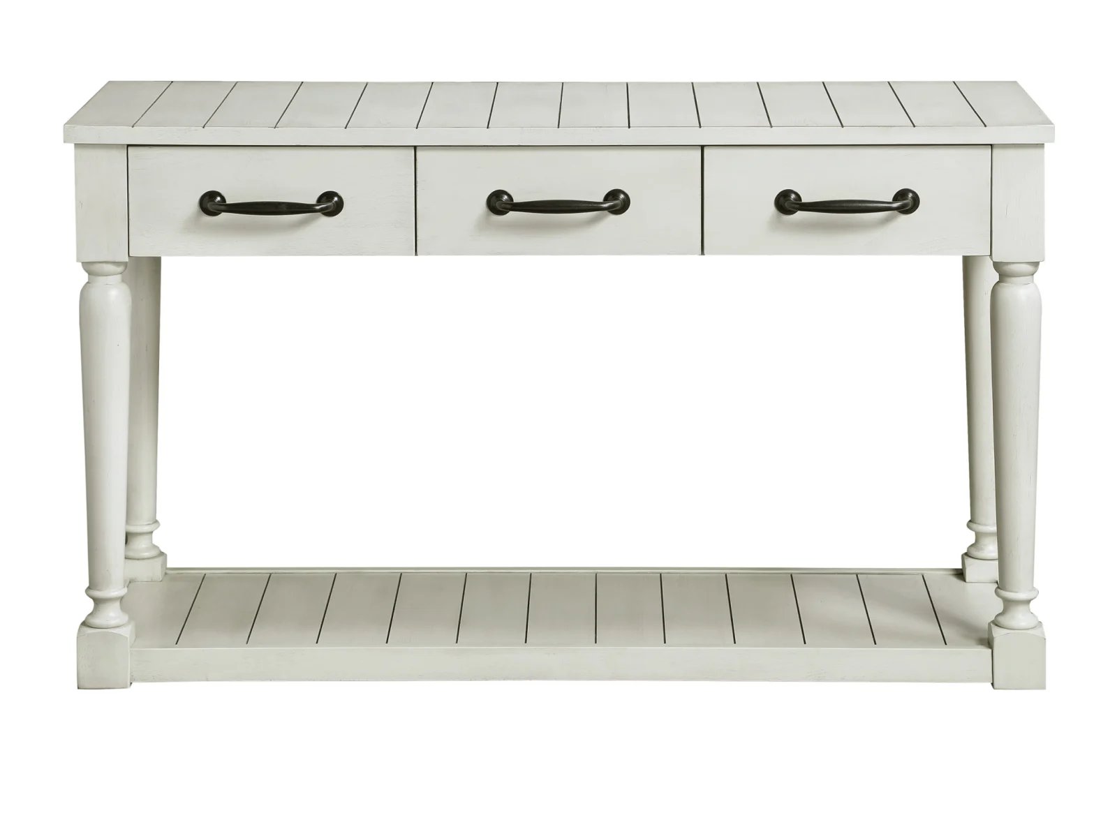 & Free ShippingCottage styling in a Sofa Table that fits in any casual environment. The Hinkel Sofa Table features plank top and plank base with turned legs and alabaster finish for hust the right farmhouse feel for today’s casual environments. The ebony metal hardware offers just the right neutral contrast to pair well with casual upholstery settings. The working drawers offer a place for convenient storage. Pair the Sofa Table with the other tables in the Hinkel collection or use alone as a Hallway Console, at the back of a Sofa or as an Entertainment Unit.