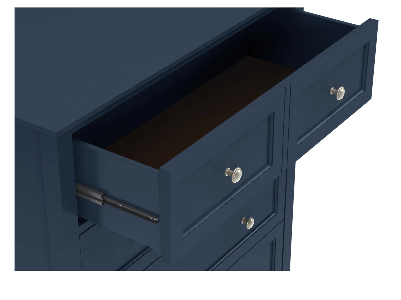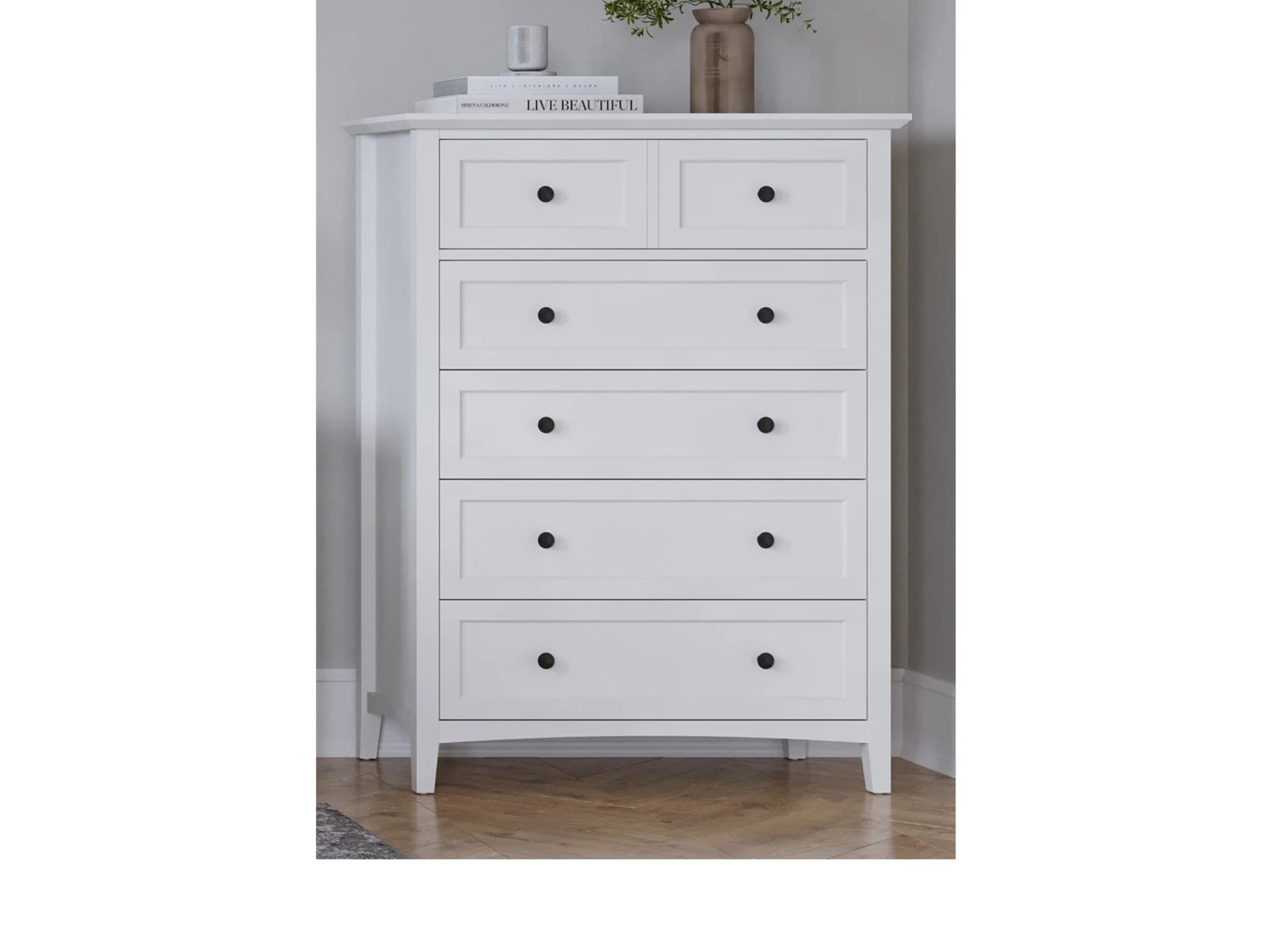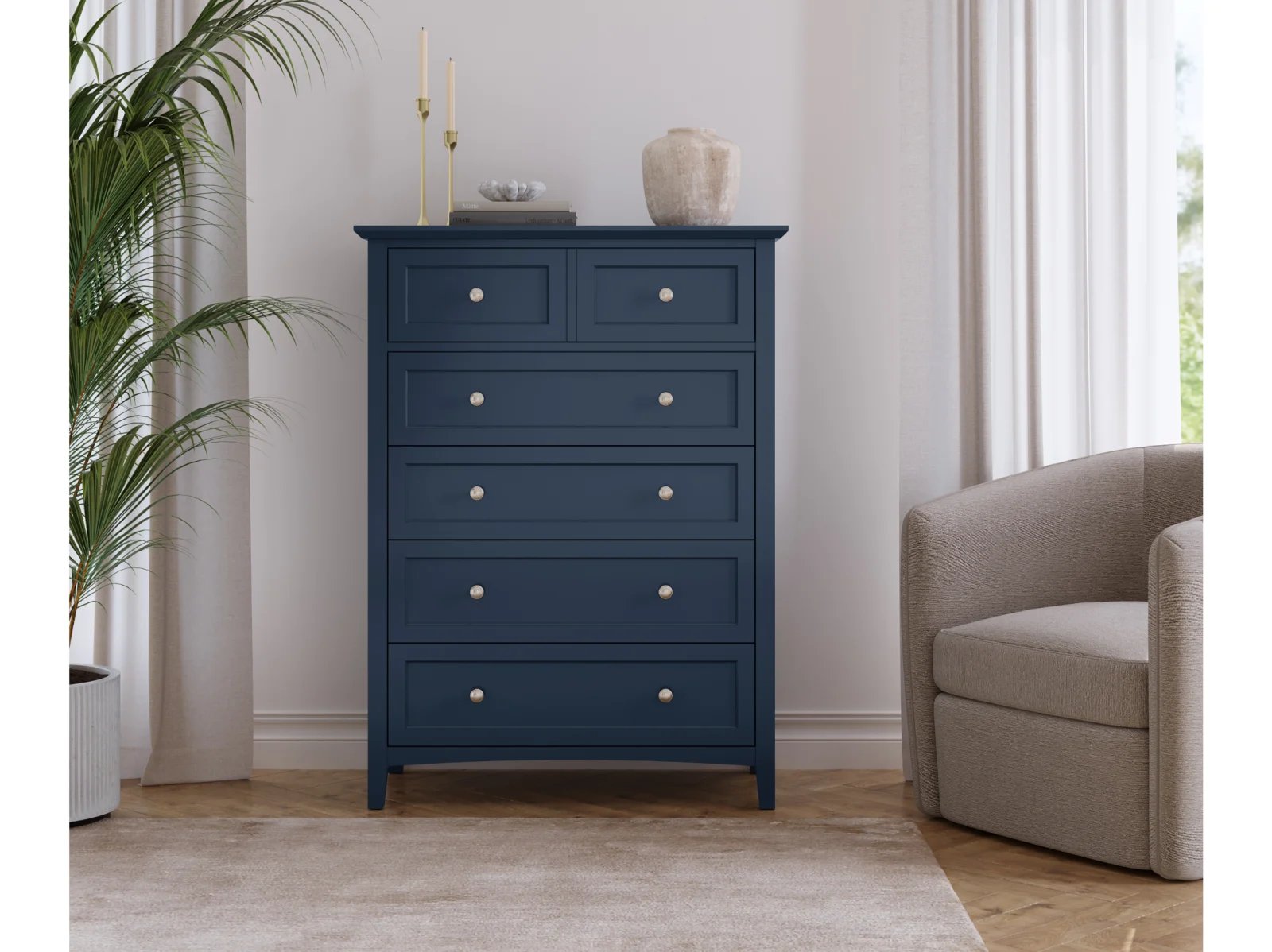 Maximize storage without sacrificing style with the Hollie Chest. This Shaker-style chest of drawers features clean lines and six spacious drawers to keep your belongings neatly tucked away. Available in white, gray, blue, or black finishes, its classic design is enhanced by tapered legs and brushed nickel hardware for a polished look that suits farmhouse to contemporary interiors alike.