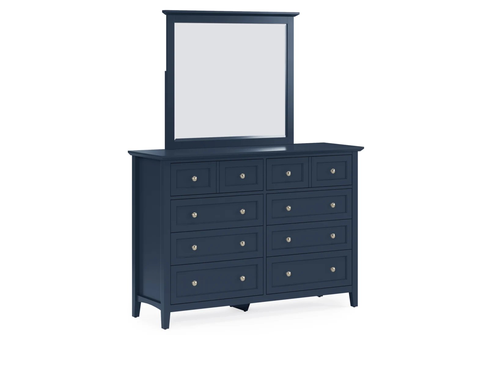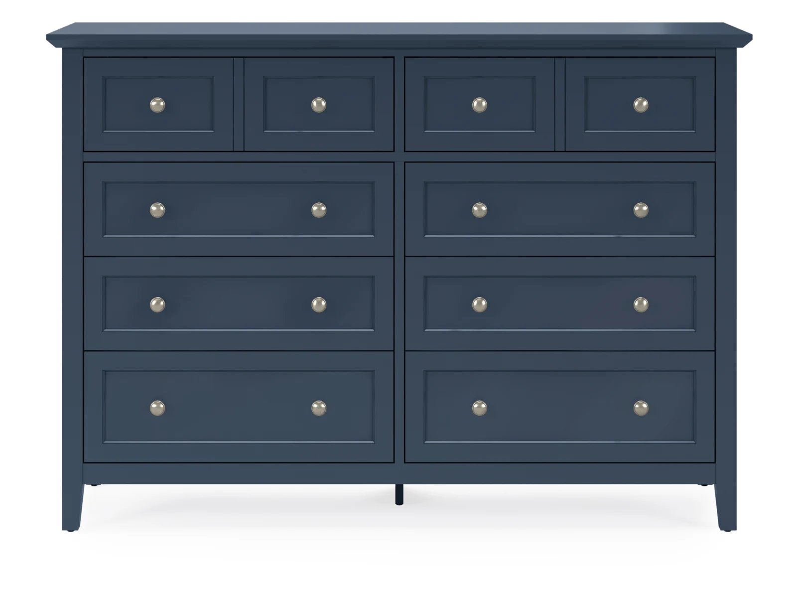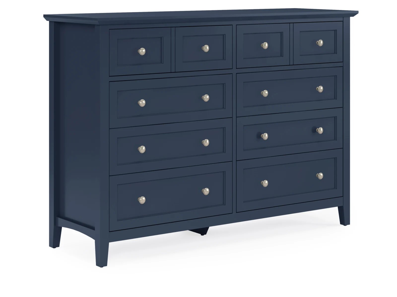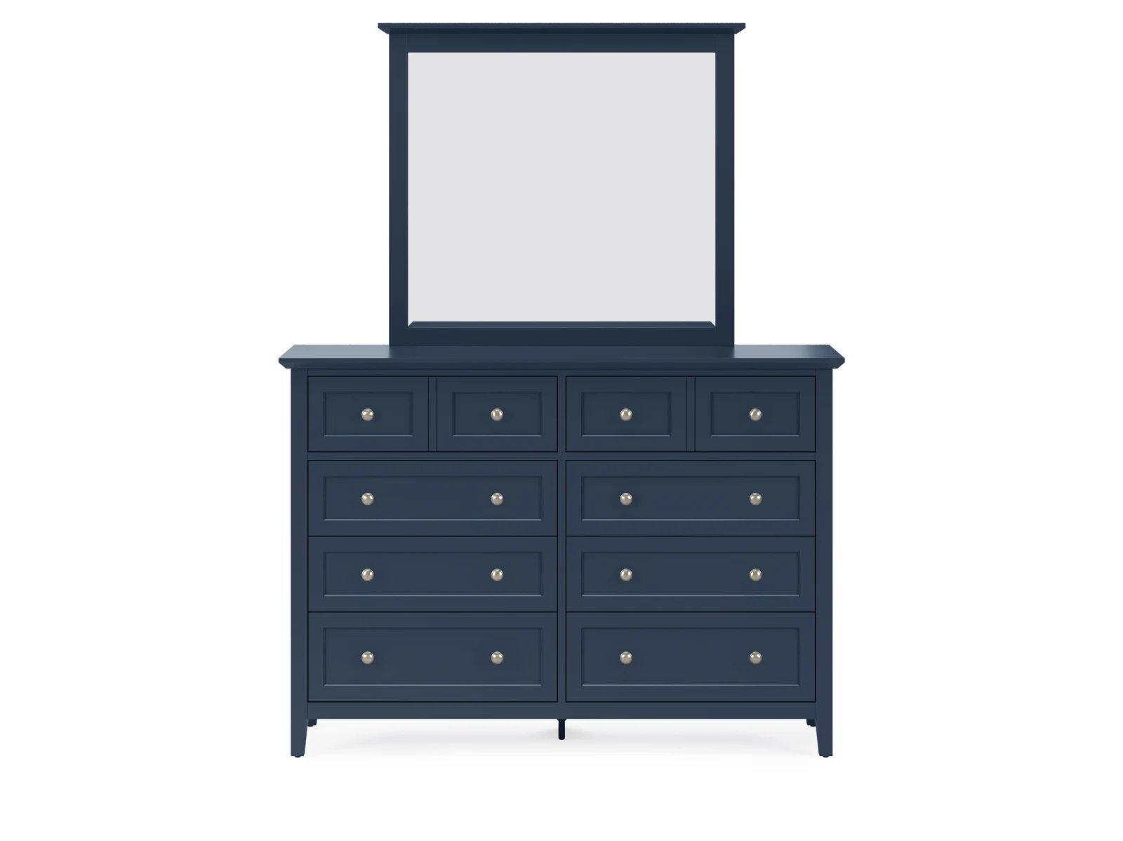 Stay organized in style with the Hollie Dresser, a shaker-inspired design featuring 10 spacious drawers for all your storage needs. With its crisp lines, beveled floating top, and brushed nickel hardware, this dresser blends seamlessly into modern, farmhouse, coastal, or transitional decor. Available in four stunning finishes—white, gray, blue, and black—it’s the perfect combination of function and timeless elegance for your bedroom.