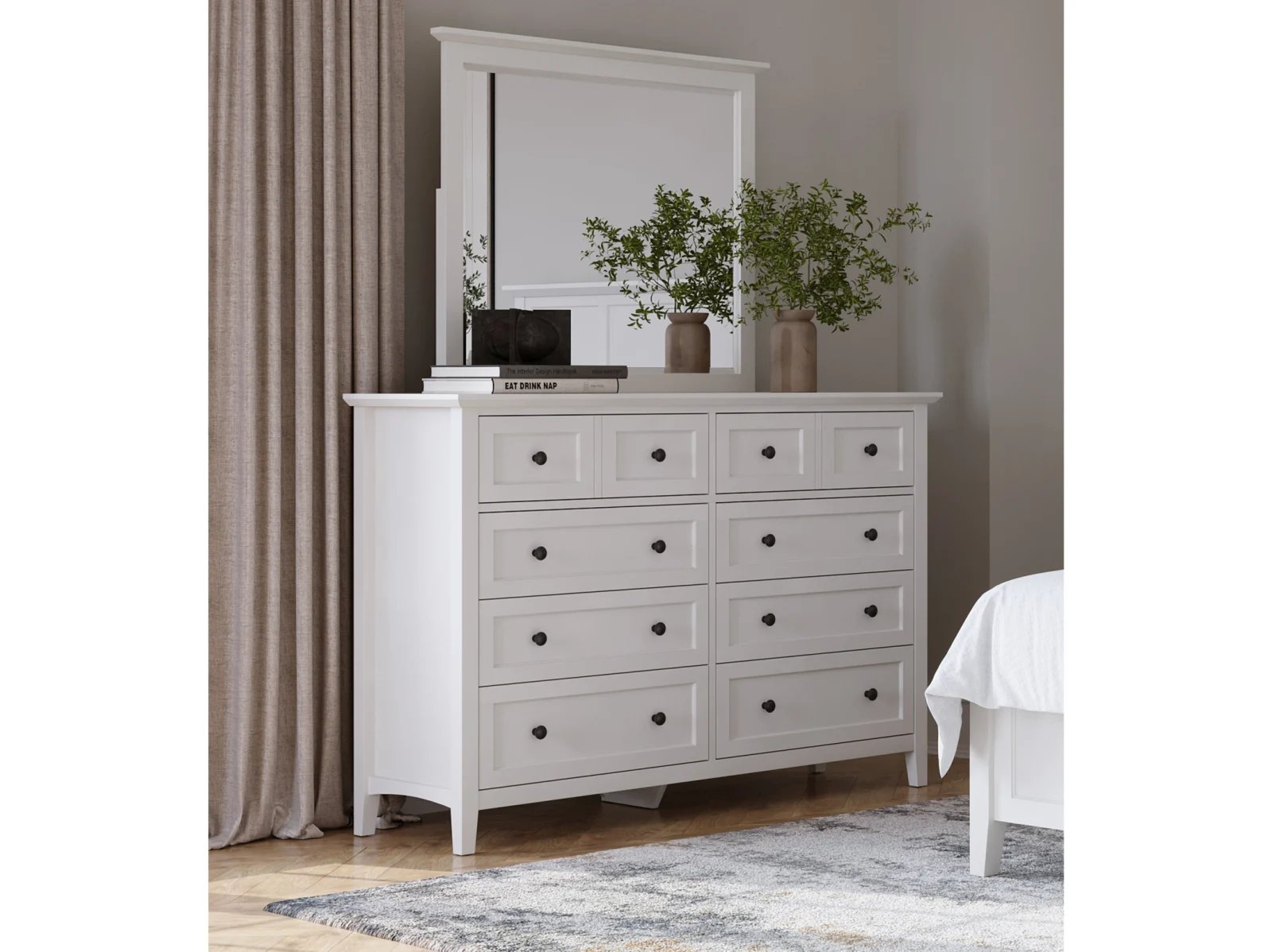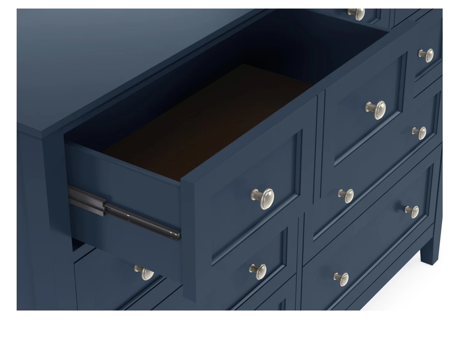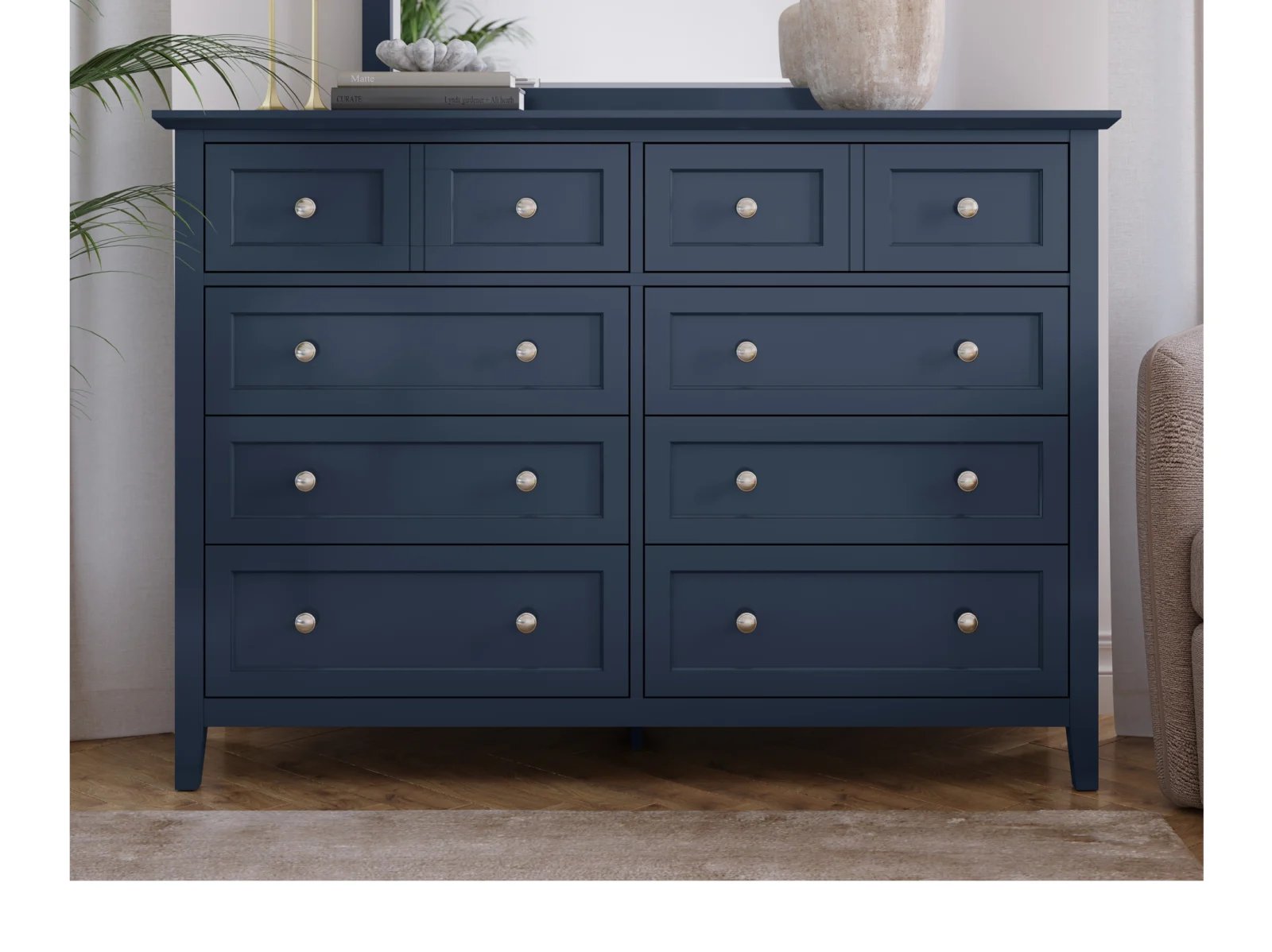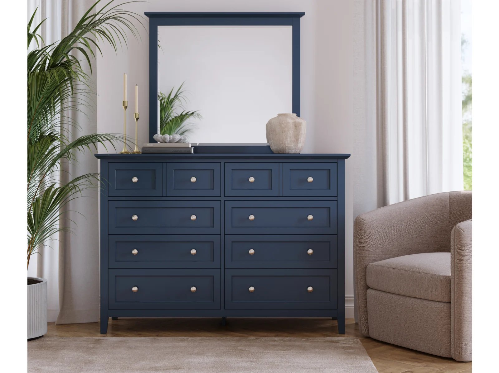 Stay organized in style with the Hollie Dresser, a shaker-inspired design featuring 10 spacious drawers for all your storage needs. With its crisp lines, beveled floating top, and brushed nickel hardware, this dresser blends seamlessly into modern, farmhouse, coastal, or transitional decor. Available in four stunning finishes—white, gray, blue, and black—it’s the perfect combination of function and timeless elegance for your bedroom.