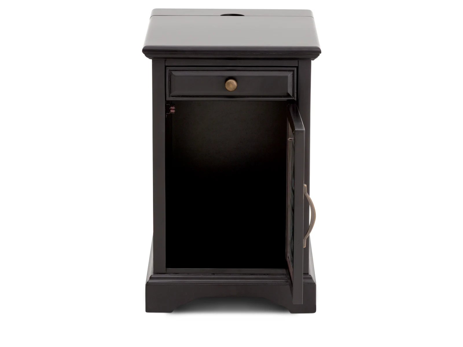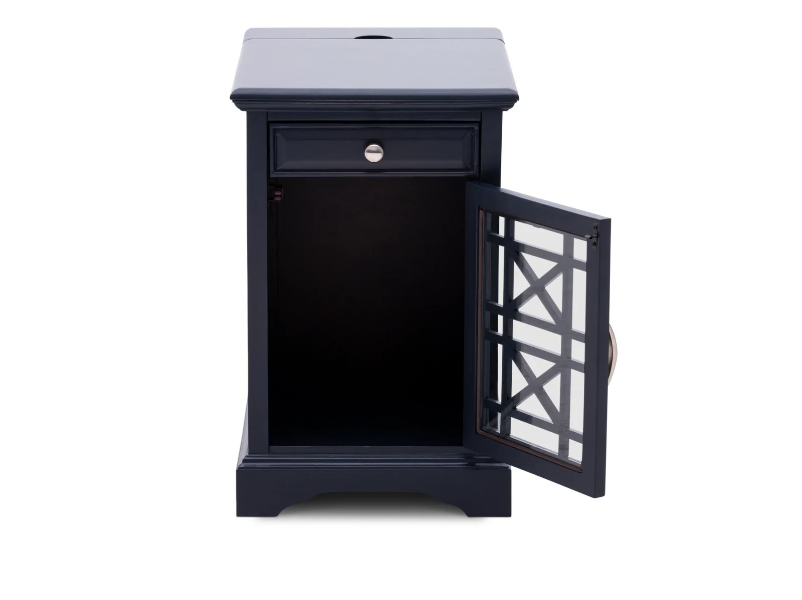 The Holmes Power Chairside End Table is as useful as it is beautiful. This charming end table looks incredible with a carefully aged paint finish, cabinet door fretwork atop tempered glass, and antique metal hardware, but it’s the hidden charger and easy storage that makes the Holmes a real treasure. Charge your tablet and plug in a lamp without having the tangle of cords with the Holmes’s power unit which includes two outlets and two USB ports. Available with an antique black, creamy white, weathered blue, navy blue, or lakehouse gray finish. The power cord length 114”. The Holmes Power Chairside End Table is the convenient furnishing you’ve been searching for.