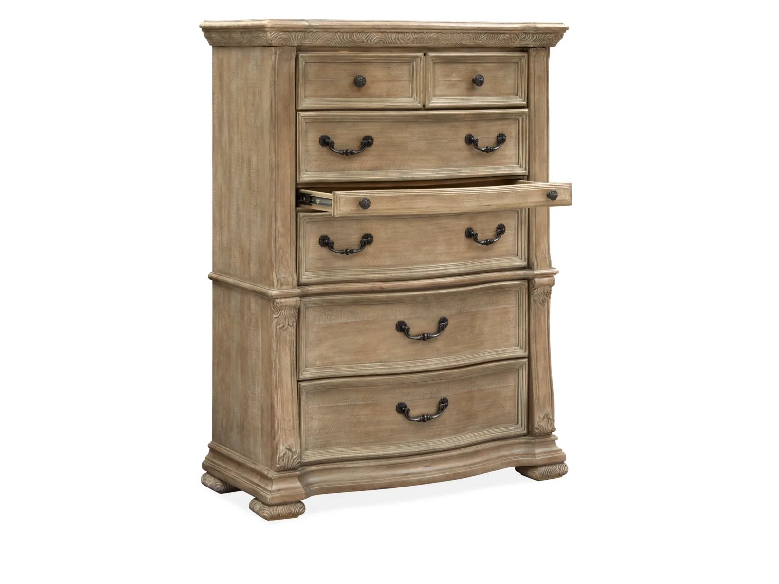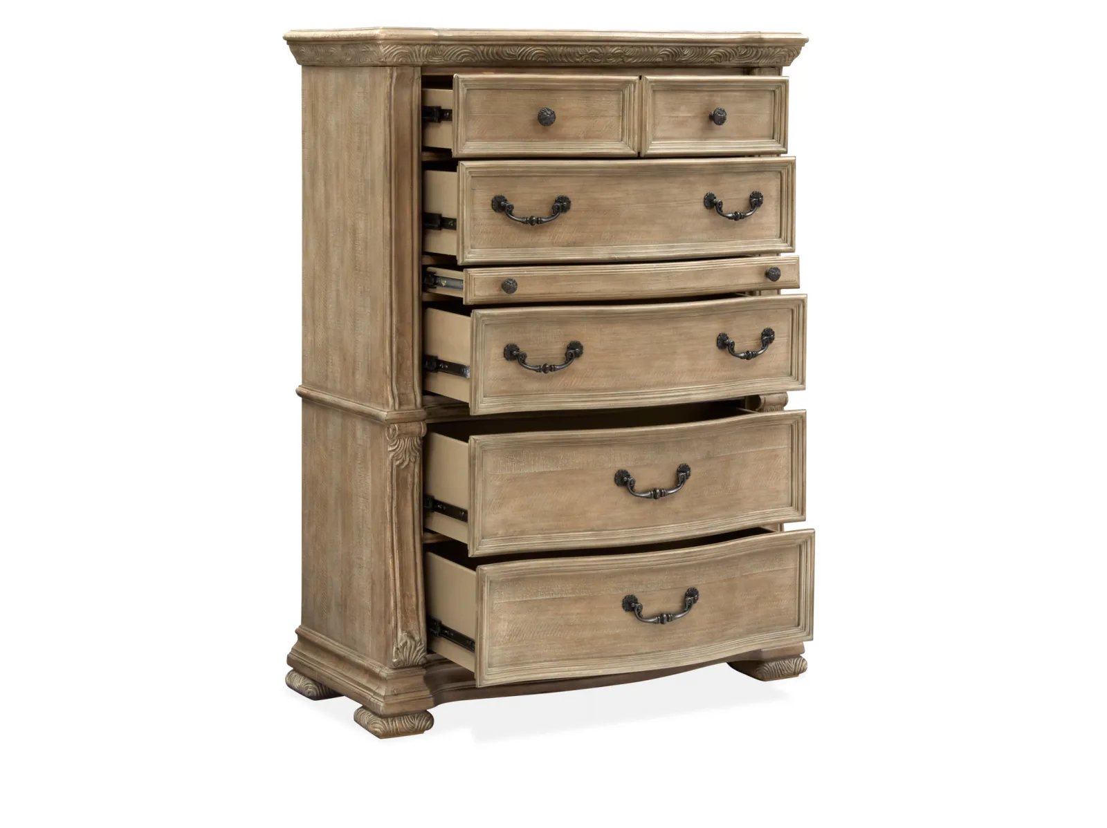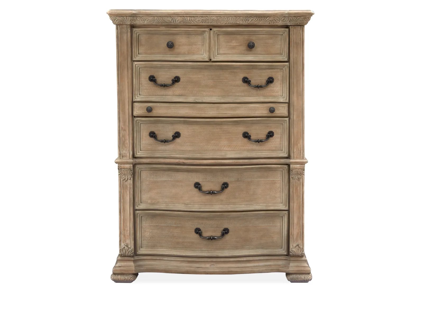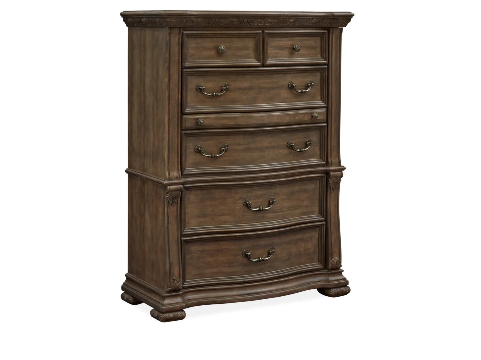 Traditional by nature, the handsome Huntington Drawer Chest imparts fresh allure to a classically inspired design aesthetic. Rooted in old world styling, these timeless silhouettes feature intricate carvings, fluted pilasters and ornate scrollwork insets. Antique Brass or Graphite hardware gives the room a warm metallic element while providing the perfect complement to Huntington’s gorgeous Willadeene Brown or Fawn finish. If you’re an admirer of traditional styling, the Huntington Drawer Chest is a must-have.