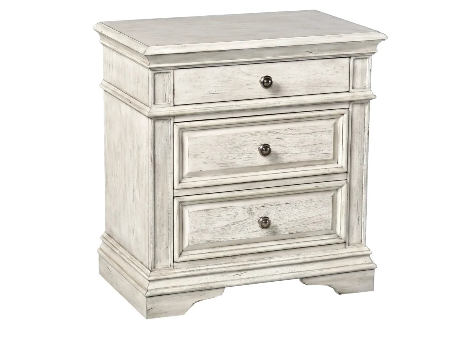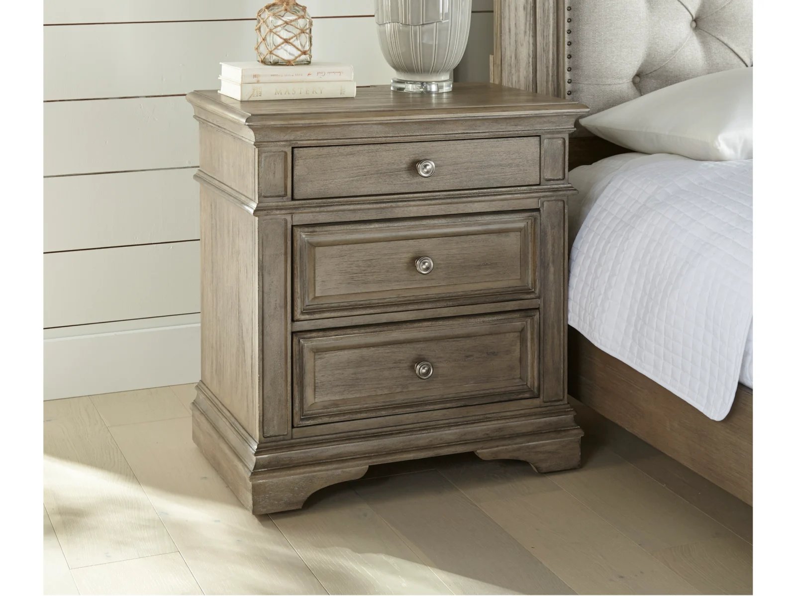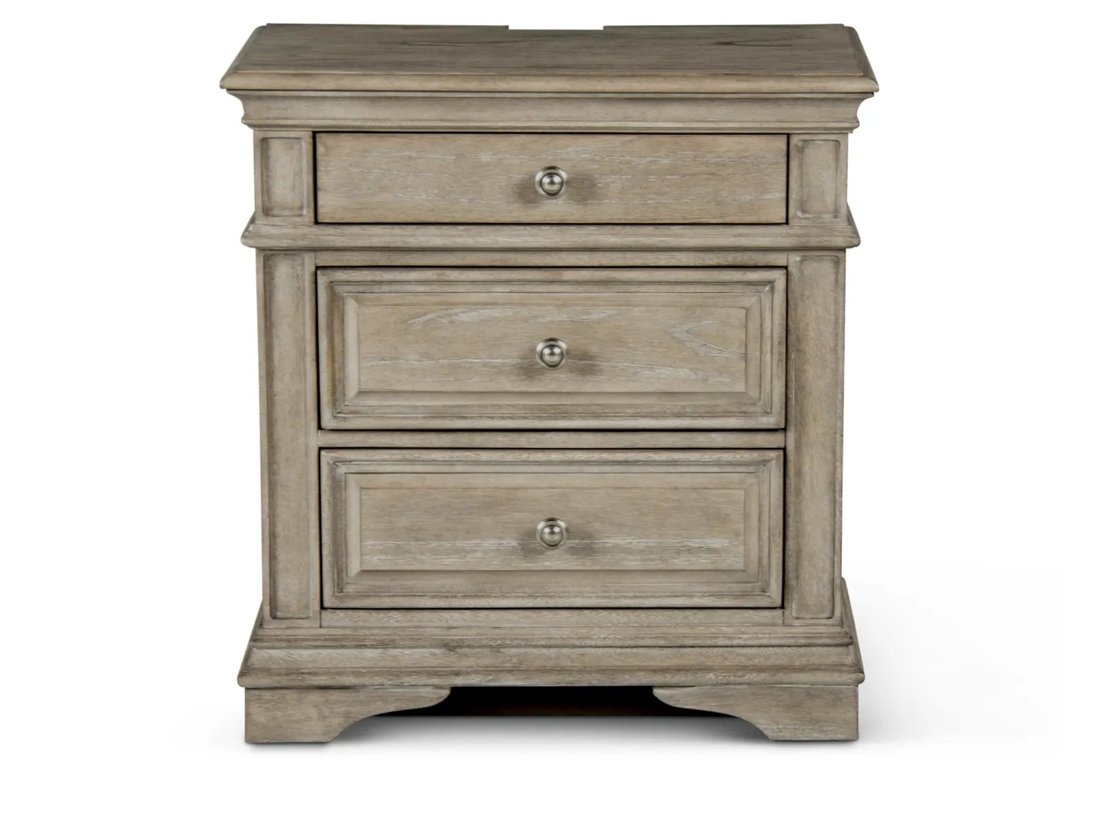 & Free ShippingThe Hylia Nightstand comes packed with impressive features; a lustrous Driftwood finish, nickel hardware and substantial wraparound modding on base, top and between drawers. The vintaged styling elegance balances the Intricate details in a package that leans toward a farmhouse inspiration. But there is nothing retro about the built-in function of this piece: a ;built-in charging station ensures all your gadgets stay charged with two outlets and 2 USB chargers, freeing up valuable bedroom outlets. Dual drawers offer great bedside storage options and help complete your bedroom in a stylish configuration.