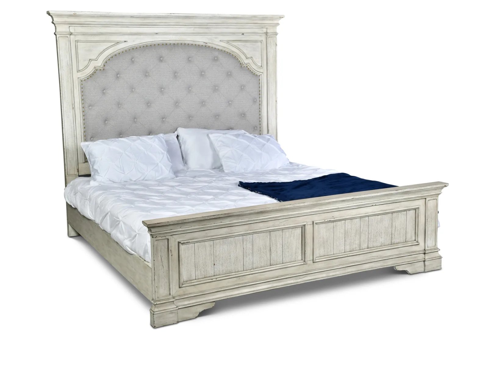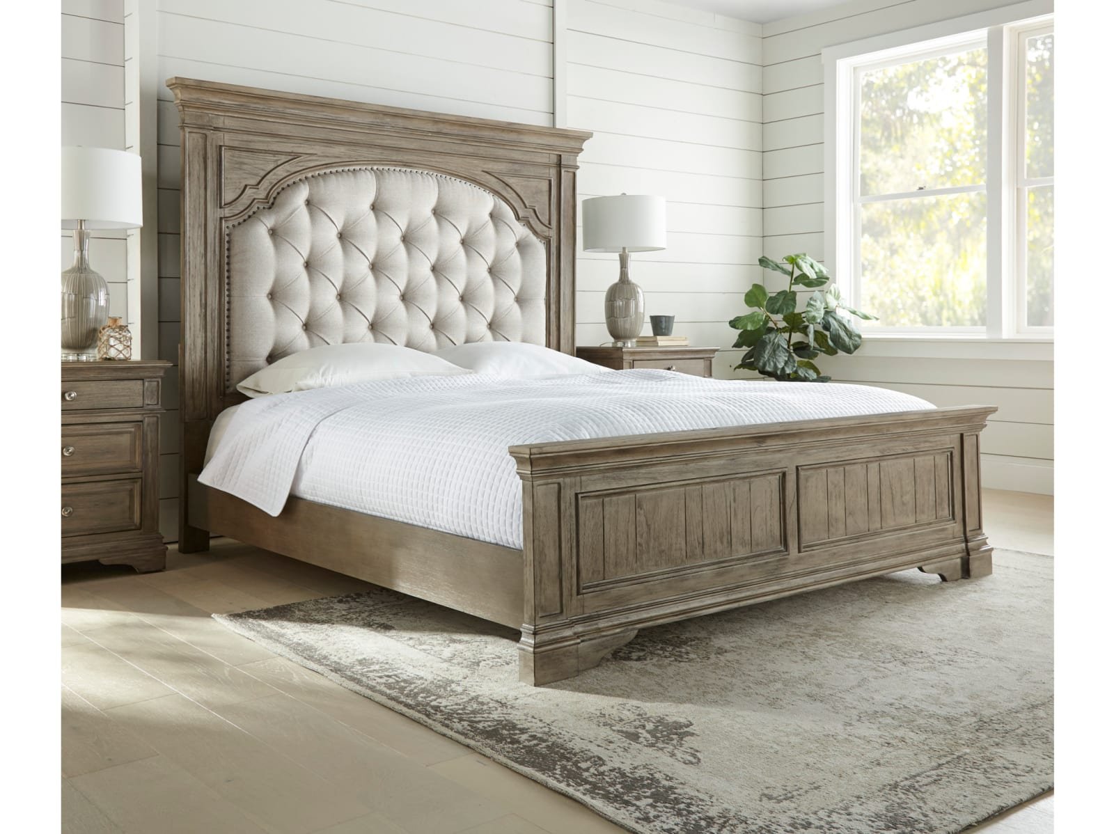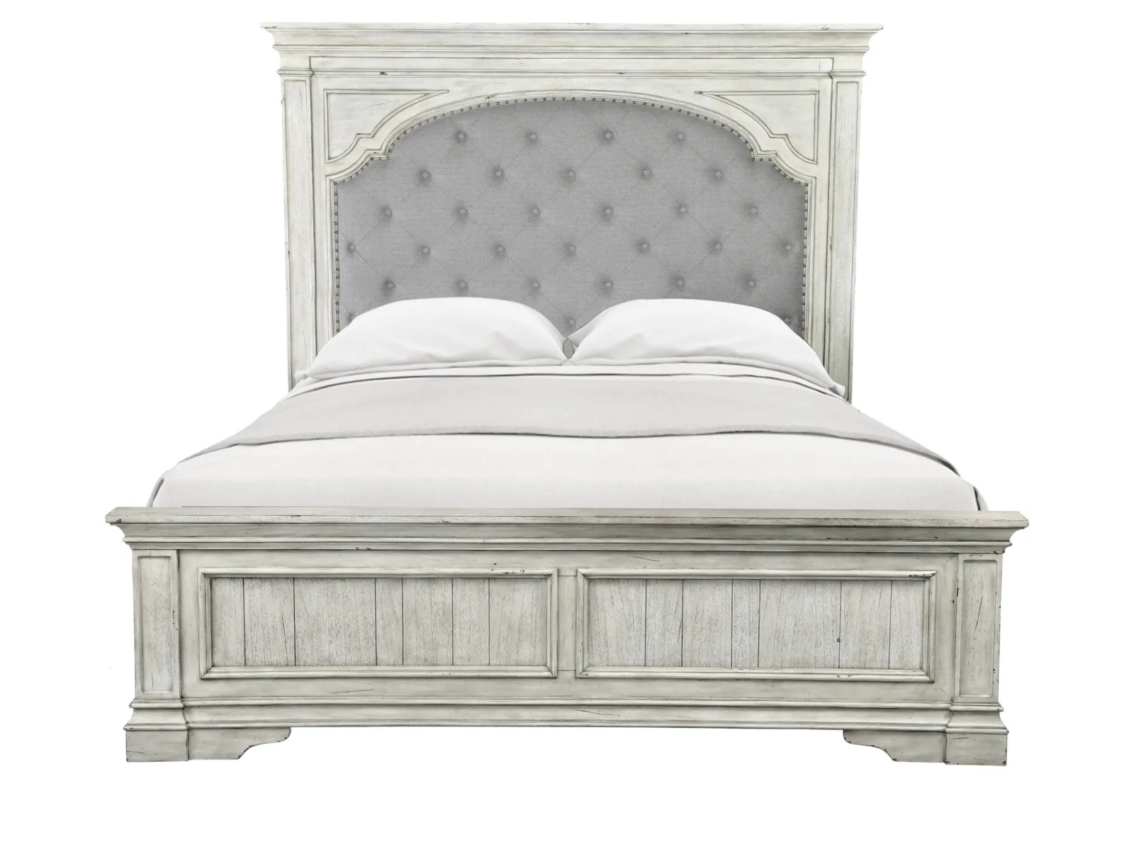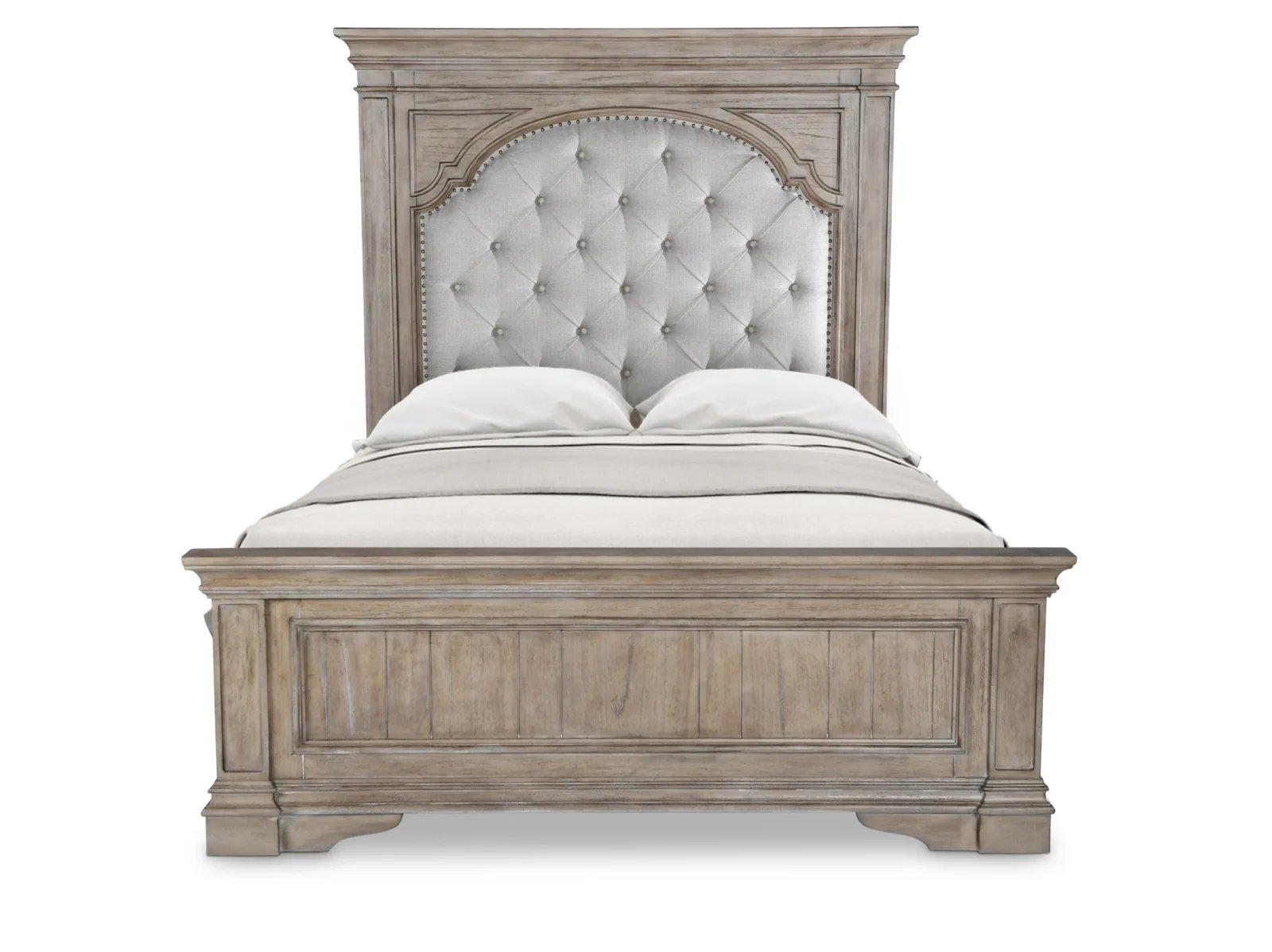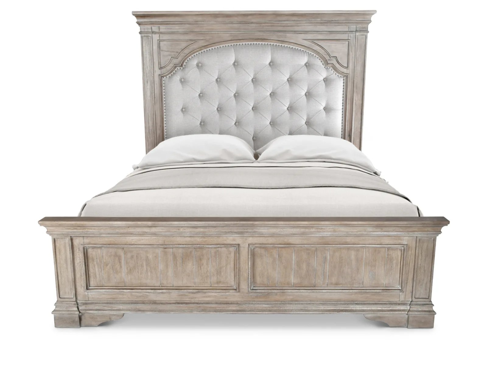 & Free ShippingHylia features vintage styling in a classical bedroom collection. Sturdy construction using hardwood solids and veneers in a multi-step waxed driftwood finish with the perfect amount of distressing. The Panel bed is highlighted by a tall panel headboard and low footboard accented with heavy crown molding and elegant pilasters. A gorgeous shaped cream grey fabric inset in the headboard features button tufting and antique brass nail head trim. Requires a mattress and boxspring – sold separately.