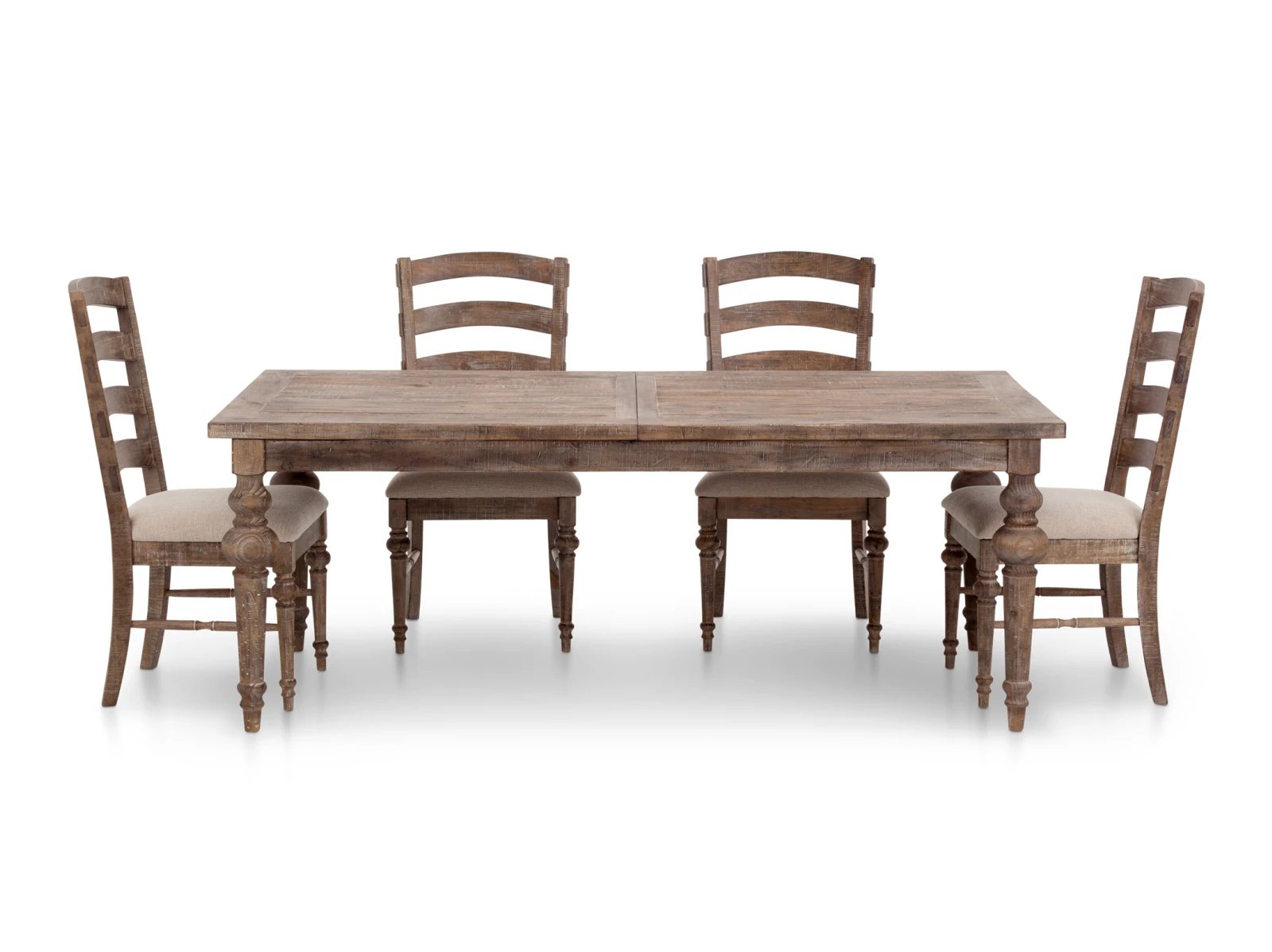 The Interlude 5 Pc. Rectangle Dining Room Set combines the rustic feel of reclaimed wood with the timeless elegance of farmhouse design. Made with reclaimed solid pine and American ash with pine veneers, the Interlude collection boasts a natural, hand-rubbed sandstone finish and each piece showcases elegantly turned legs to capture the set’s quintessential traditional look. This set is complete with four ladder back side chairs with comfy upholstered seats, and the dining table even expands to accommodate guests with its cable-driven butterfly leaf extension system. Take home this beautiful dining set today.