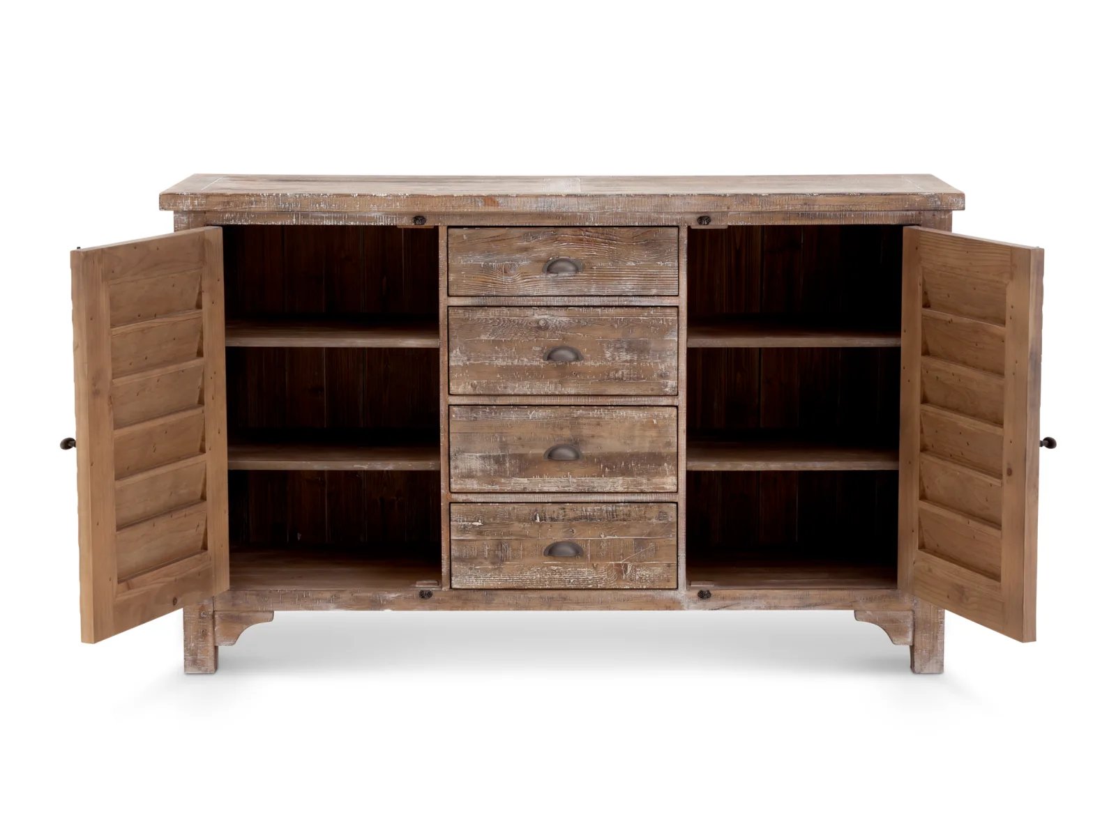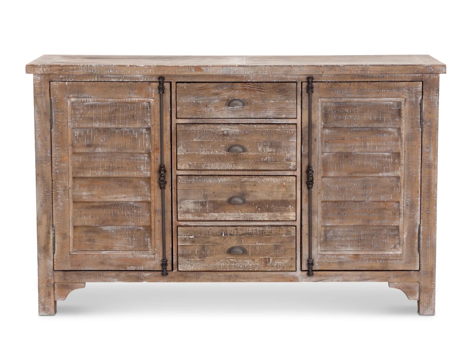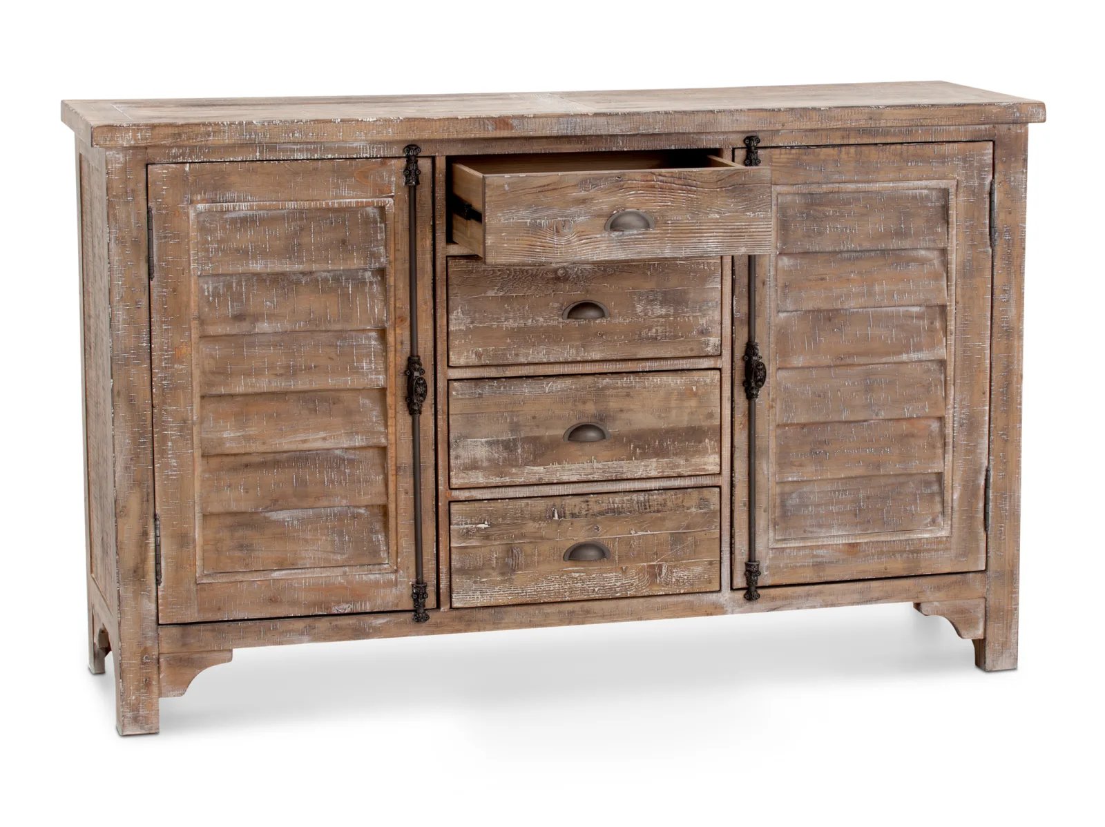 & Free ShippingThe Interlude Server combines the rustic feel of reclaimed woods with sophisticated styling for a country casual look. Made with reclaimed solid pine and American ash with pine veneers, the Interlude boasts a natural, hand-rubbed sandstone finish that completes the presentation, while metal hardware and beautiful bar handles add an elegant touch. For the perfect accent, the Interlude features beautifully turned table legs for visual and structural appeal. Featuring door and drawer storage for all your dishes and utensils, the Interlude is ready to make entertaining guests a breeze. Take home this beautiful server today.
