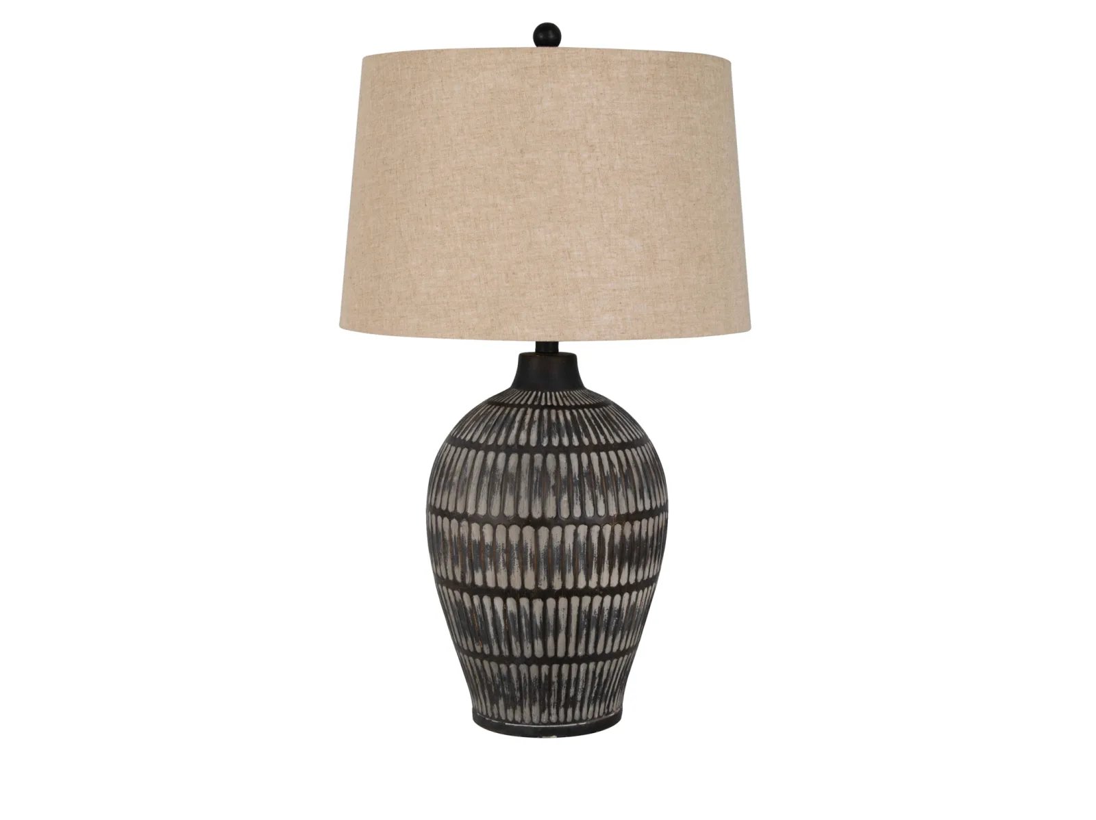 & Free ShippingThe Izar Table Lamp is a stunning home accent that combines style and functionality for your home. Its rounded polyresin base showcases a textured gray and neutral finish, creating a sophisticated, versatile look that complements various interior styles. Topped with a round shade in natural linen, this lamp provides a warm, diffused light perfect for creating ambiance in entryways or dim corners of large spaces. With its curvaceous silhouette and substantial presence, the Izar Table Lamp is an eye-catching addition to any room.