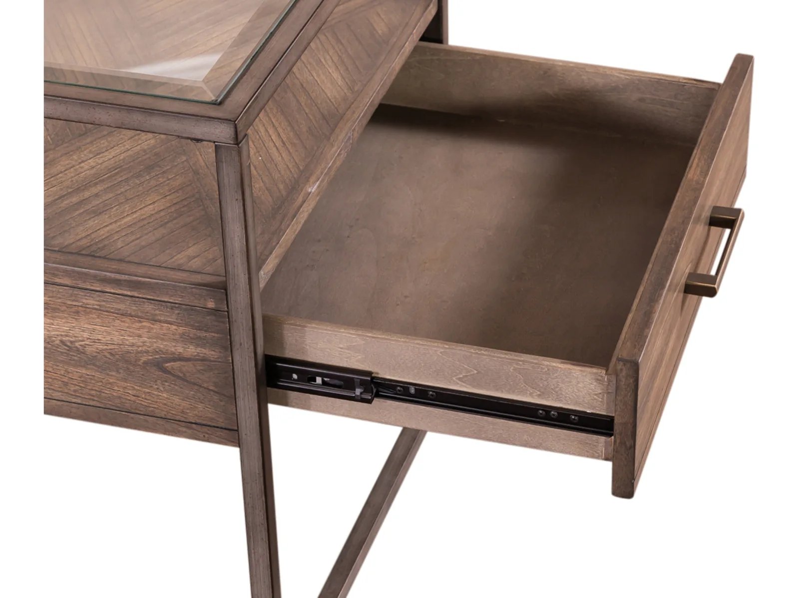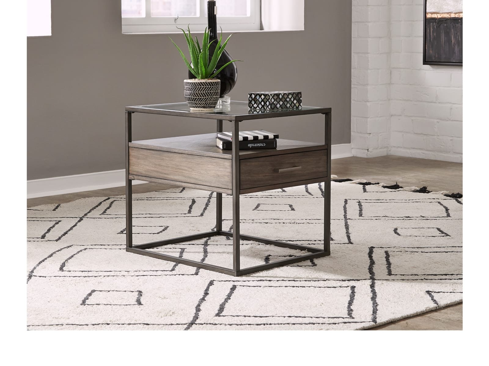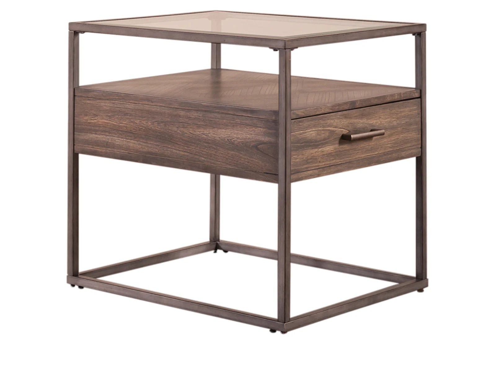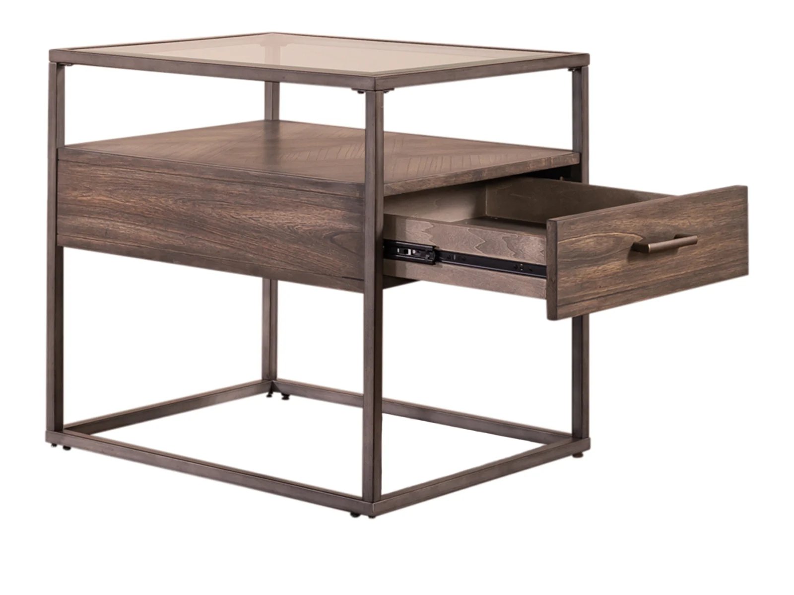& Free ShippingSimplify your urban space with the Jamacha End Table. Crafted of rubberwood solids, metal tubes and mindy veneers, this piece features a tobacco finish, one full extension drawer, an open shelf for additional storage, and an appealing beveled glass top. This modern end table would make a great addition to your contemporary space.