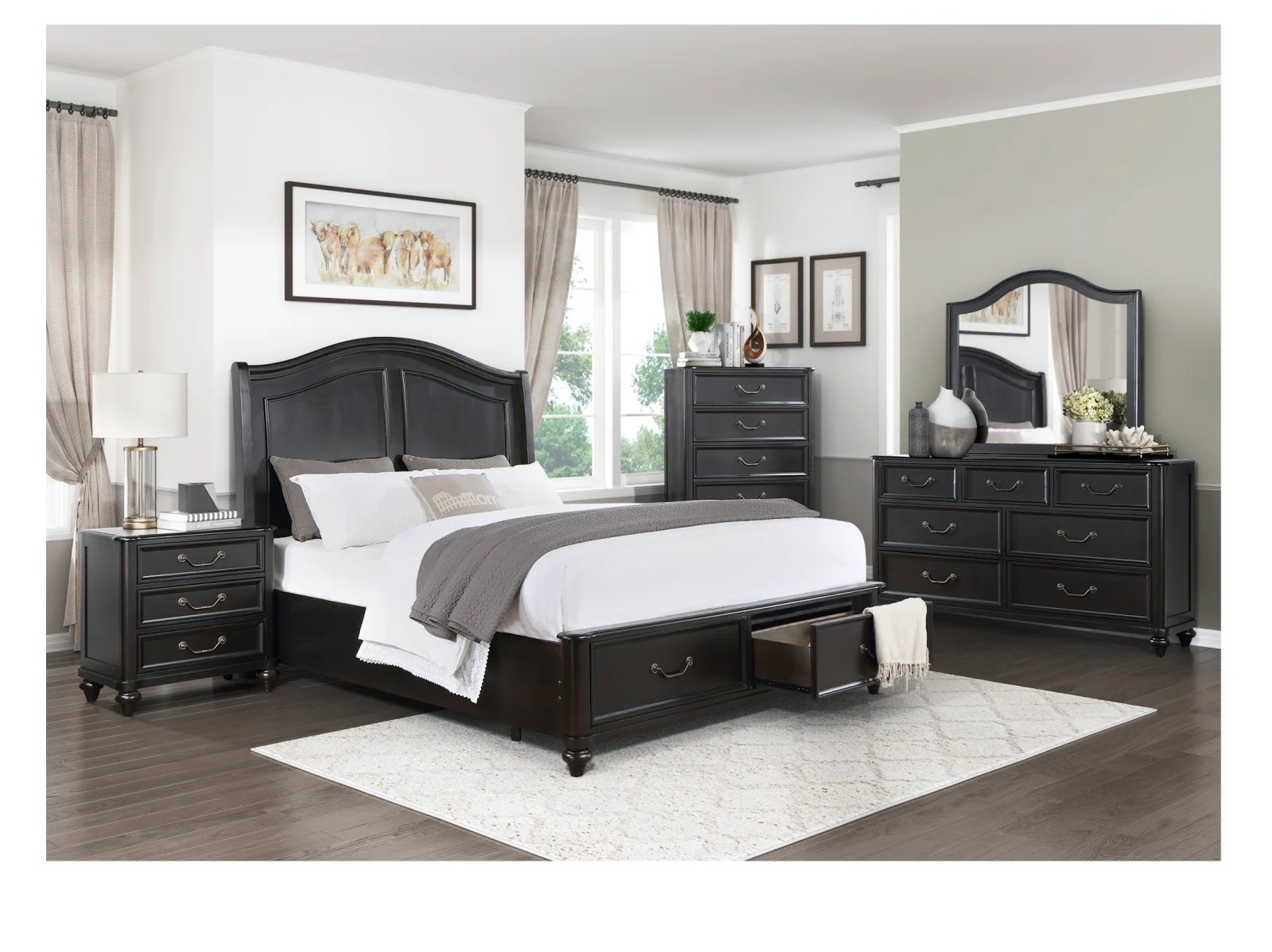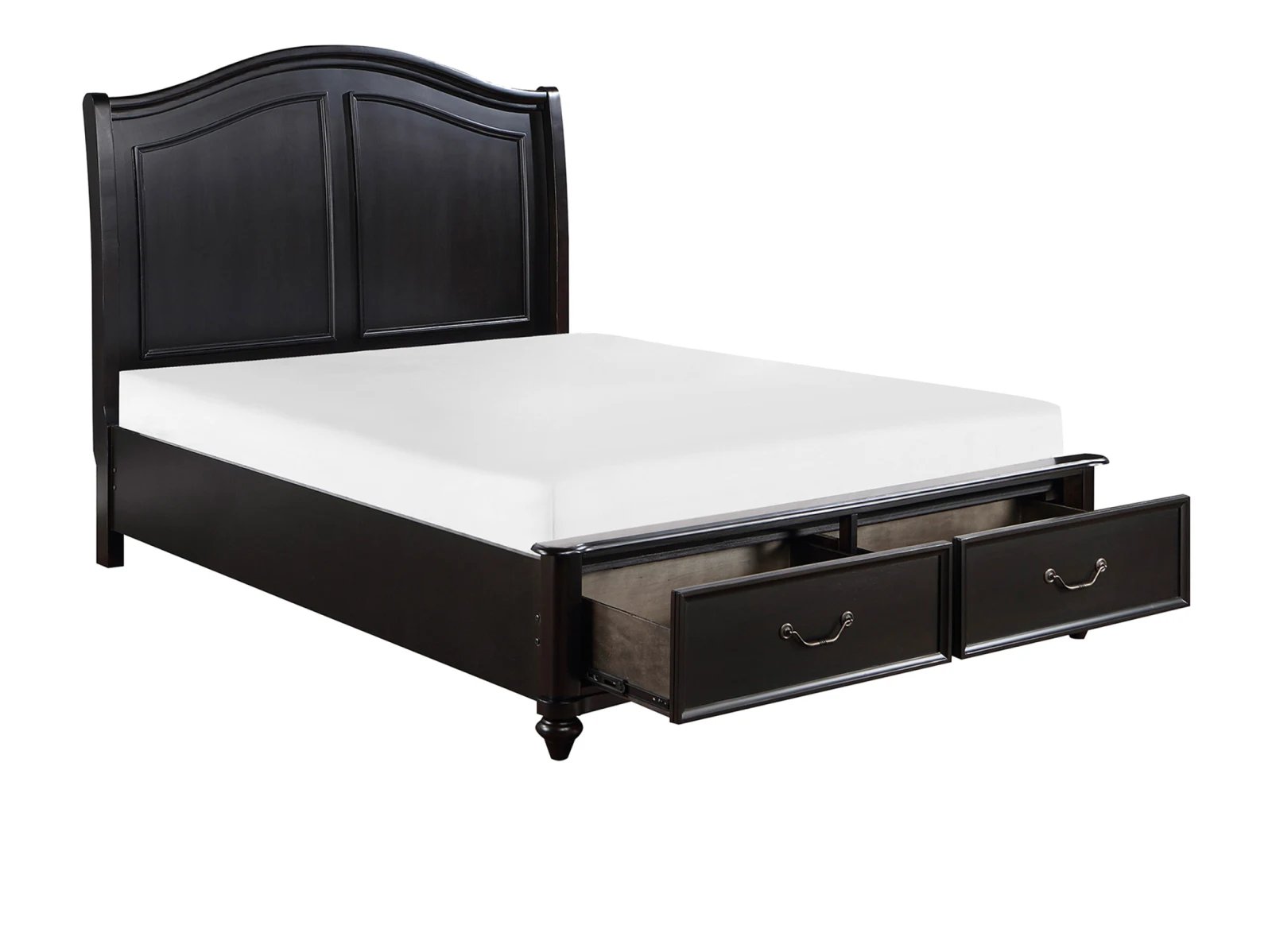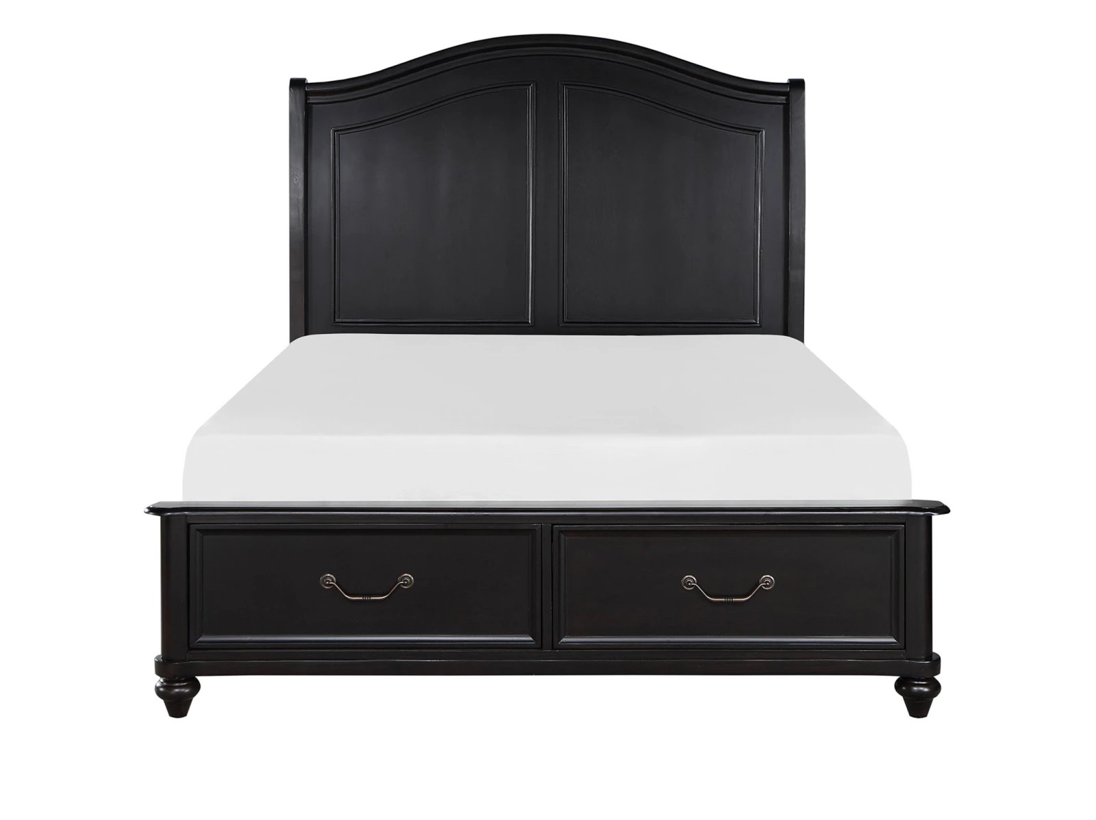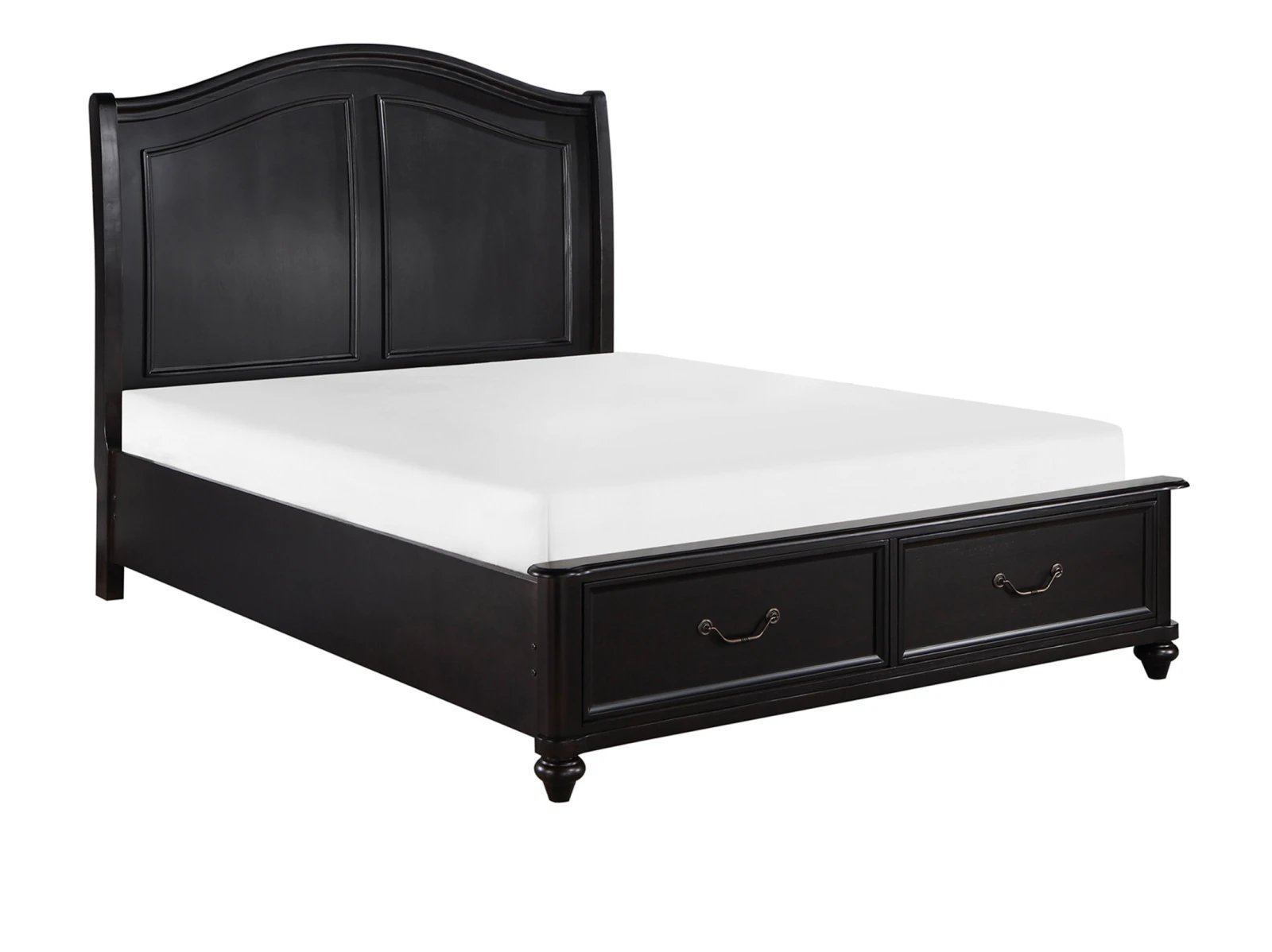 The traditional profile of the Karlock Collection is achieved with a perfect blend of classic elements that create a look that complements the style of your bedroom. Providing the additional storage that your room needs, the bed’s footboard drawers lend considerable space to achieve the task. The subtle curve of the queen headboard’s profile creates a statement of refined elegance. The solid wood construction of the collection features charcoal brown finish, over birch veneers, highlighting the beautiful wood grain. An antiqued finish lends elegant patina to the traditional hardware of the footboard’s drawer fronts. Available in queen, king and cal king sizes.