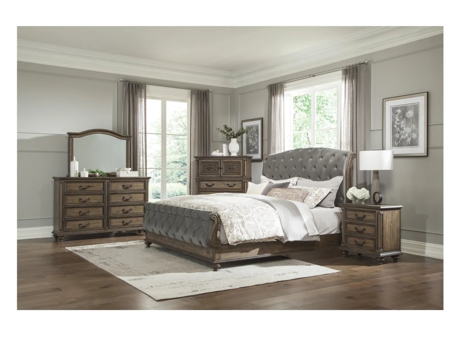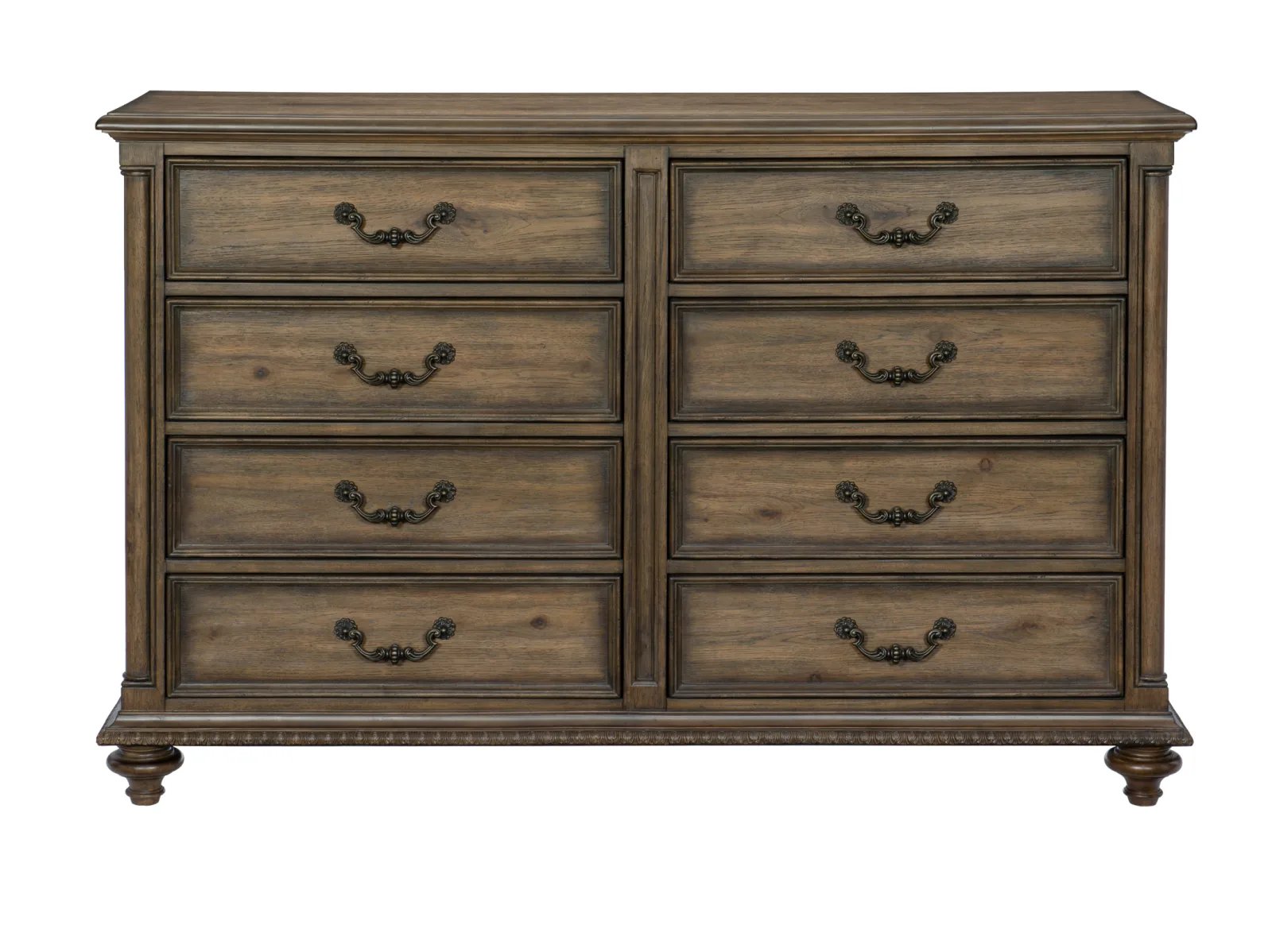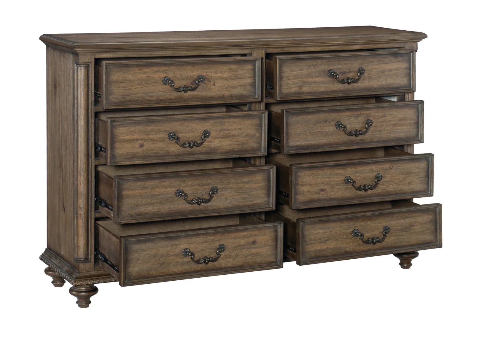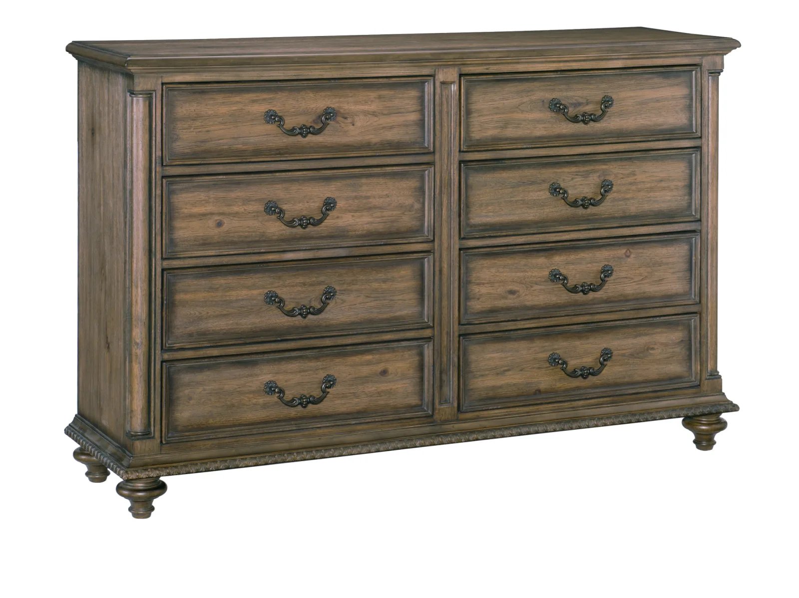 & Free ShippingThe balance of rusticated accenting and elegant form is exquisitely achieved in the design of the Kenmare Collection. The traditionally styled dresser features classic appointments such as turned feet brown-finished metal drop hardware, egg and dart molding and rounded pilasters. The knotty pecan wood veneer features a weathered pecan finish further lending to the classic look of the collection.