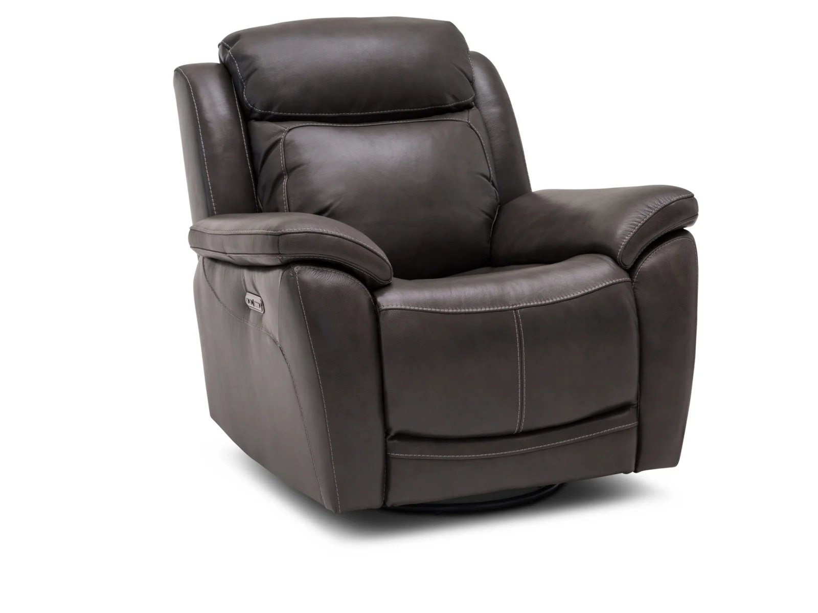 The Kinetic Leather Power Swivel Glider Recliner offers unparalleled relaxation. Supported by a hardwood-engineered frame, this roomy recliner offers a high-pub back and deep seat to provide uniquely personalized support, all adorned in foam Dacron cushioning for prolonged full-body comfort. Offering transformational triple-power adjustability, the Kinetic includes a power recline motion, a swivel base, a power headrest, and power lumbar support. Ultra-supple, top-grain leather upholstery covers all the areas in which you sit and touch and even comes in your choice of Brown or Gray to give this piece true refinement. Upgrade your space in both style and functionality with the Kinetic Power Swivel Power Glider Recliner.