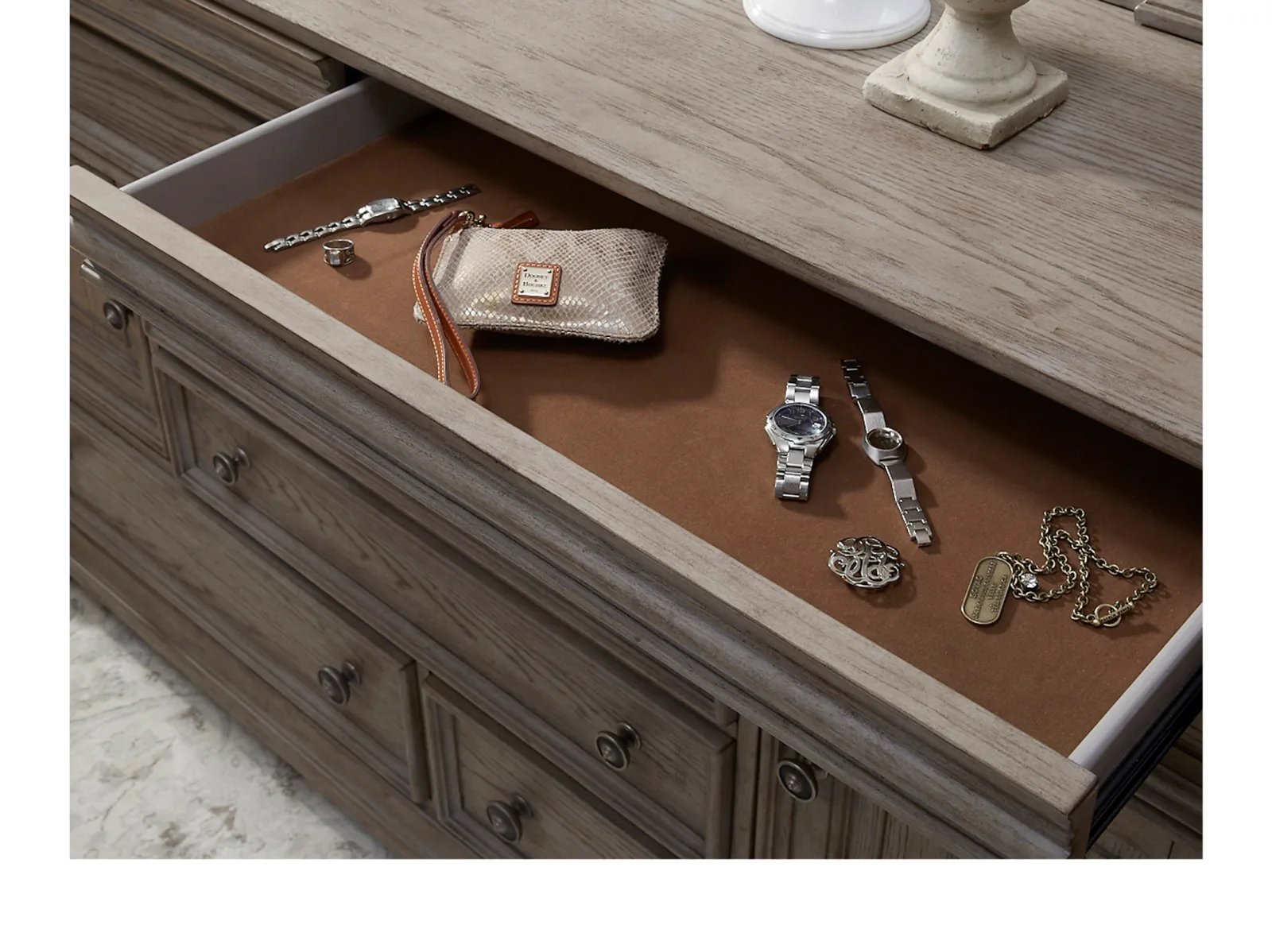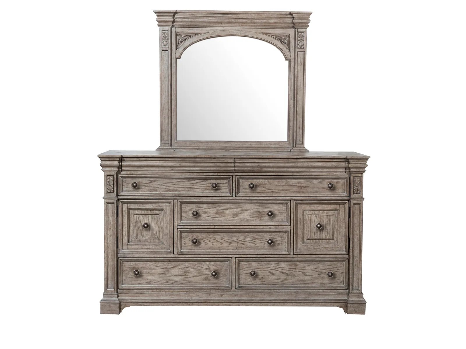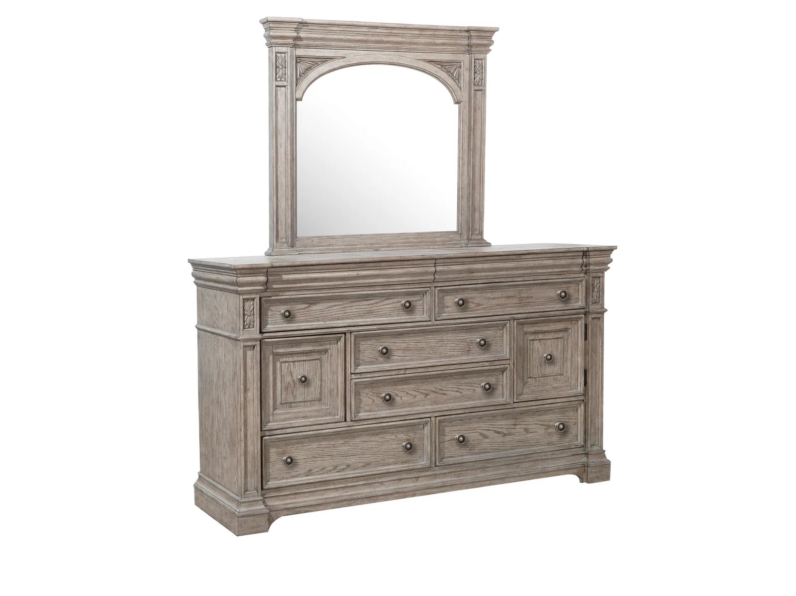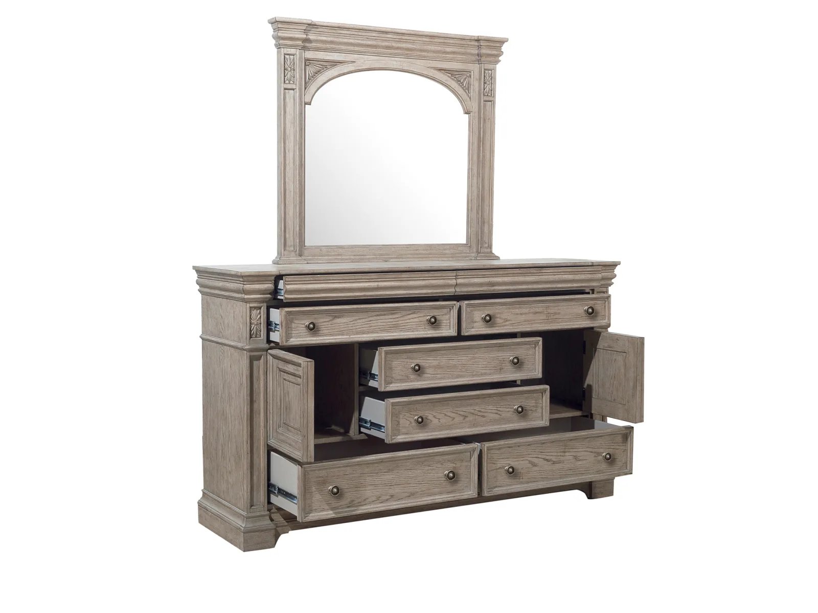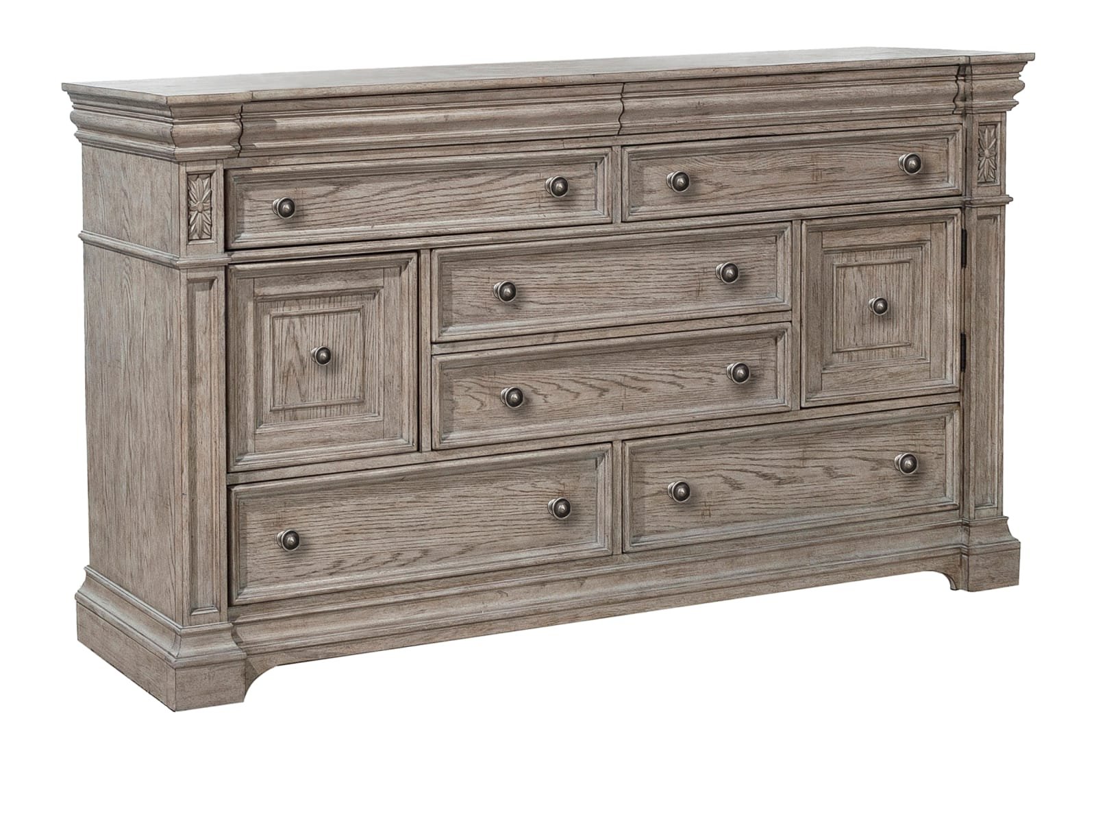 The Kingsburg Dresser brings together timeless European design, grand scale and a relaxed French Gray finish on Oak Veneers to exude casual elegance. Carved elements and prominent moldings create a bespoke yet inviting style. Featuring 8 drawers and two doors, the bottom drawers are cedar-lined, and all drawers have smoothly-operating metal ball-bearing side guides and high-quality English dovetail drawer construction. Accented by fluted knobs with a pewter finish.