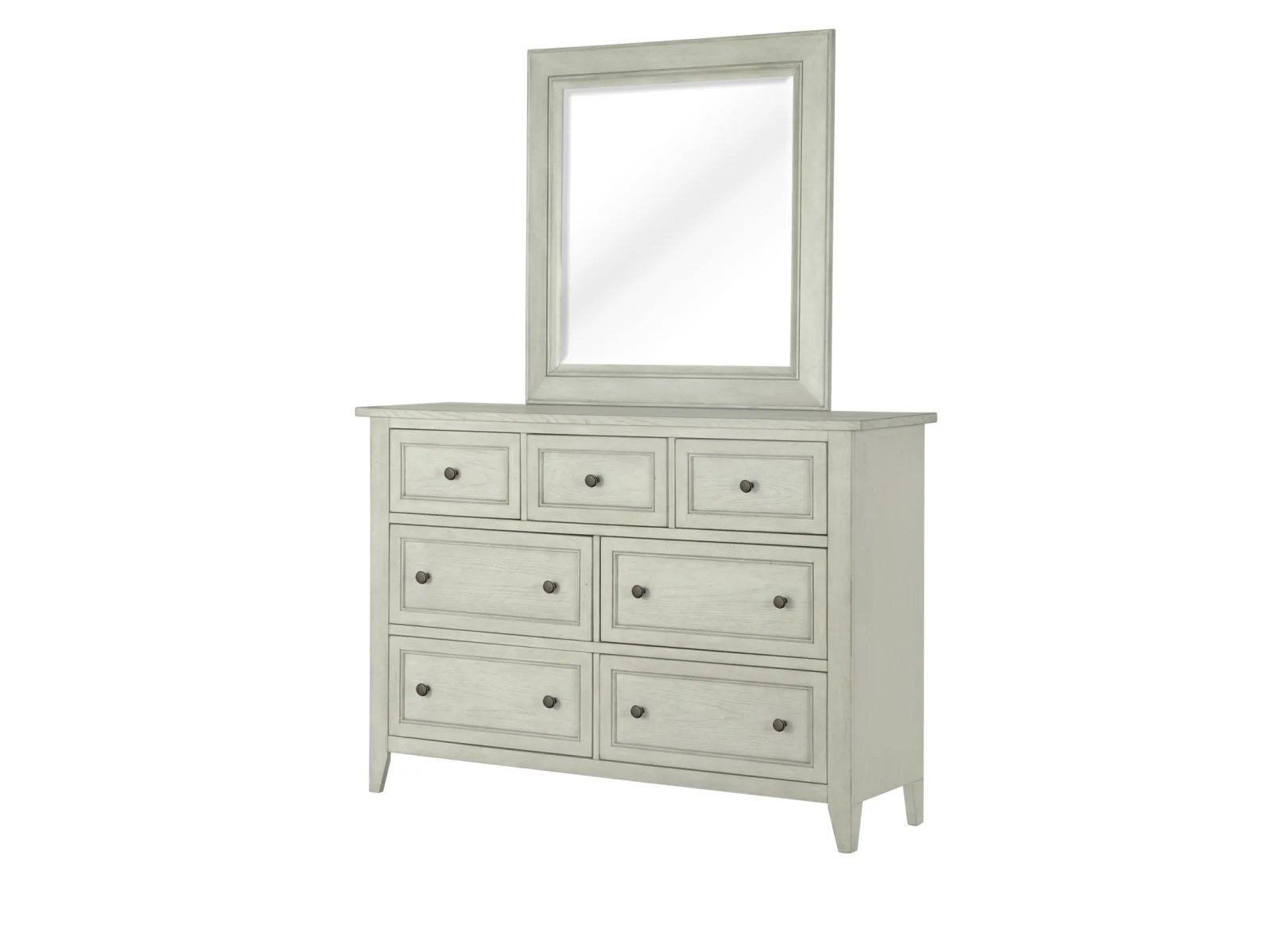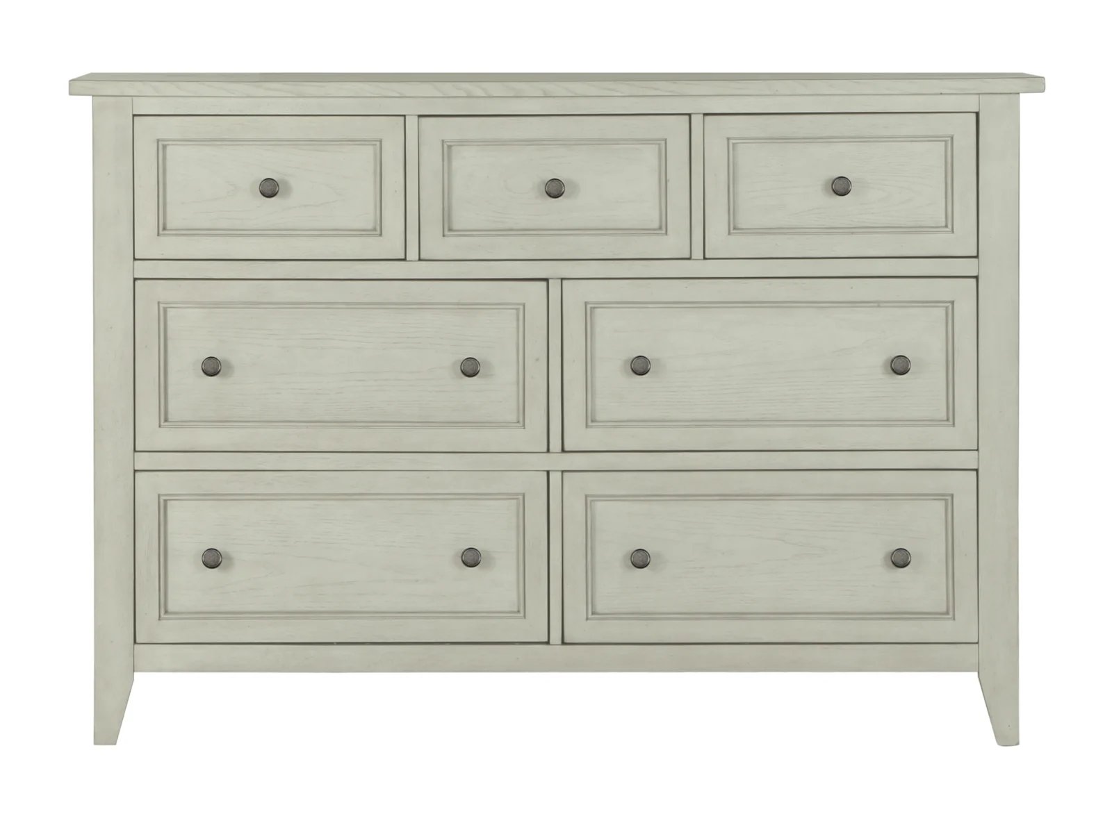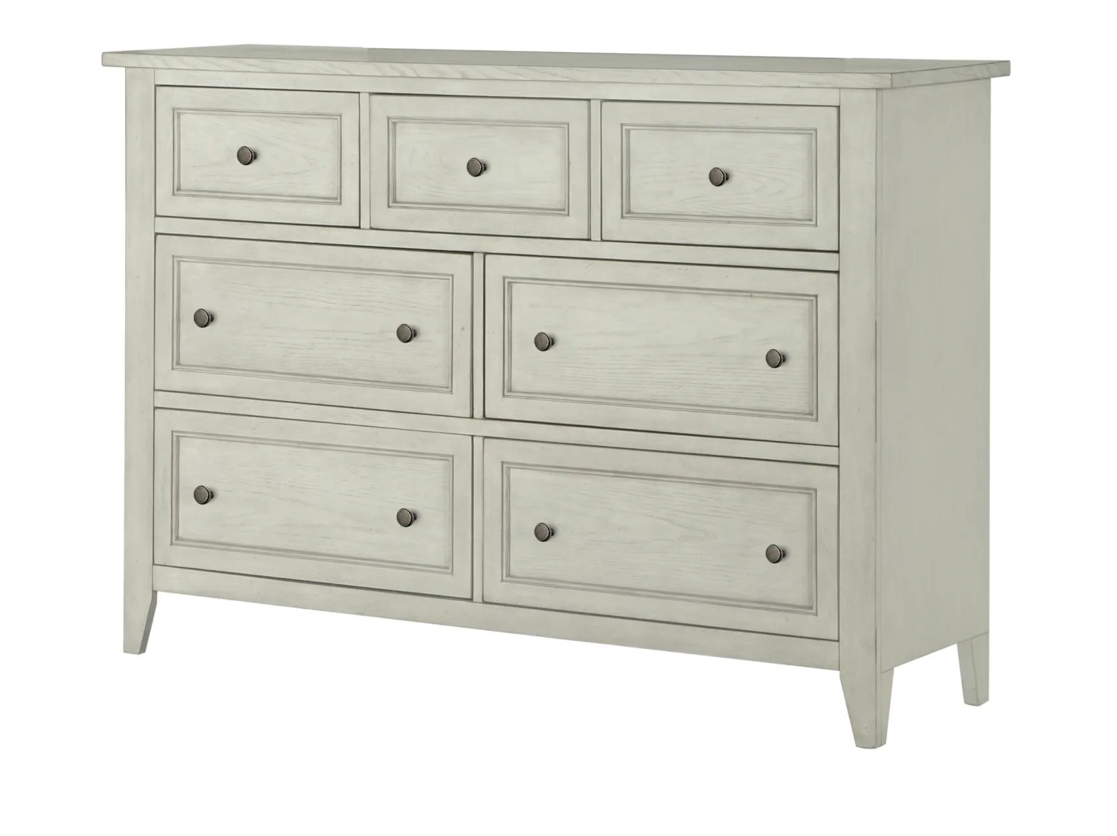 With comforting charm and finely crafted details, the Kirkwood Dresser offers an updated take on timeless Shaker style. This beautiful dresser is crafted from solid hardwood with Cathedral Oak veneers in a weathered white finish. The seven generous drawers, including the top three felt-lined drawers, boast French and English dovetail construction, paneled fronts with beaded detailing, and they are outfitted with weathered bronze pull knobs for a chic touch of color contrast. To complete the simple cottage aesthetic, the Kirwood rests on square feet with an elegant tapered edge. Add the Kirkwood Dresser to your home today.
