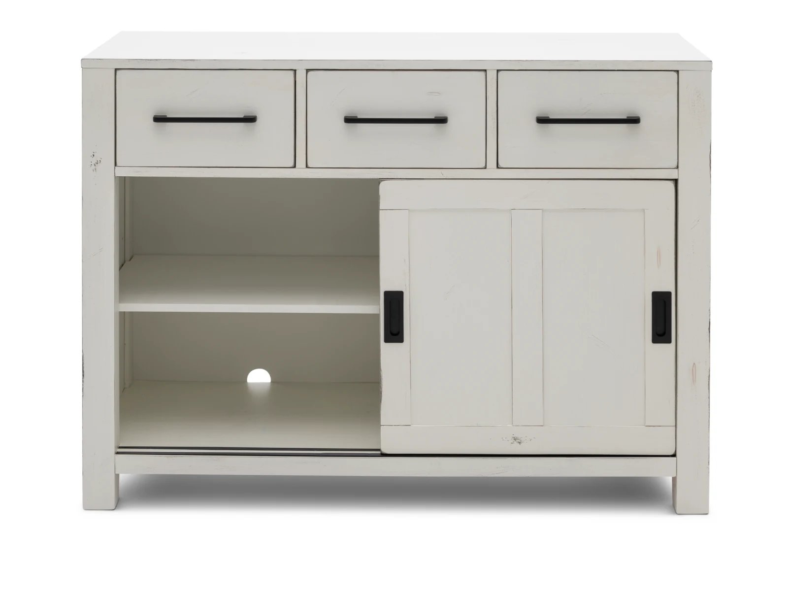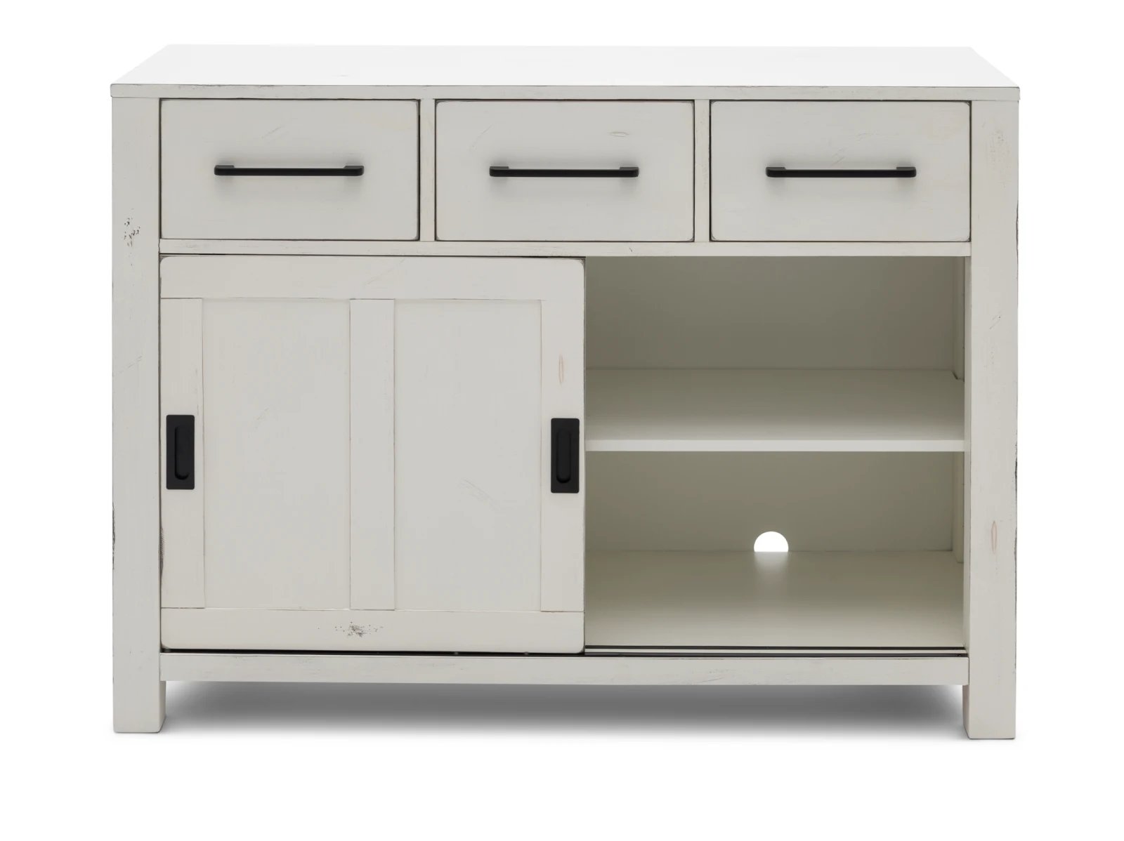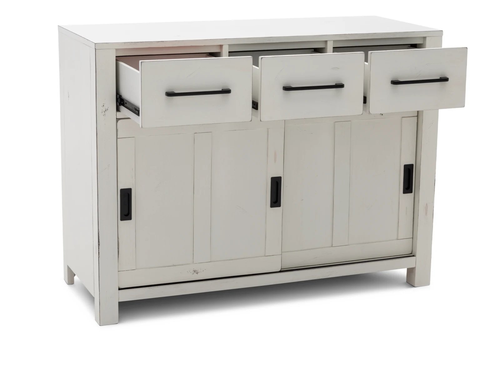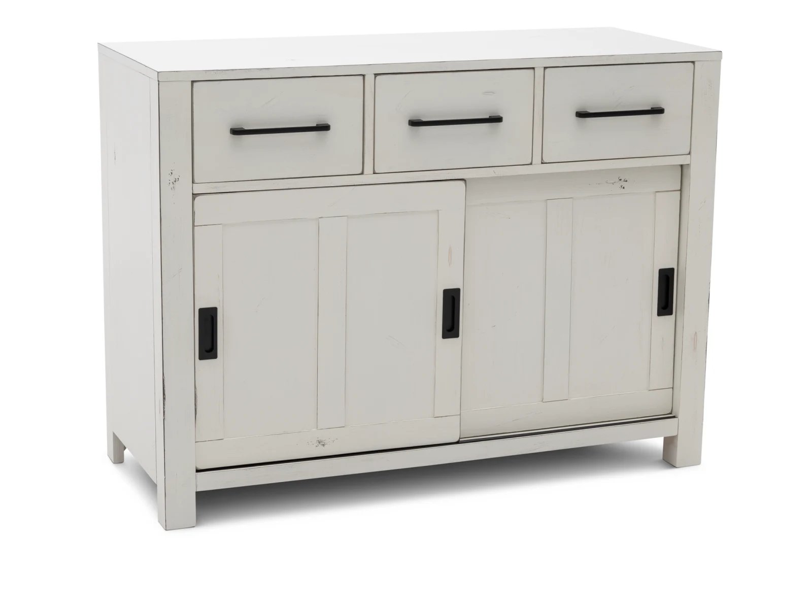& Free ShippingShowcasing a simple, straight-lined silhouette and subtle traditional design elements, the La Paz Buffet is an intriguing dining room furnishing that leaves a lasting impression. This beautiful buffet is crafted from poplar solids and elm veneers, and it features three pull out storage drawers as well as a handy shelved cabinet space with rustic sliding wood doors. The La Paz is finished in a classic white color with heavily distressed detailing, and it’s topped with timeless metal hardware in a black powder-coated finish.