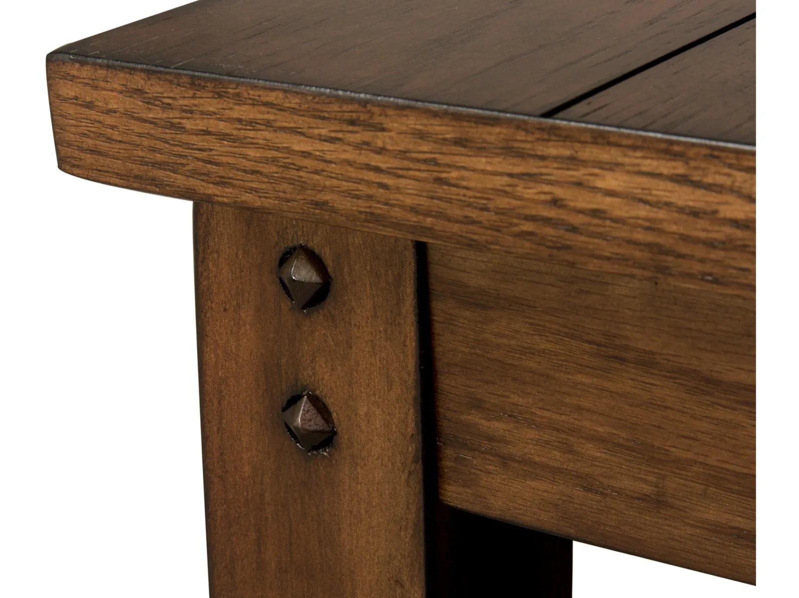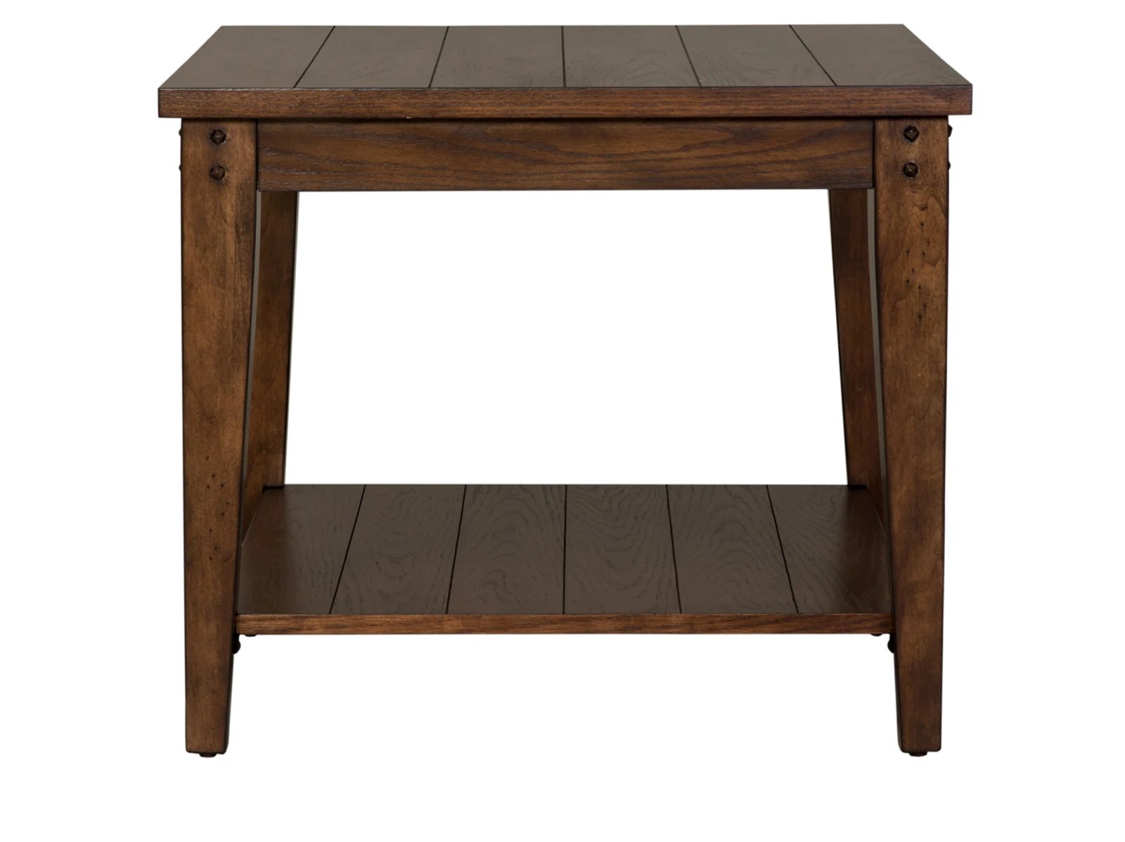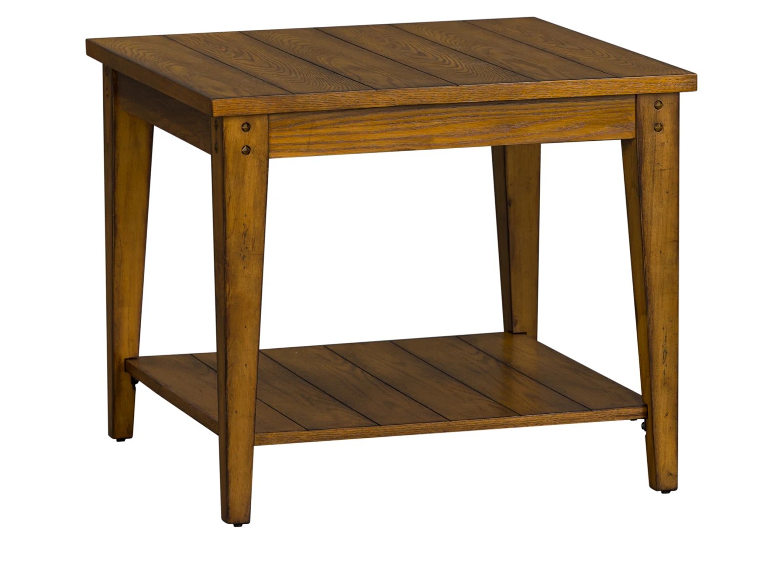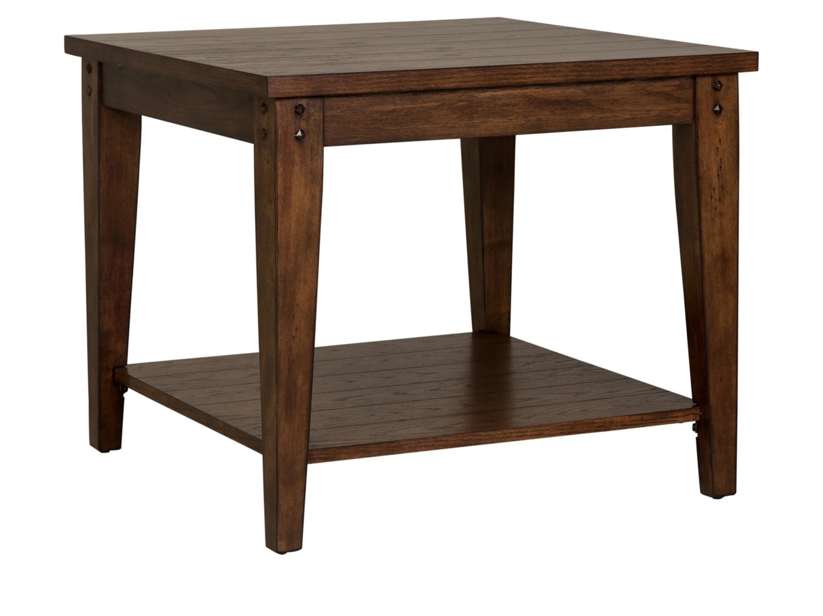 & Free ShippingThe beautiful Lake Ozark square lamp table will be a lovely complement to your living room décor. Crafted of poplar solids and cathedral oak veneers. Features planked tops, wood peg accents and a bottom shelf for additional storage.
