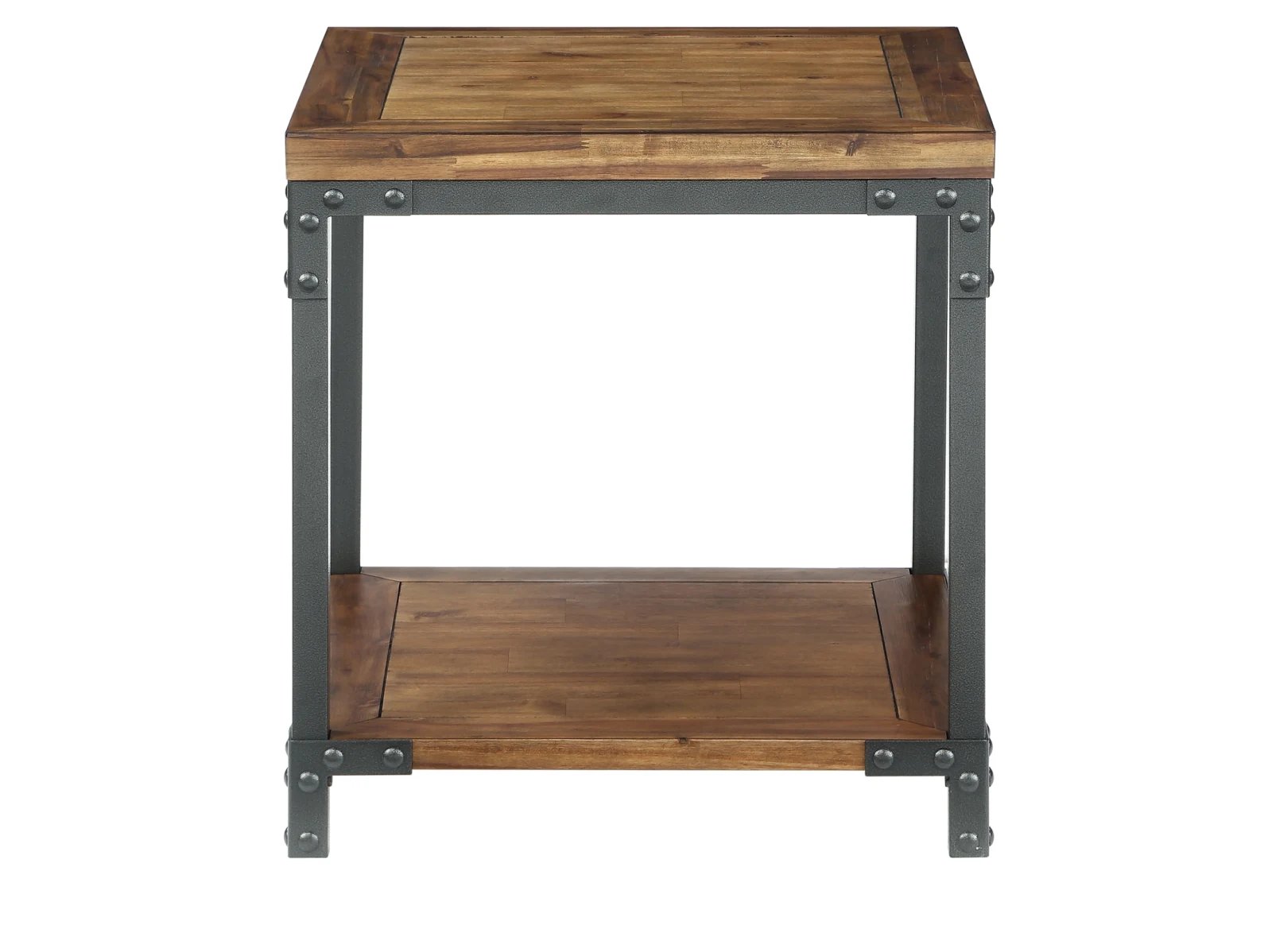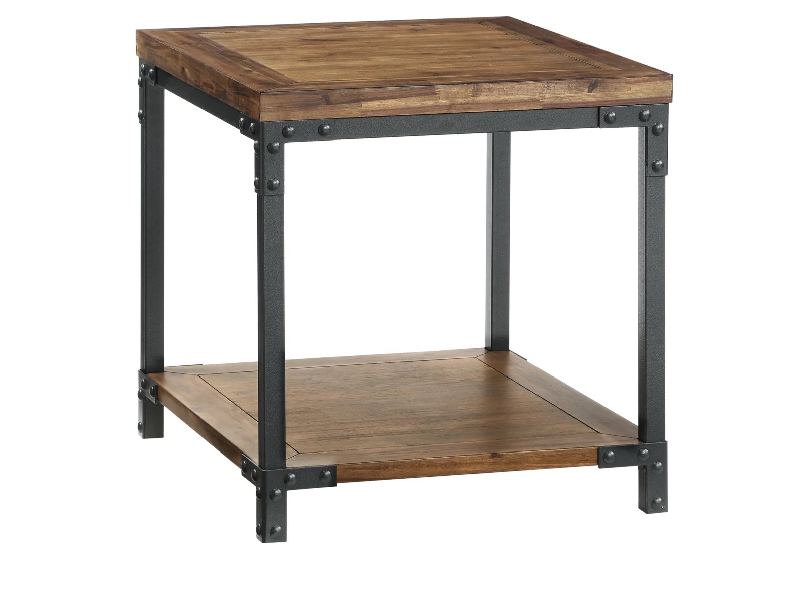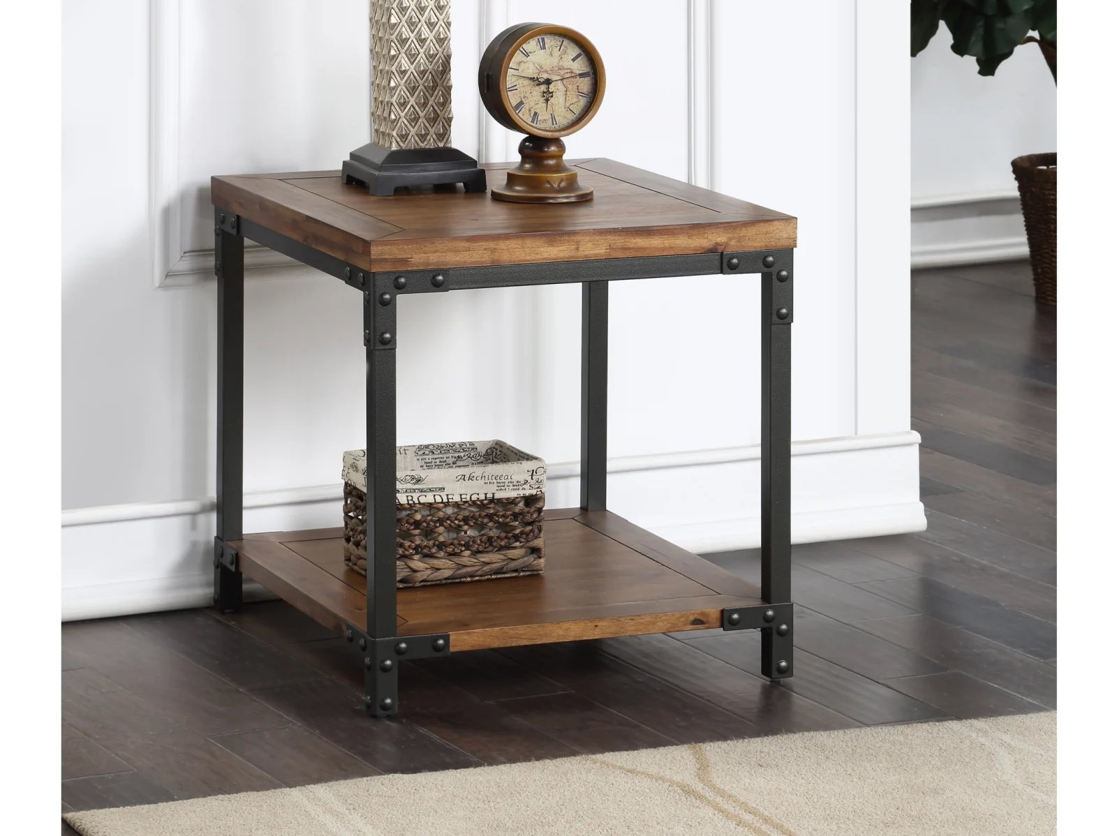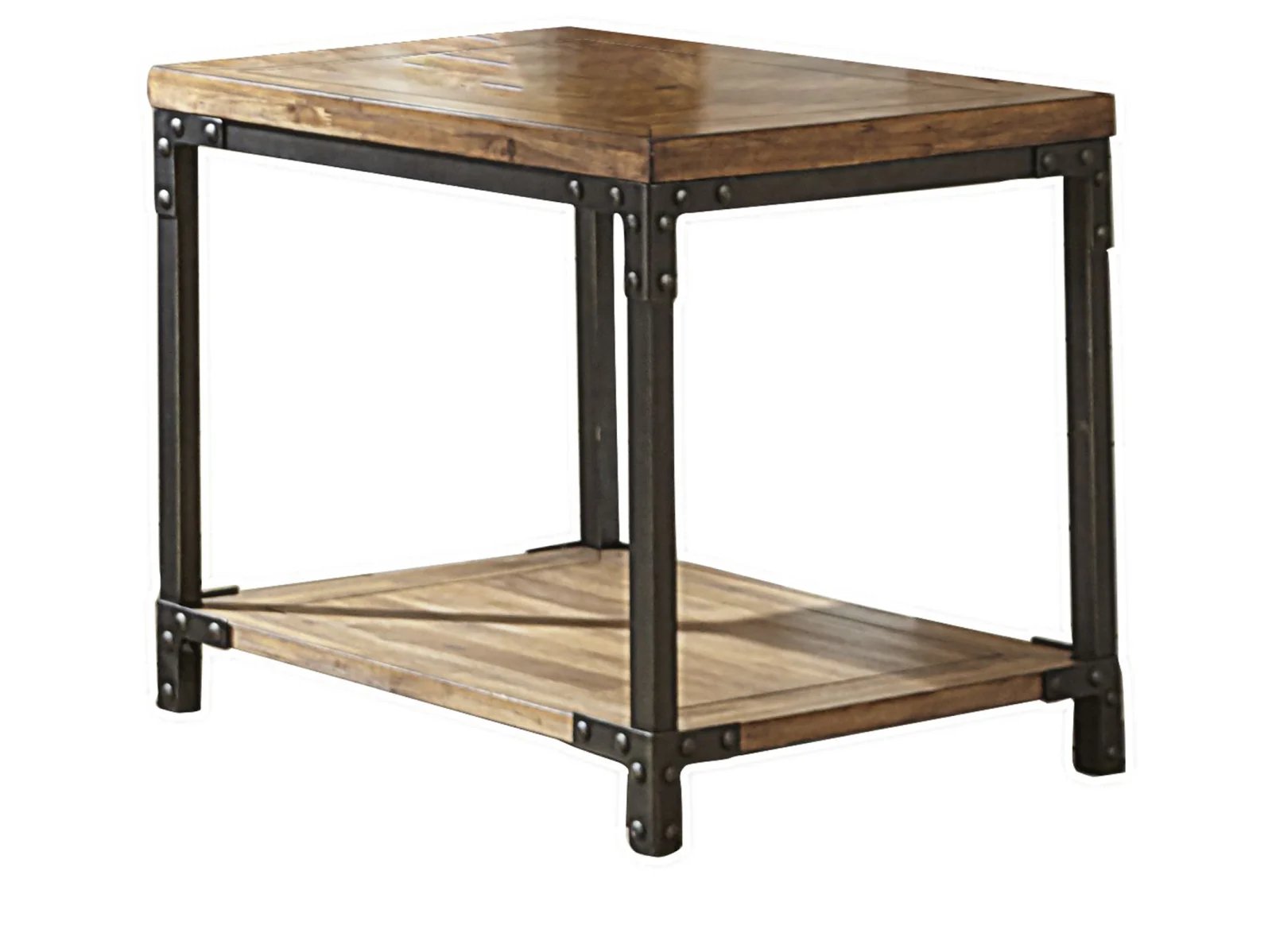 A compact way to bring industrial design into your home, Lansing adds a lot of look in a small package. Great mixed media styling combines with an antiqued honey finish and black metal frame for a rustic and industrial design combo that is mesmerizing. A picture frame veneered top and bottom shelf add look and valuable storage area. Just add Coffee Table for a complete living room transformation.