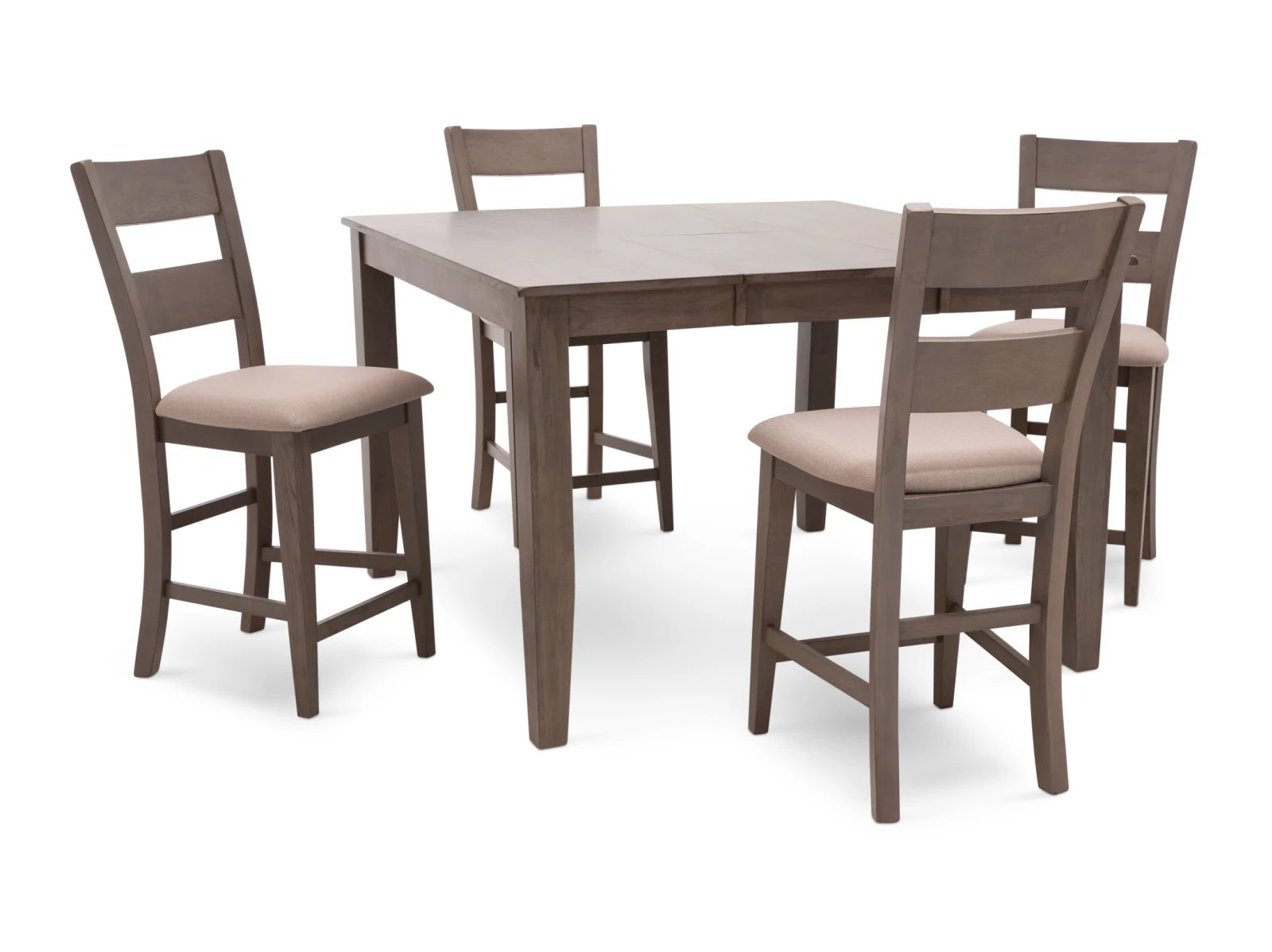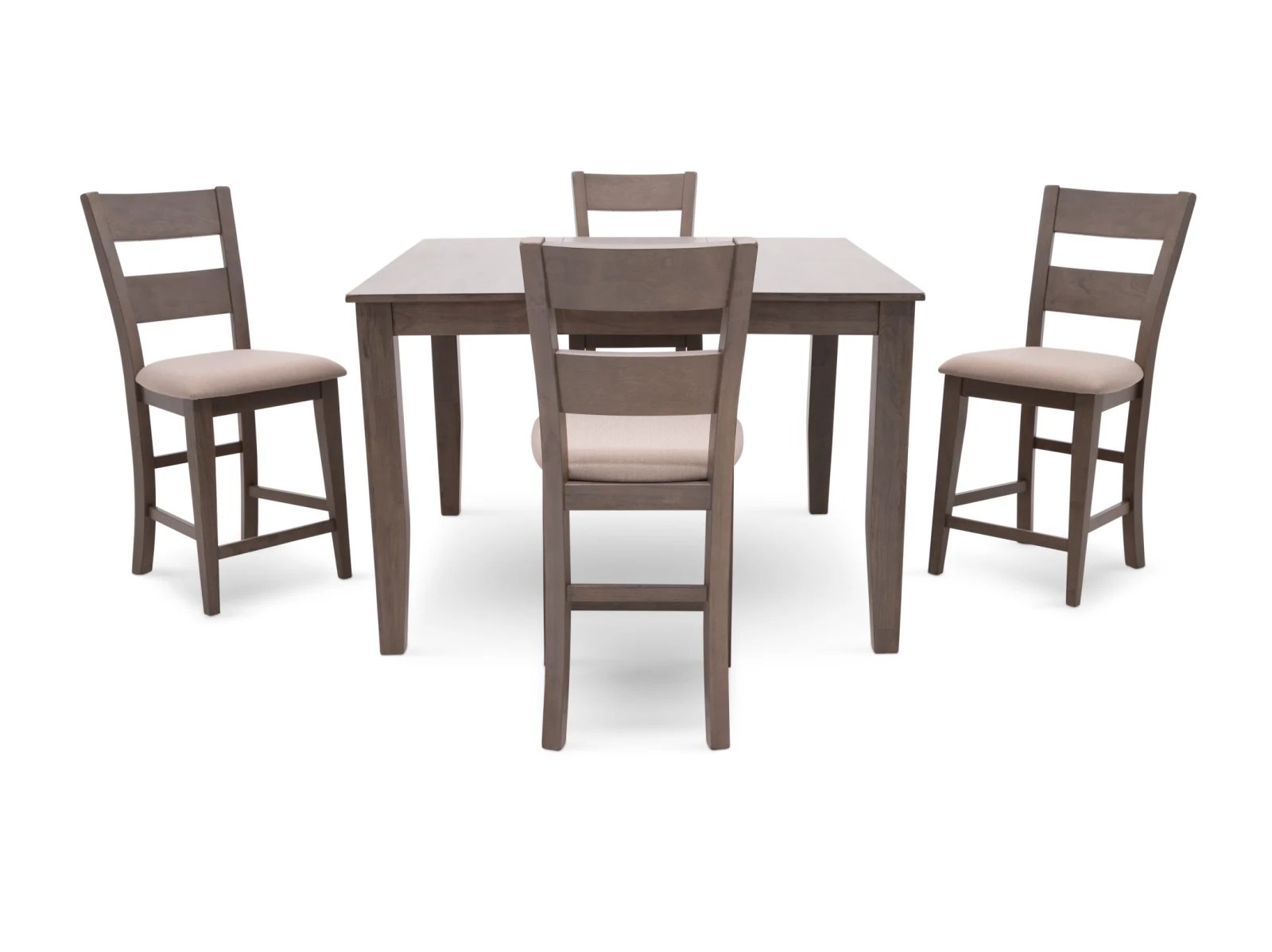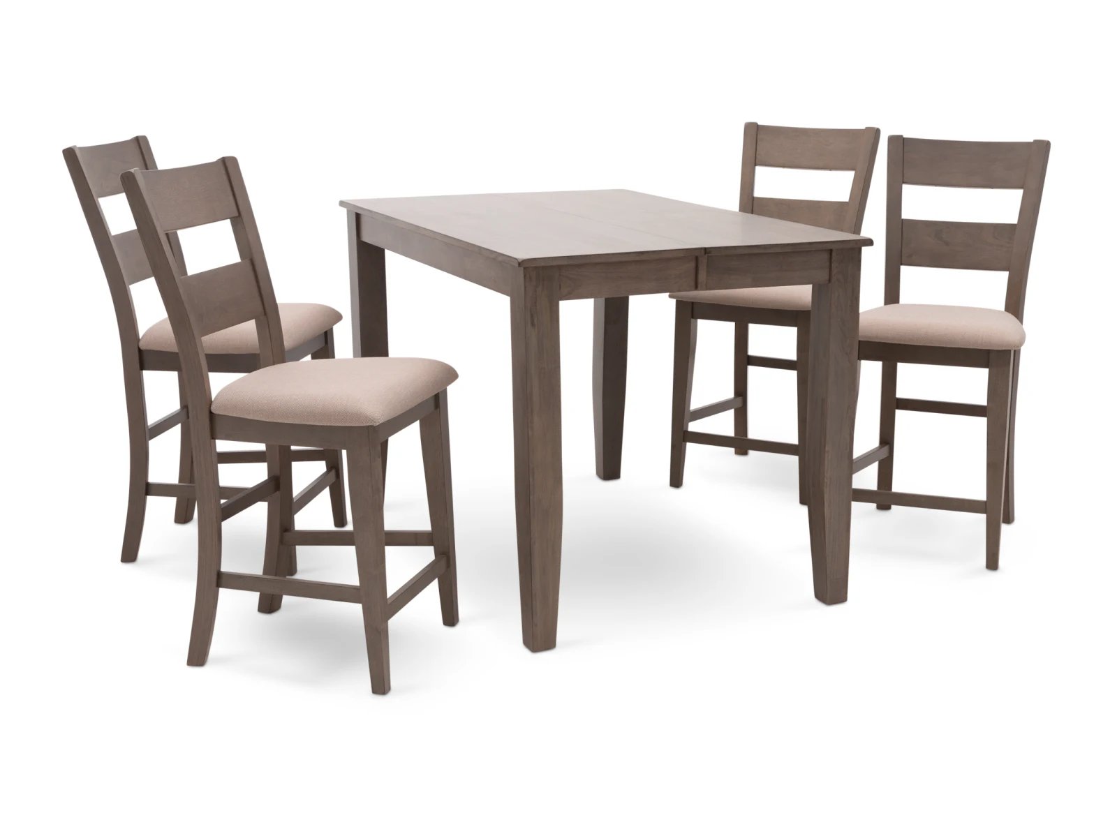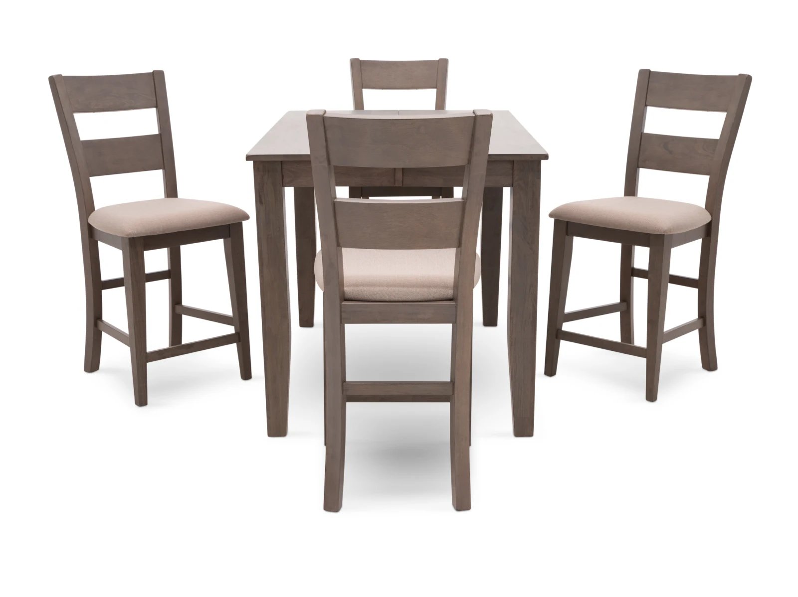 The Largo 5 Pc. Counter Height Dining Set has a compact footprint to suit any space and classic style to enhance any decor. Crafted from sustainable mango wood, this practical set is available in two colors: a fashionable neutral gray with light gray upholstered seats or a warm chestnut brown with chocolate brown upholstered seats. A testament to the beauty of long graceful lines, the counter height table rests on elegant tapered legs which appear to meet the tabletop, and the four accompanying bar stools feature curved ladder backs which extend through their square rear legs. Transform your counter height space with the Largo 5 Pc. Counter Height Set.