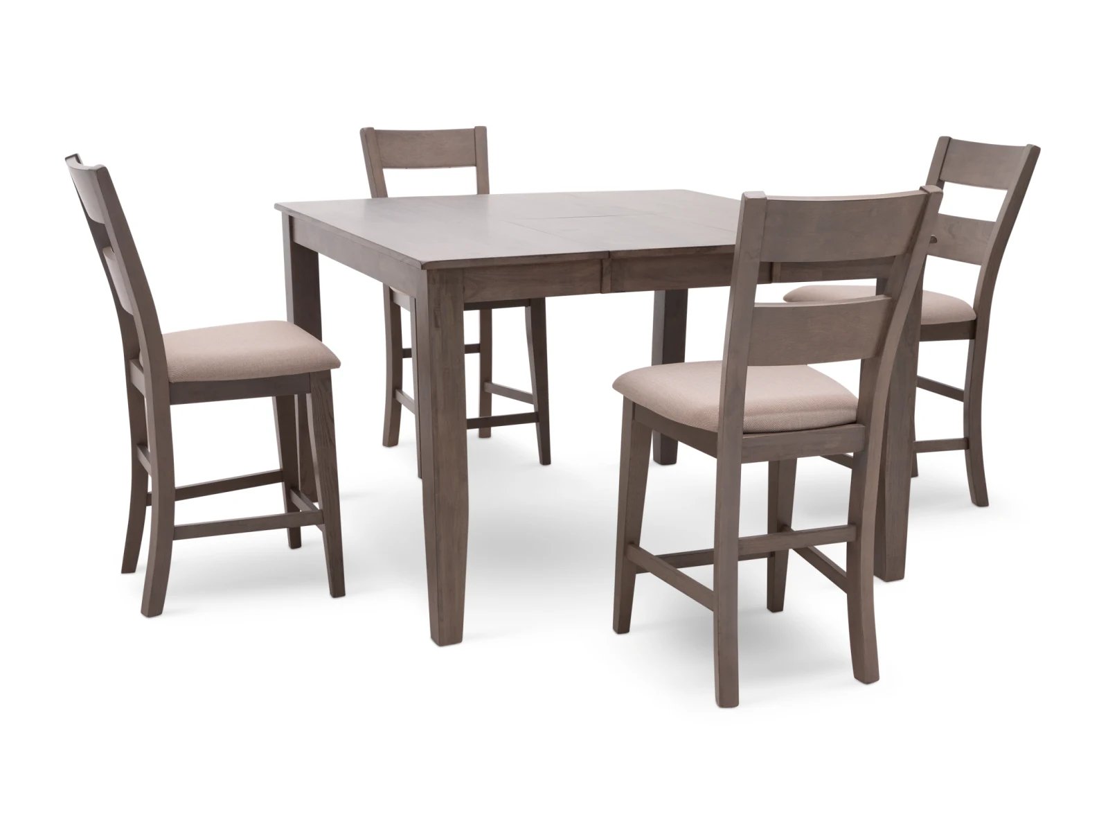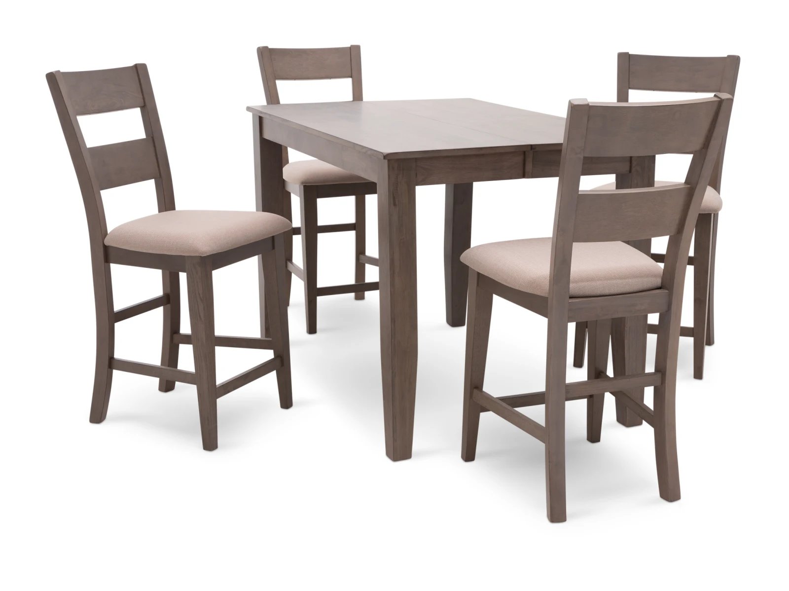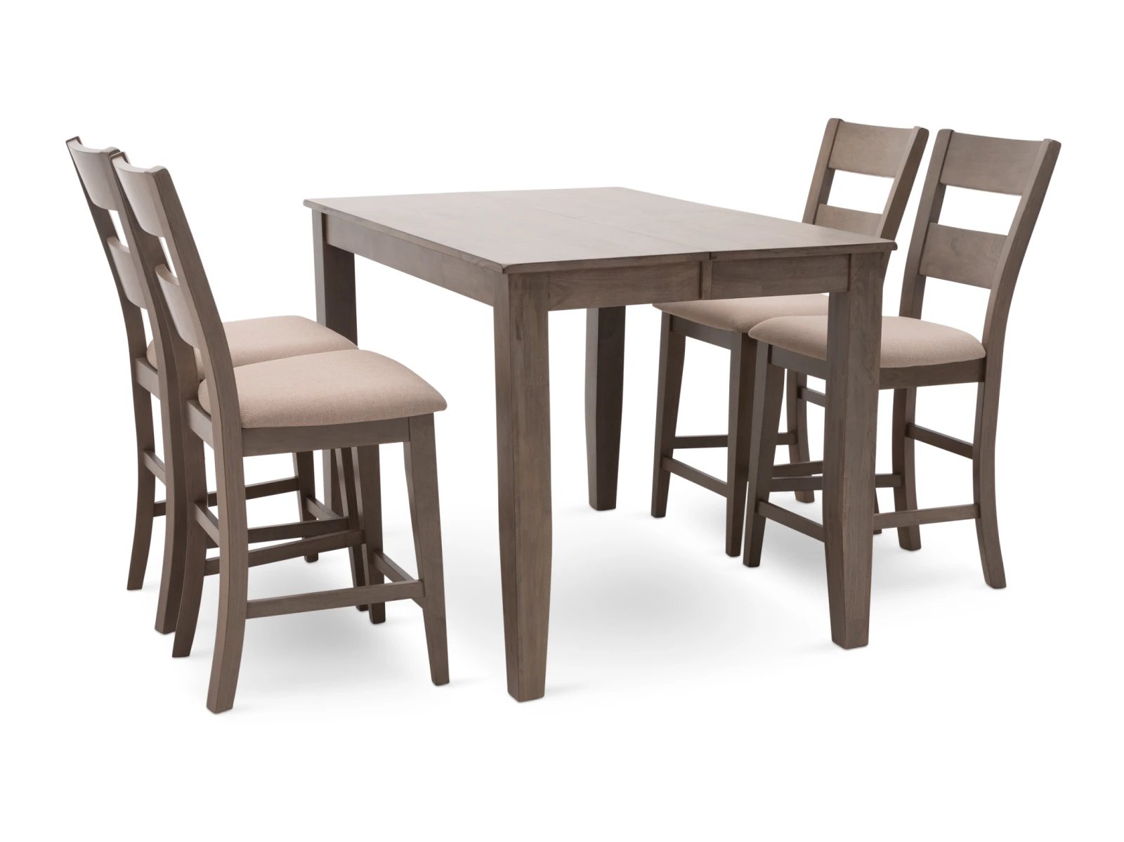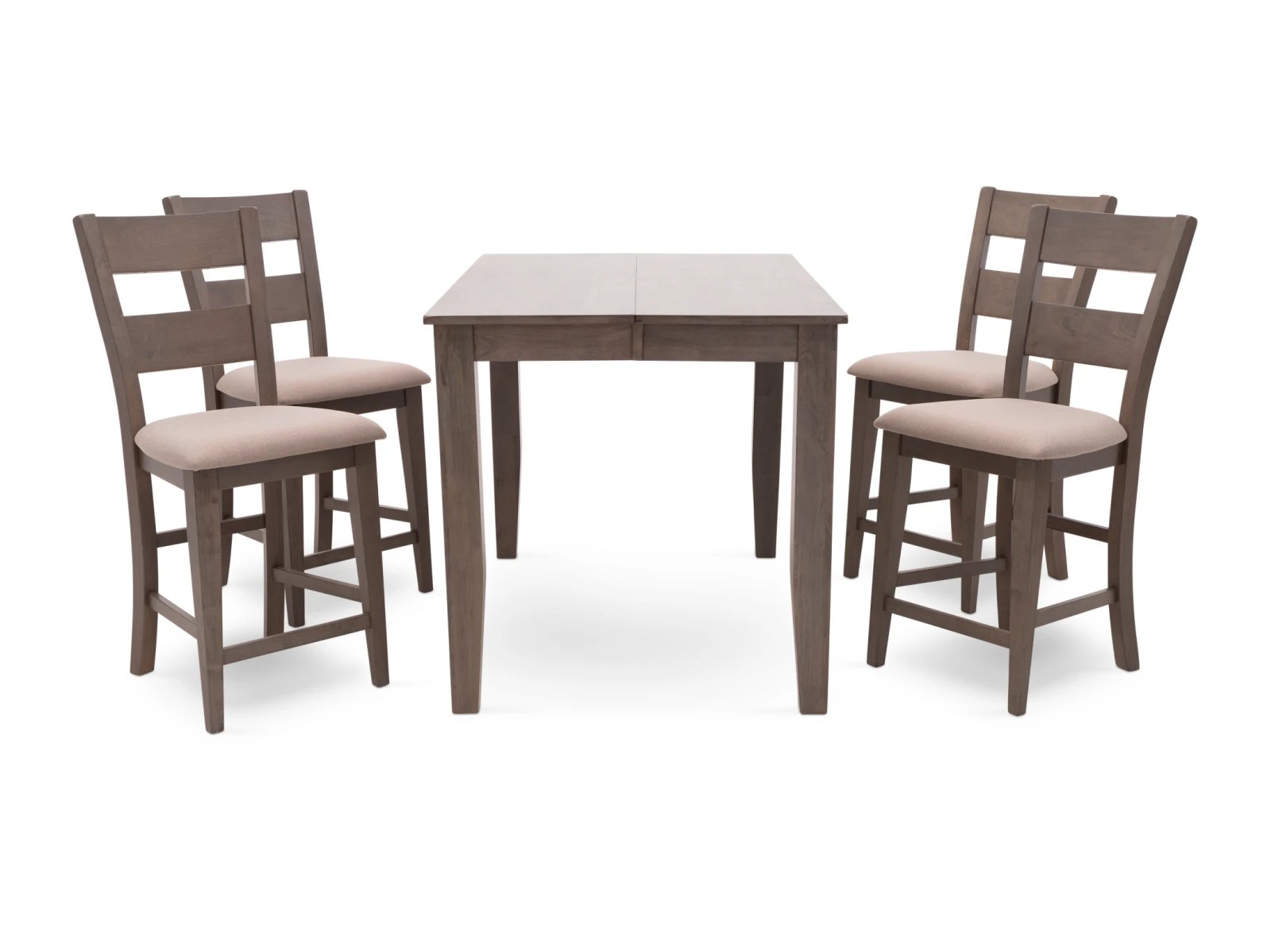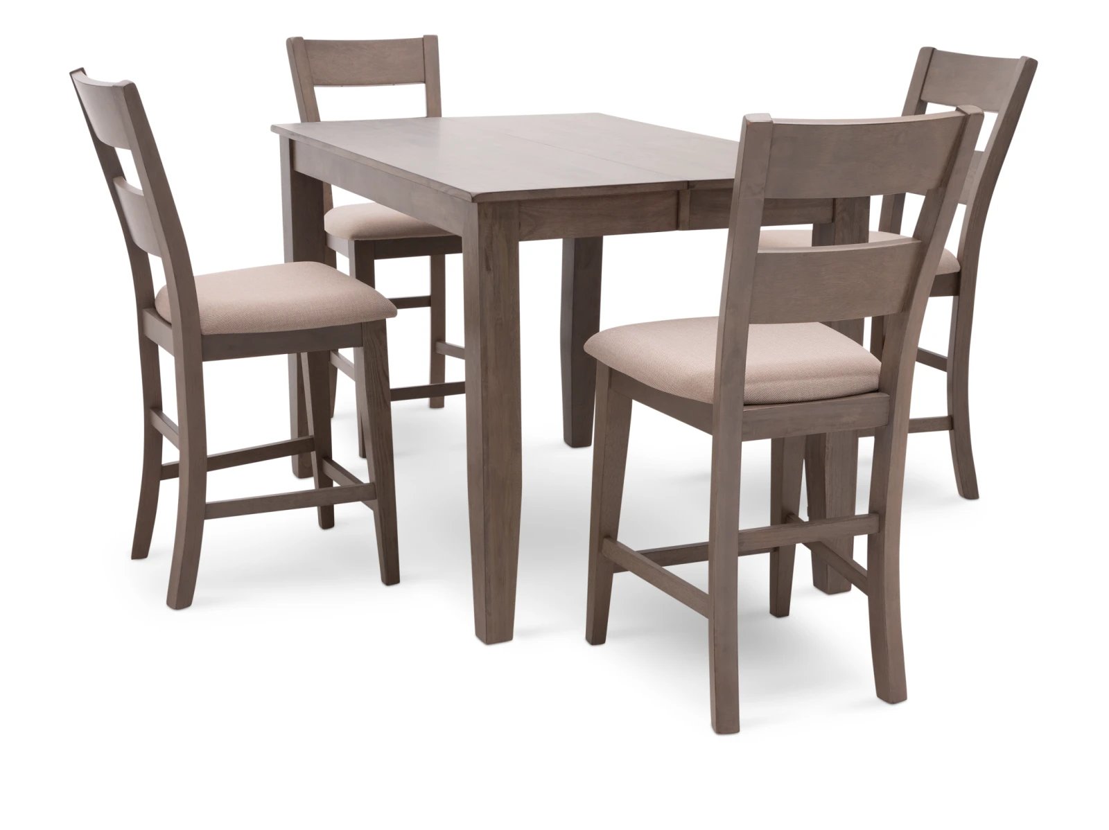 The Largo 5 Pc. Counter Height Dining Set has a compact footprint to suit any space and classic style to enhance any decor. Crafted from sustainable mango wood, this practical set is available in two colors: a fashionable neutral gray with light gray upholstered seats or a warm chestnut brown with chocolate brown upholstered seats. A testament to the beauty of long graceful lines, the counter height table rests on elegant tapered legs which appear to meet the tabletop, and the four accompanying bar stools feature curved ladder backs which extend through their square rear legs. Transform your counter height space with the Largo 5 Pc. Counter Height Set.