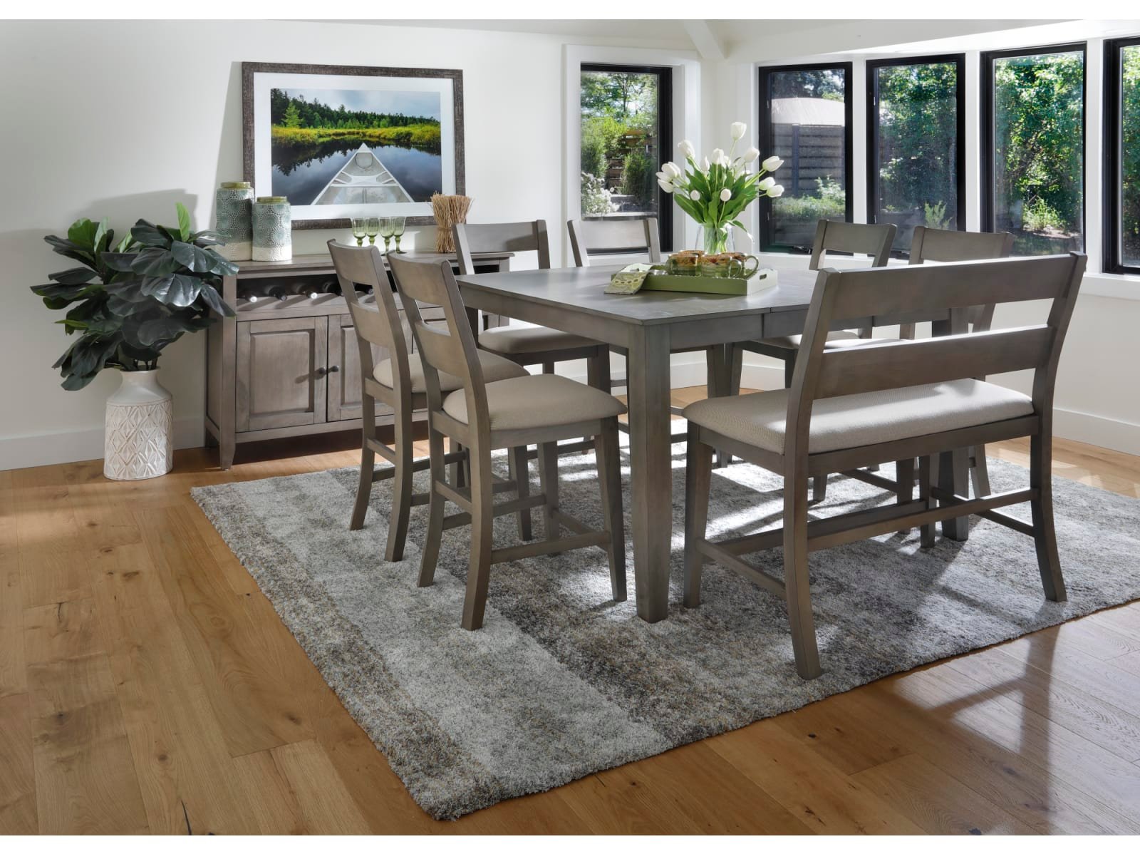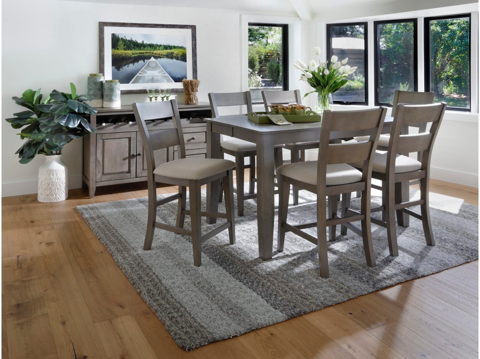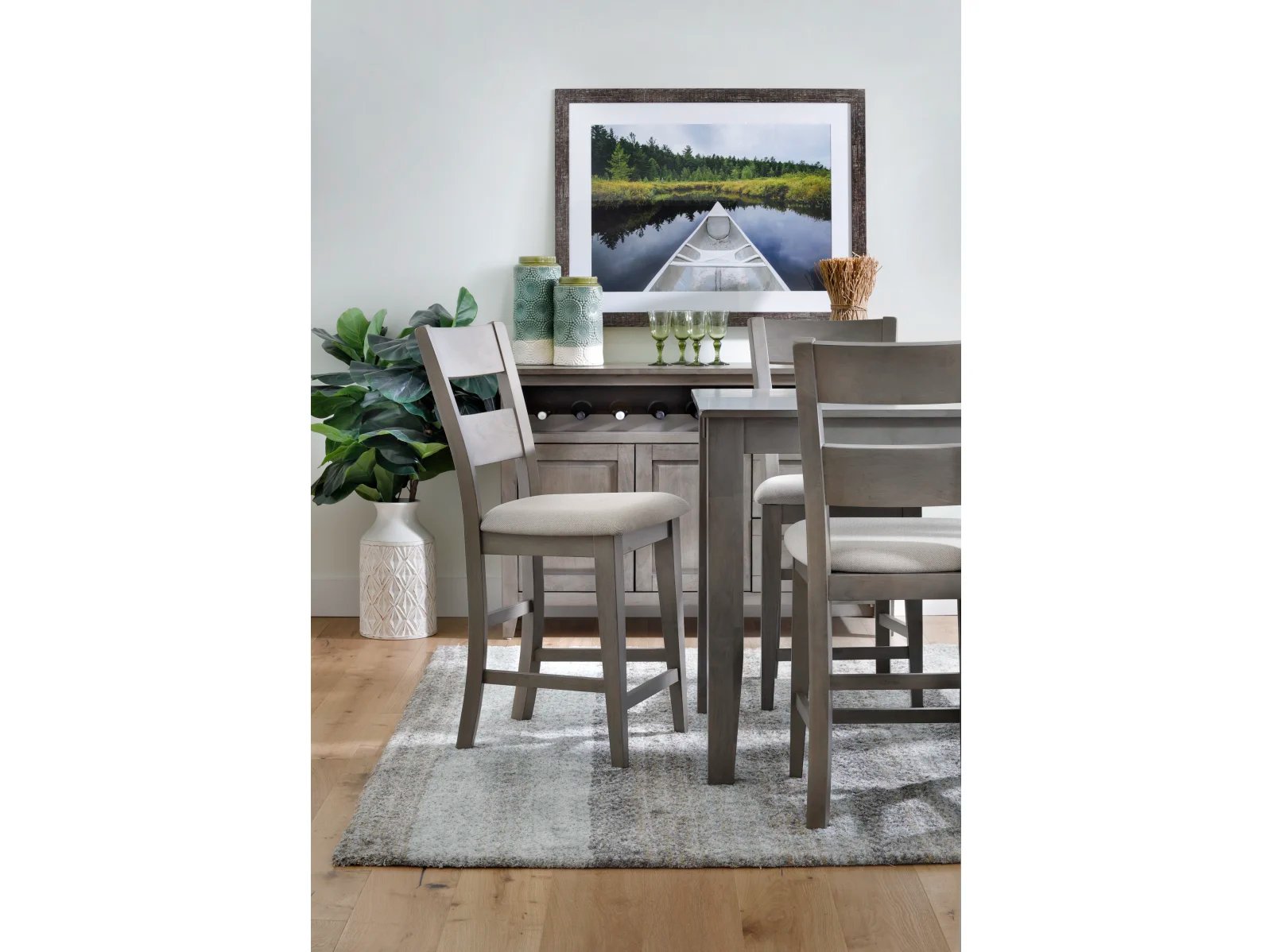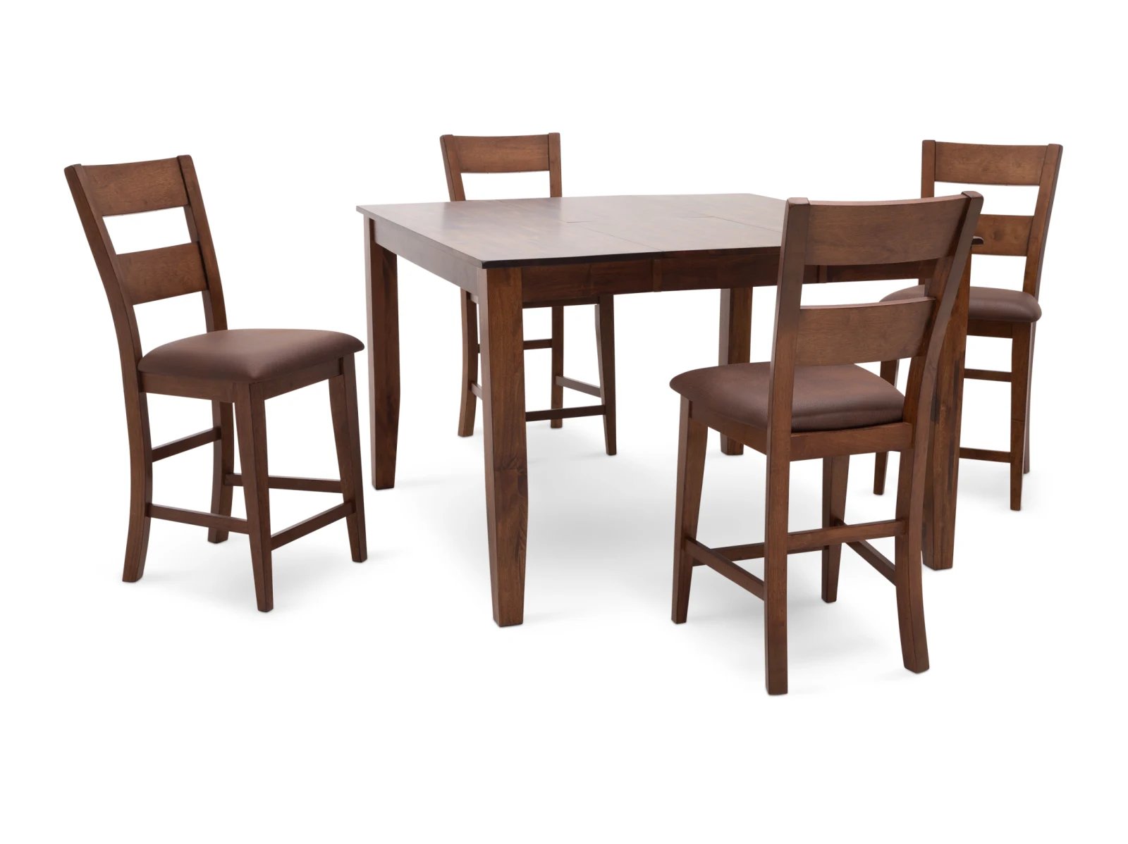 The Largo 5 Pc. Counter Height Dining Set has a compact footprint to suit any space and classic style to enhance any decor. Crafted from sustainable mango wood, this practical set is available in two colors: a fashionable neutral gray with light gray upholstered seats or a warm chestnut brown with chocolate brown upholstered seats. A testament to the beauty of long graceful lines, the counter height table rests on elegant tapered legs which appear to meet the tabletop, and the four accompanying bar stools feature curved ladder backs which extend through their square rear legs. Transform your counter height space with the Largo 5 Pc. Counter Height Set.