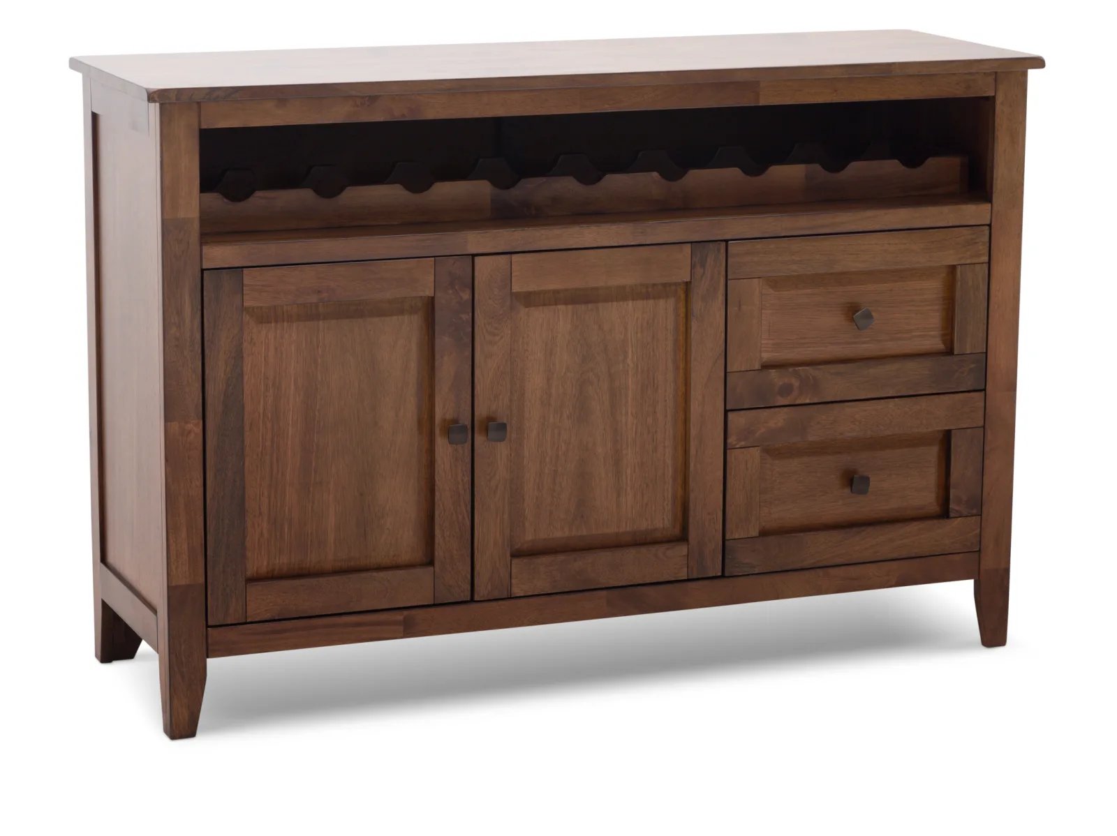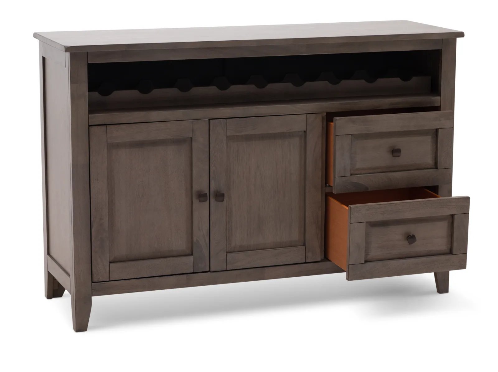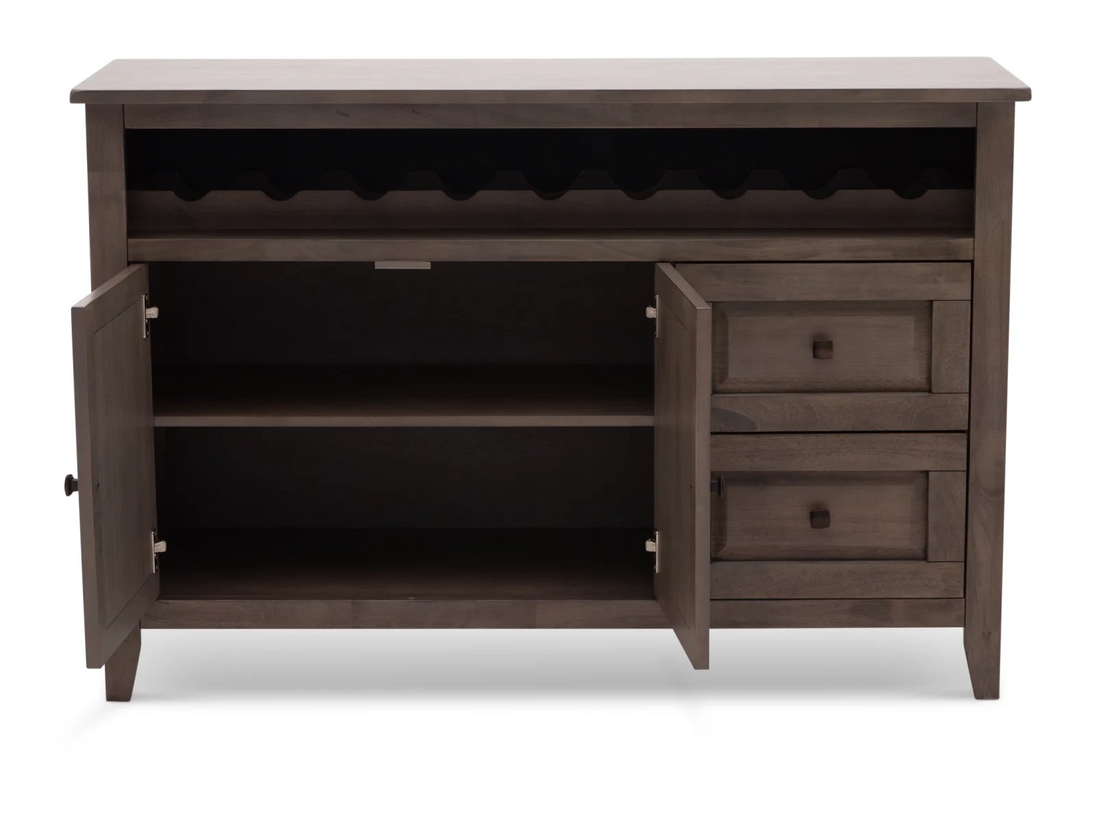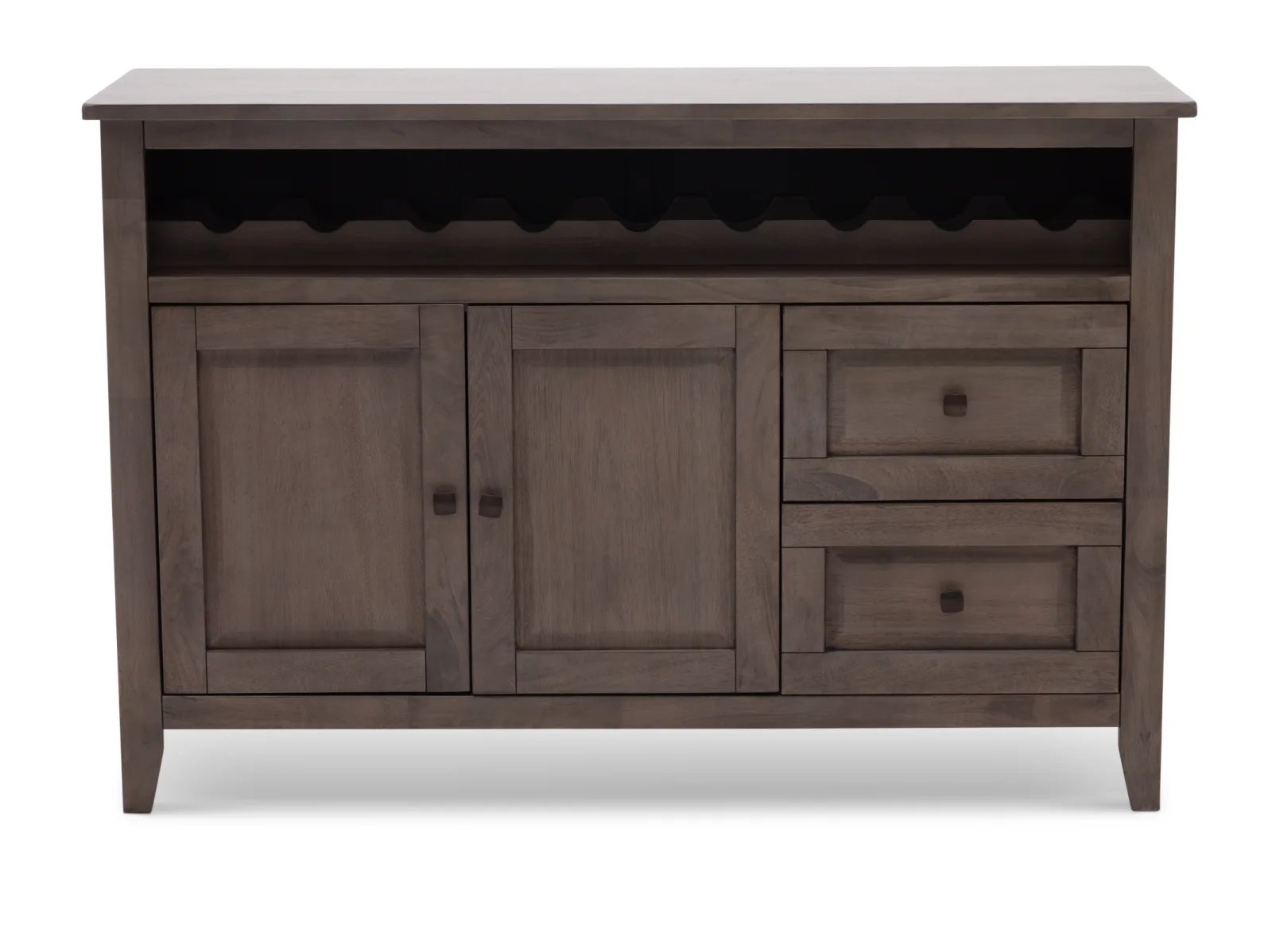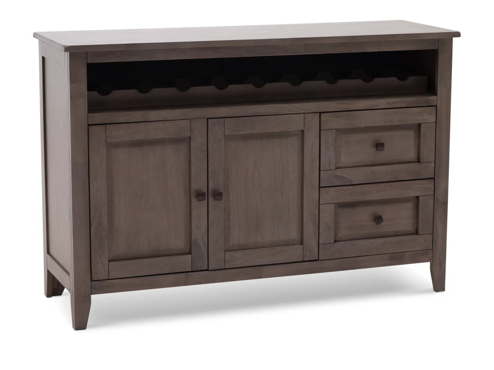 With its clean-lined design and attractive wooden detailing, the Largo Server brings with it a sense of elegance and expert craftsmanship. The Largo is crafted from sustainable mango wood and is available in two versatile colors: a fashionable neutral gray or warm chestnut brown. It features a roomy cabinet space and two smooth-opening drawers outfitted with classic square pull knobs located beneath a horizontal wine bottle rack. To complete the well-crafted look, the Largo's sides, cabinet doors, and drawer fronts boast picture frame paneling. Take home the timeless Largo Server today.