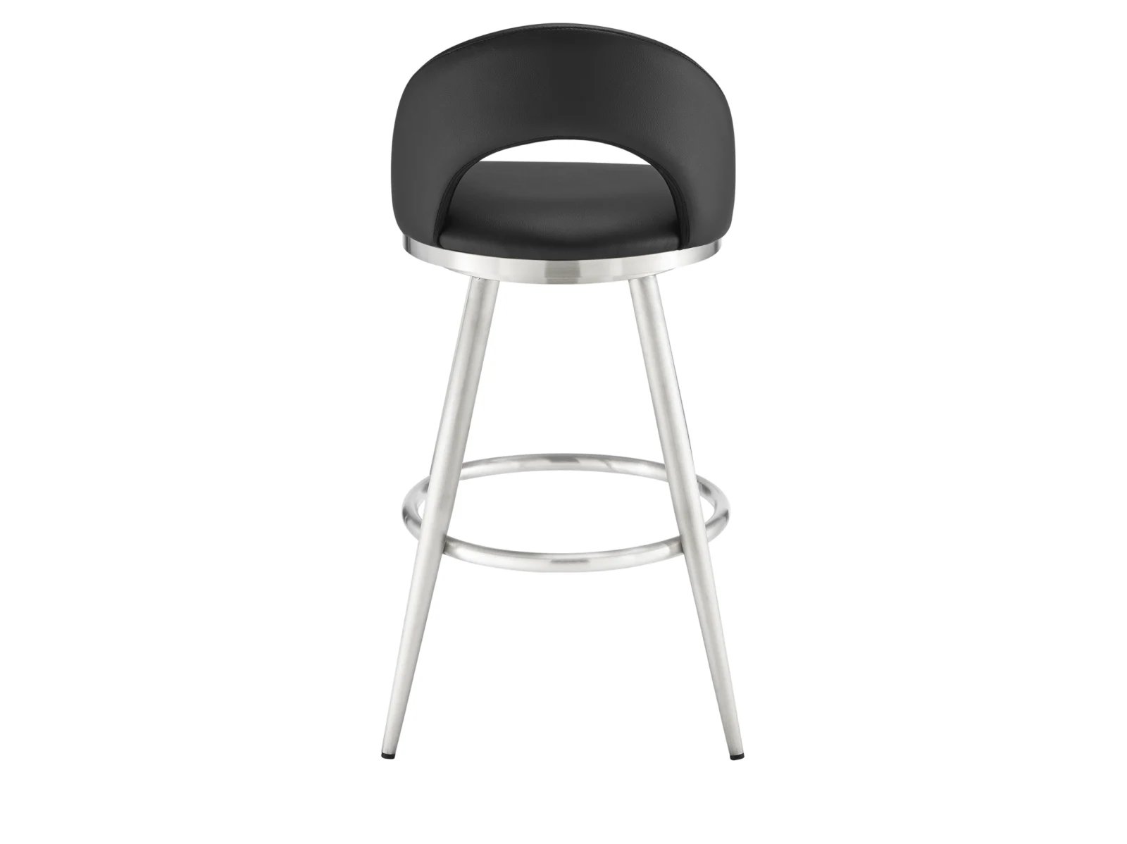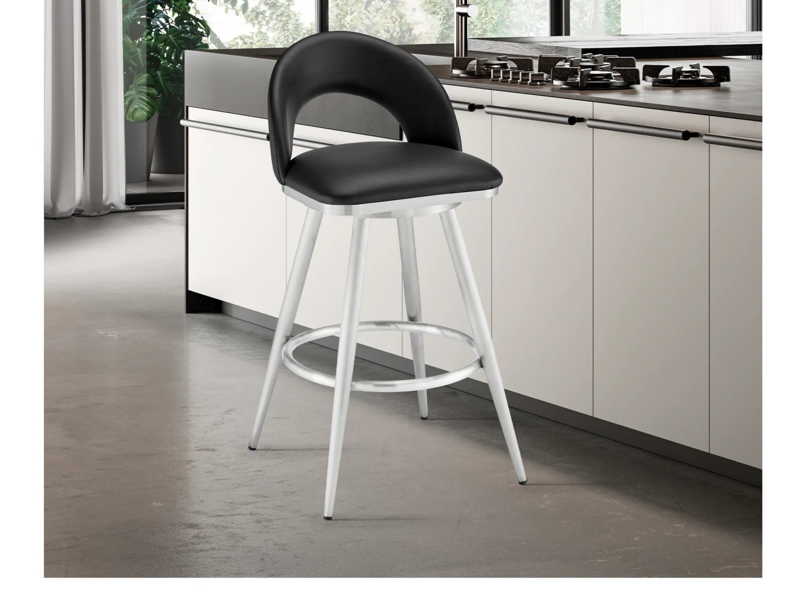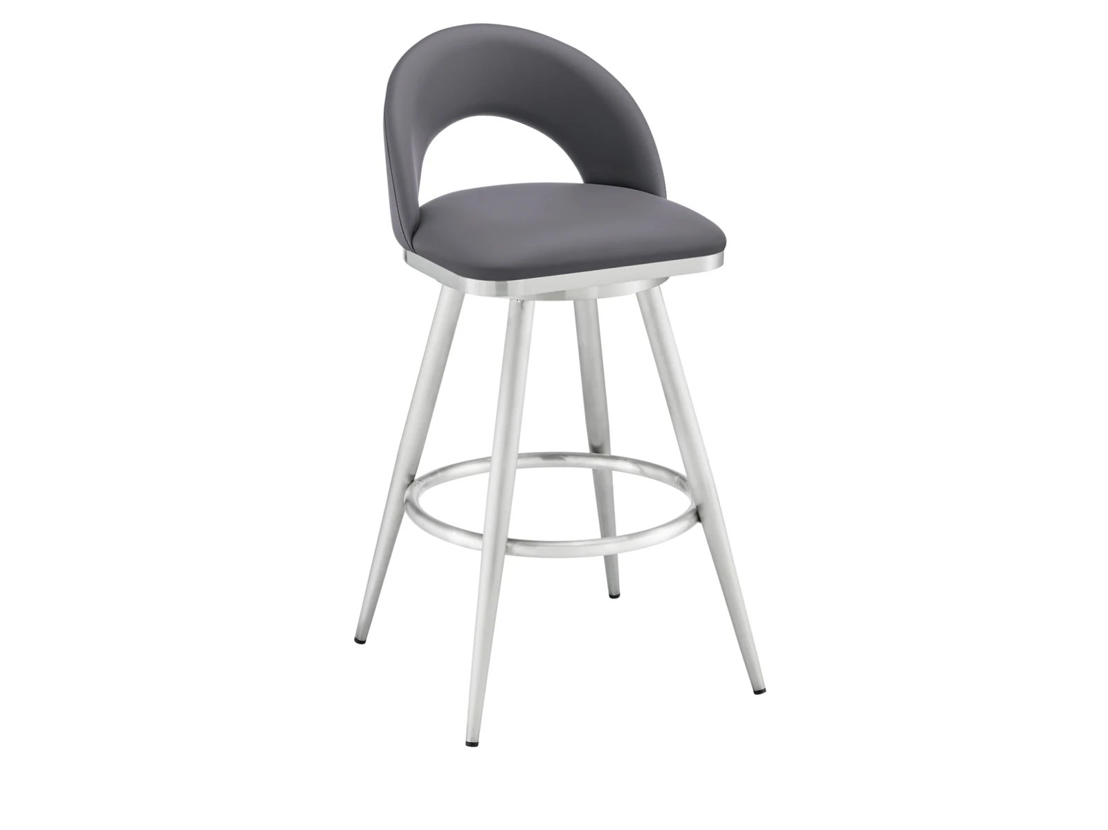 & Free ShippingEmbrace the refined style of the Latta swivel faux leather bar stool from Armen Living. This kitchen bar stool is available with a metal 4 leg base and faux leather upholstery. Faux leather does not crack easily and is stain resistant, does not fade easily and is also UV resistant. Counter or bar height stools that feature a swivel mechanism tend to be much more convenient for everyday use or when entertaining. The wonderful full 360-degree swivel function allows for maximum mobility. The smooth glide swivel function allows you to change directions with ease, making this your new favorite seat in your home. This modern bar stool has an open back that creates a breathable seat, allowing you to sit comfortably for extended periods. The Latta stylish bar stools are available in a black finish with grey, or coffee upholstery, or a brushed stainless-steel finish with black, grey, or white faux leather upholstery. The Latta comes in 26-inch counter height, or 30-inch bar height options.