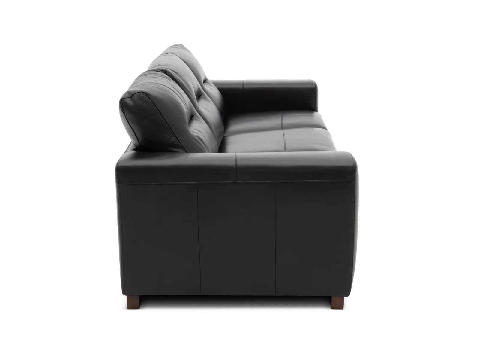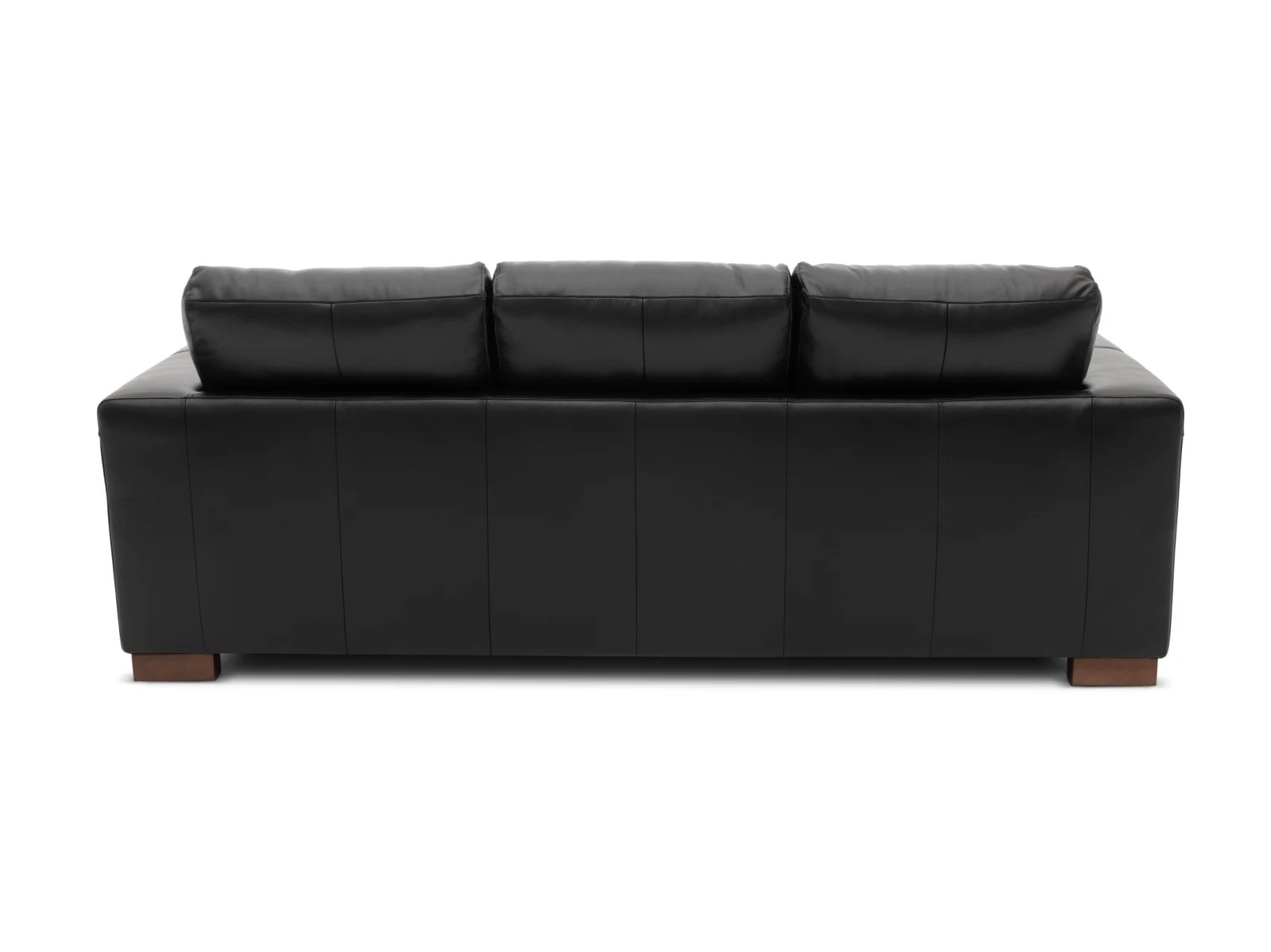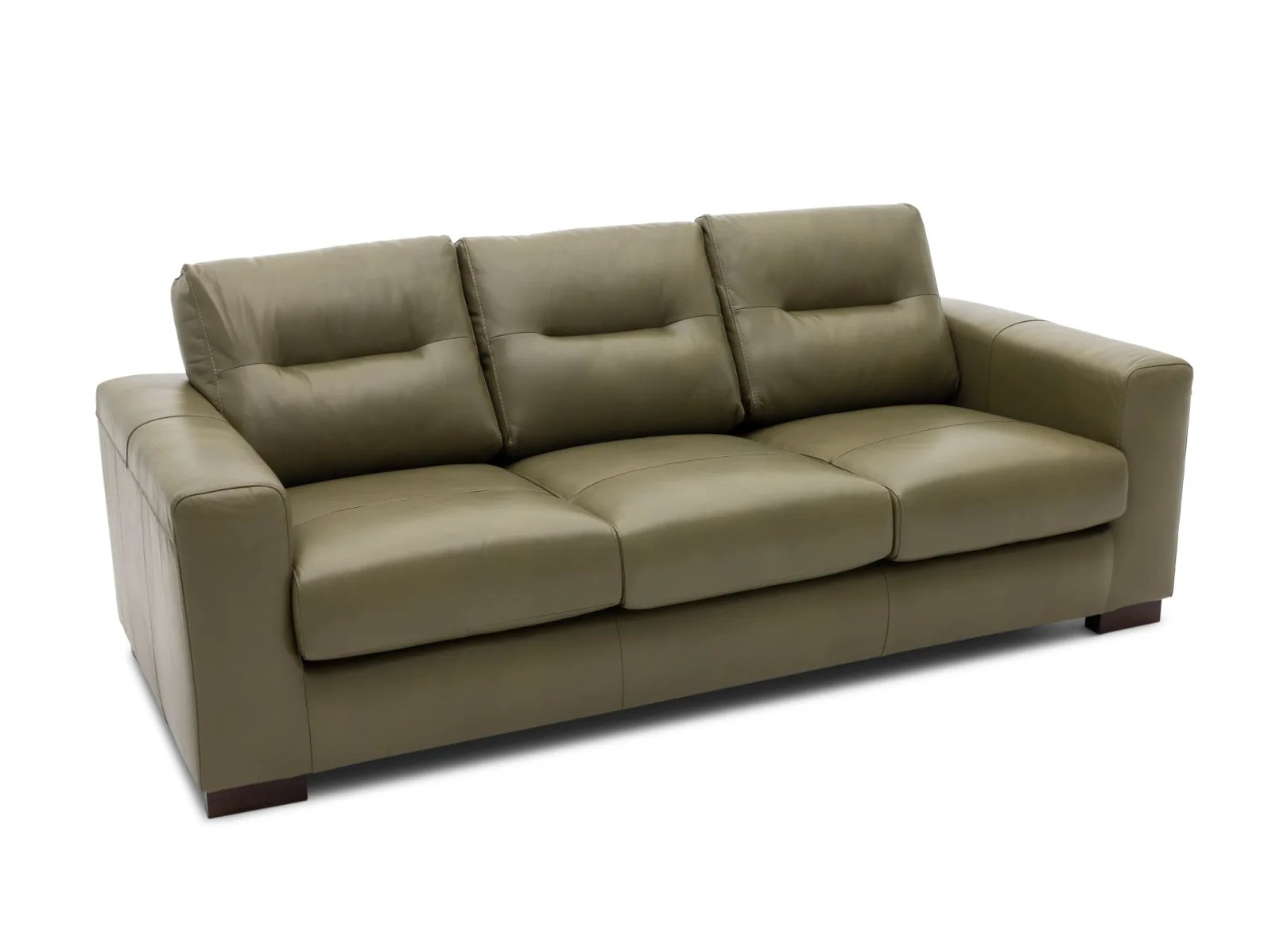 Ledger Leather Sofa The Ledger Leather Sofa offers fantastic seating space in a stylish throwback design. Its size is ideal for studios, apartments, or city living and is full of eye-catching details, from the decorative tufted back cushions to the elegant track arms. The Ledger’s supportive seats feature individually-wrapped coils, foam, and a Dacron fiber wrap for a comfortable feel and easy maintenance. Upholstered in supple Italian leather, you can make a statement with the Ledger in stylish olive green, or keep it classic in cool, sophisticated black. Level up your lounging with the Ledger Sofa today.