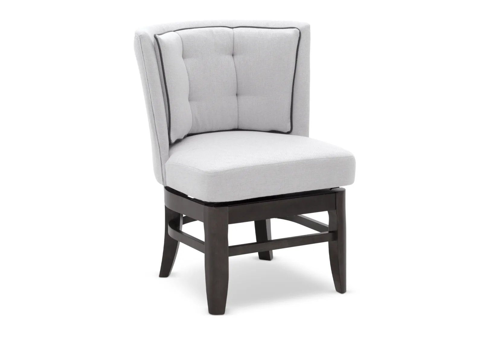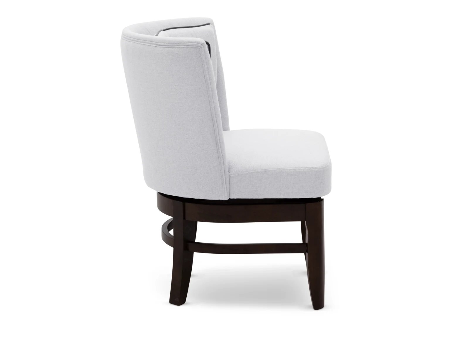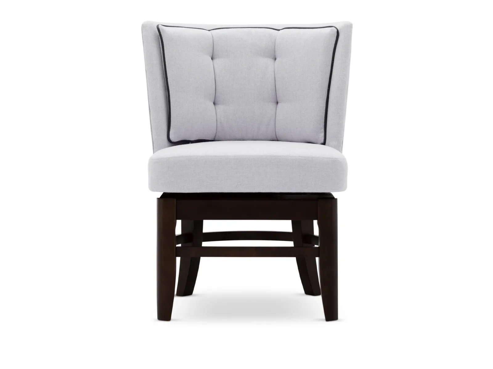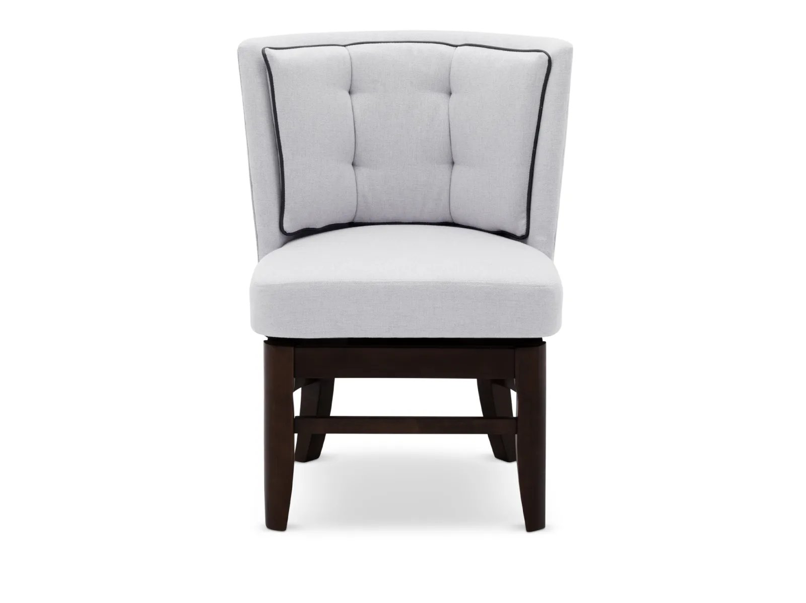 Curved, comfortable and compact; the Lennon Upholstered Swivel Dining Chair offers both style and substance. This unique Dining Chair is crafted from rubberwood with oak veneers in a brown-gray finish, and it features a smooth swivel base topped with luxurious memory foam cushioning. To complete the look, the Lennon’s barrel-shaped backrest and comfy seat are upholstered with an off-white fabric which showcases stylish button tufting and black welted edging. Take home the Lennon Upholstered Swivel Dining Chair today.