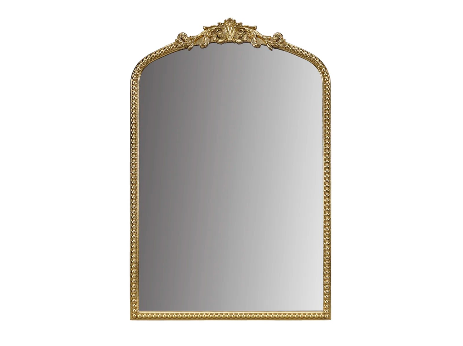 - vintage-inspired framed wall mirror features an arched shape with adornments on the top of the arch