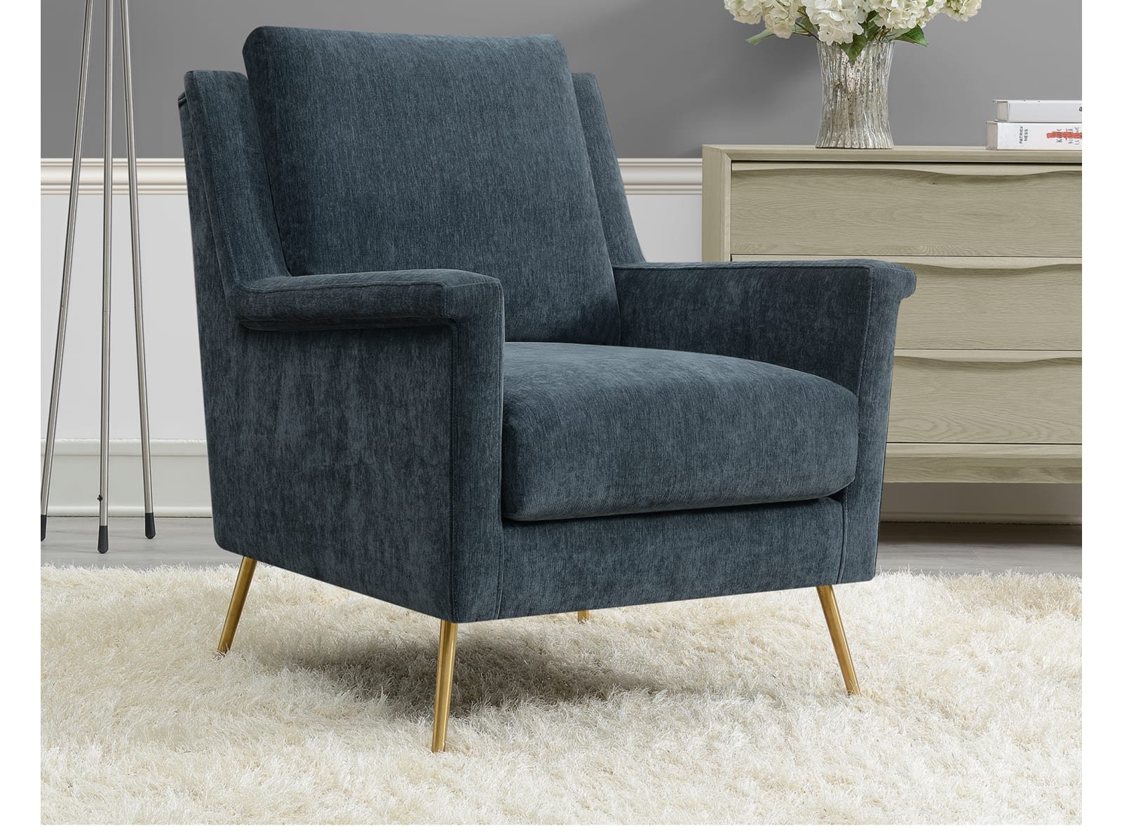 The Limerick Accent Chair is living room goals! This mid-century style chair features gold legs, adding extra flair to this already stylish set. Not only is the cushion foam filled, but the oversized, deep seating will make this more than just a pretty chair you display; but one that you will also love to relax in. The straight arms are plush like, and feature a slight overhang. Sleek, clean lines and piping throughout make this chair a standout for years to come.