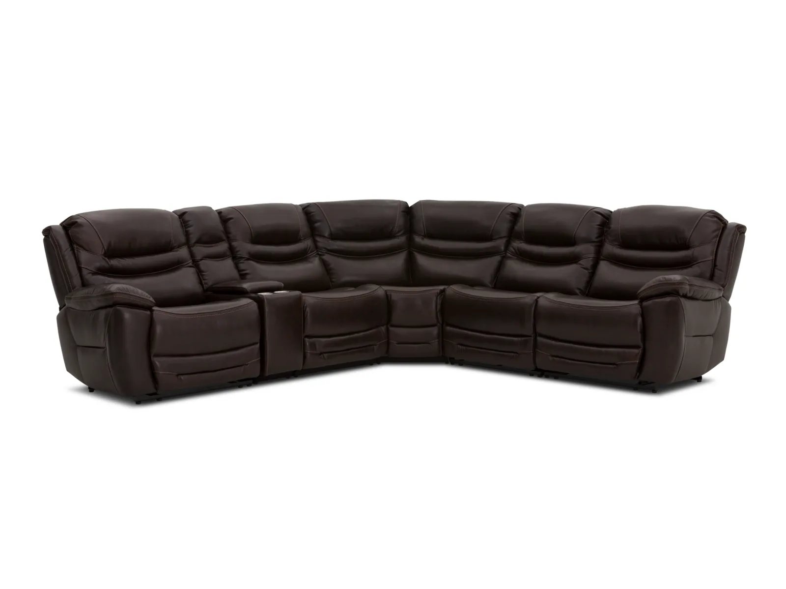 Build the room of your dreams with the Lounge II 6 Pc. Leather Reclining Sectional. This large L-shaped sofa features power motion reclining for easy relaxation after a long day. Upholstered in smooth, walnut brown top grain leather, the Lounge II is luxuriously padded with high pub backs and pillow-top arms so that you and your guests will feel cradled in comfort. With unique features such a catch-sleeve to prevent the loss of change, remotes, and keys as well as a charging station with stainless steel cup-holders, the Lounge II has everything you need and more in order to ensure you have stress-free relaxation. Take home this gorgeous lounging sectional today.