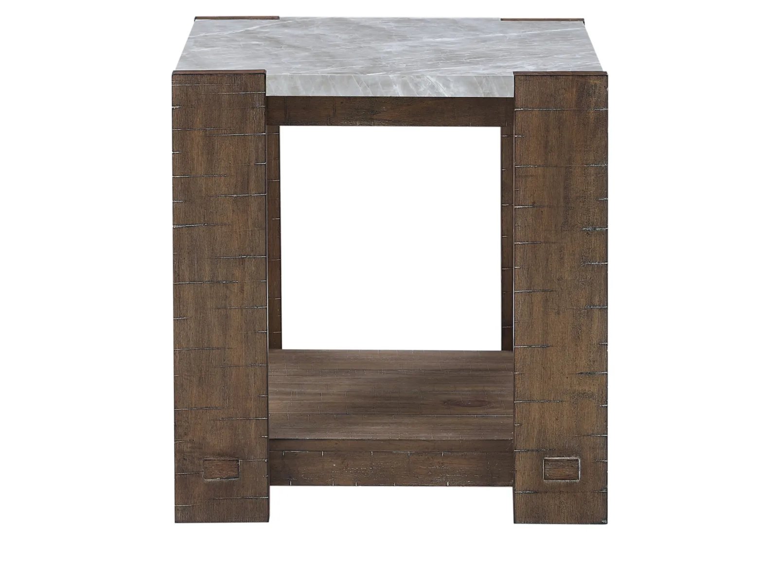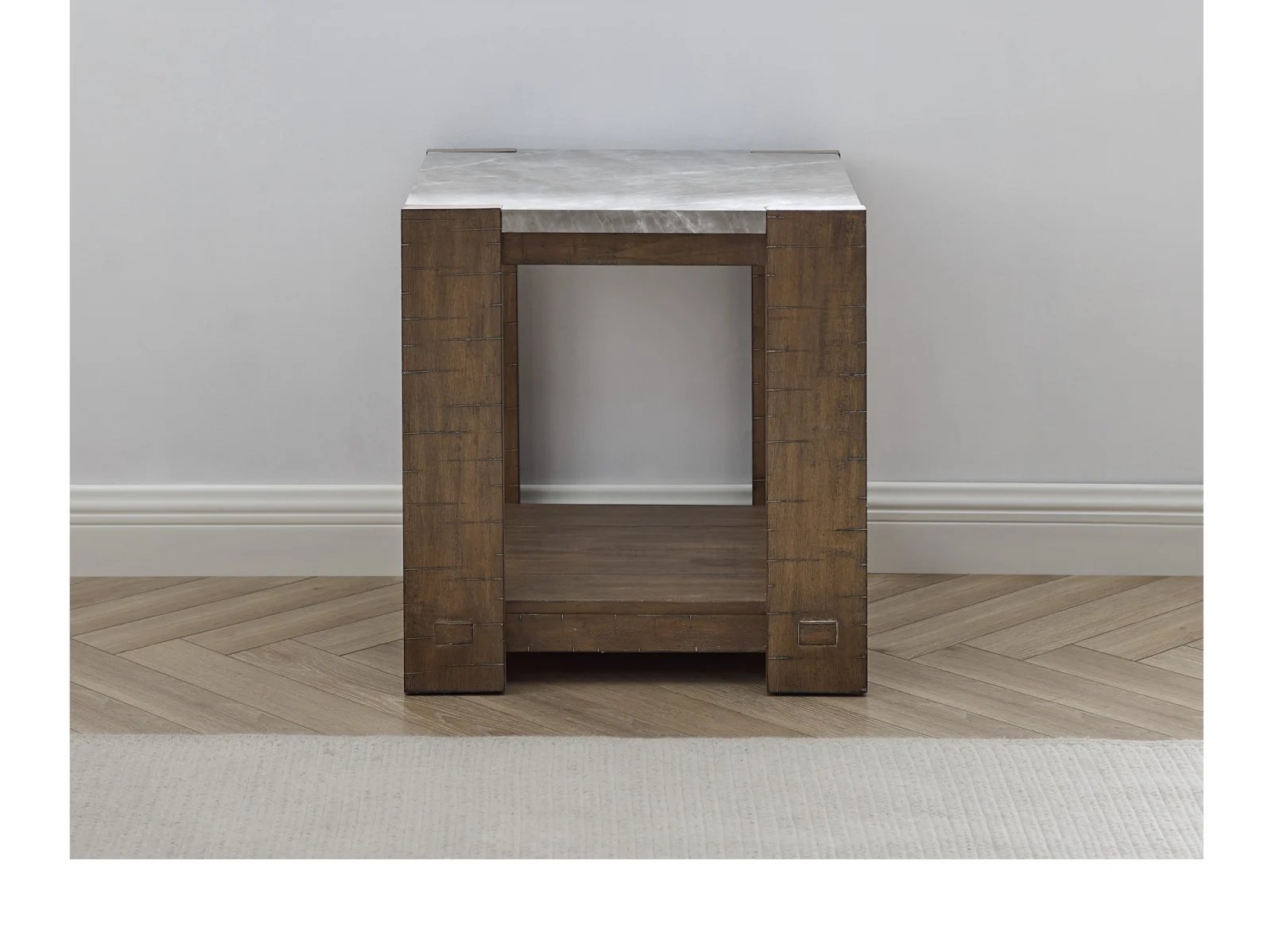 & Free ShippingThe Lucerne End Table masterfully blends rustic charm with contemporary elegance. Its striking gray Sintered Stone top contrasts beautifully with its wood frame, which is finished in a warm dusty tobacco color with saw rasp distressing and simulated exposed tenon accents. The Lucerne’s wide yet elegant post legs provide a substantial feel, and its bottom shelf offers both stability and practical storage.