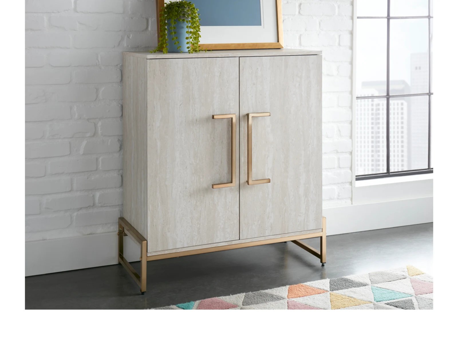 Luxor presents modern elegance in a compact Wine Cabinet/Server. Frameless door hinges offer easy-open elegance to an interior full of function: dual hanging stemware racks, a bottle storage rack and four adjustable shelves. The entire unit is covered in faux marble for an upscale look that will dress up any dining or bar area. Copper colored chrome hardware on pulls and Server base add to the contemporary profile of this functional and beautiful piece.
