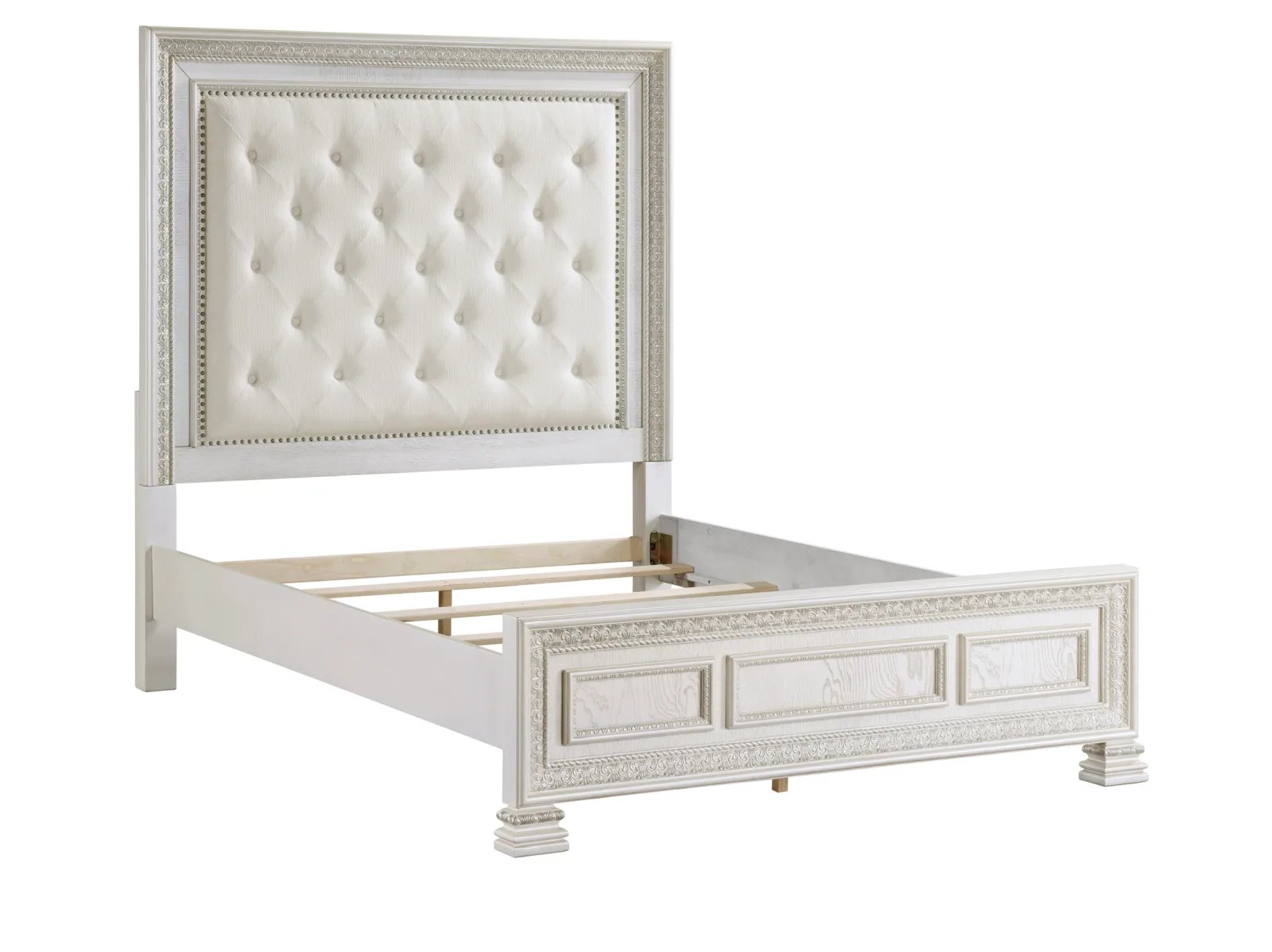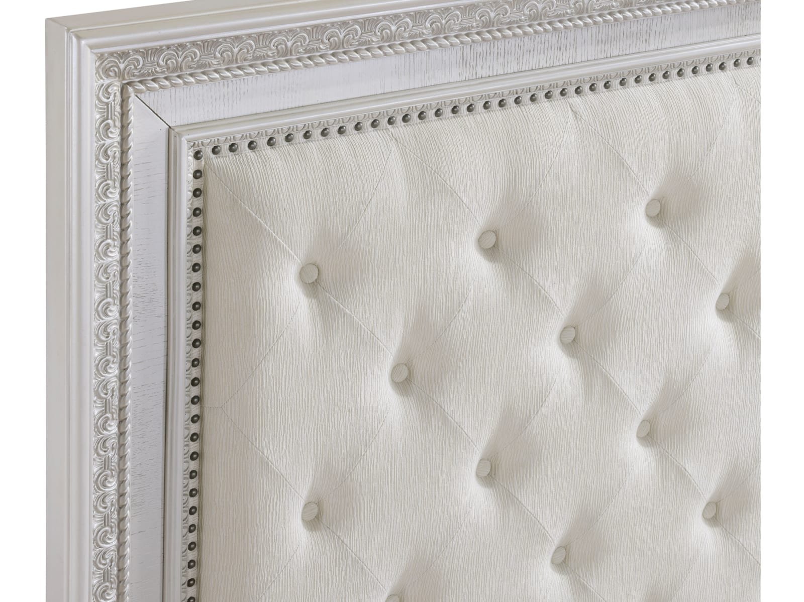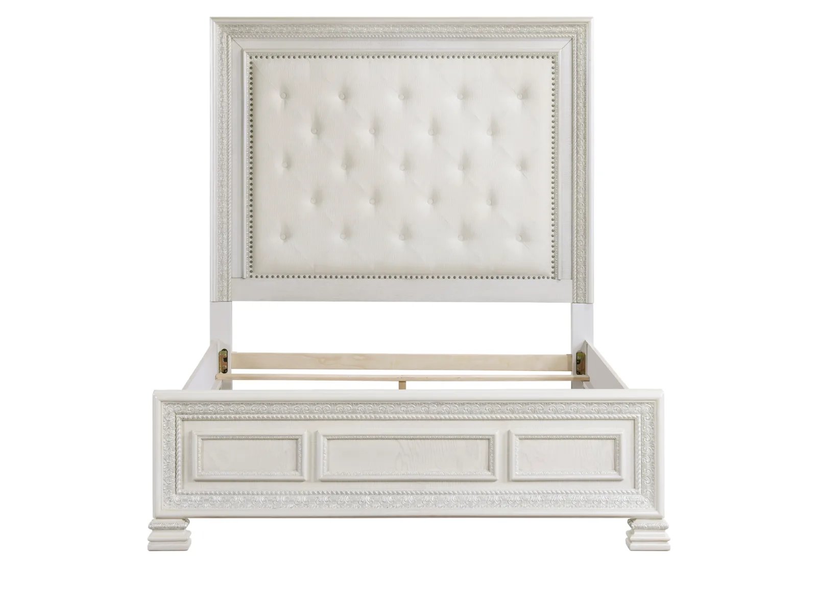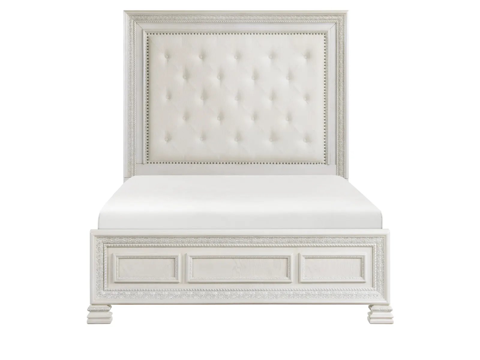 Modern Classicism meets serene comfort in the Macy Panel Bed. Dressed in a modern pearl white finish over exquisite ash veneer, this bed embodies timeless style with elegant old-world accents like egg and dart molding, acanthus detailing, and rope molding. The headboard features a pearl white textured fabric upholstery, beautifully button-tufted and accented with nailhead trim, creating a luxurious focal point for your bedroom.