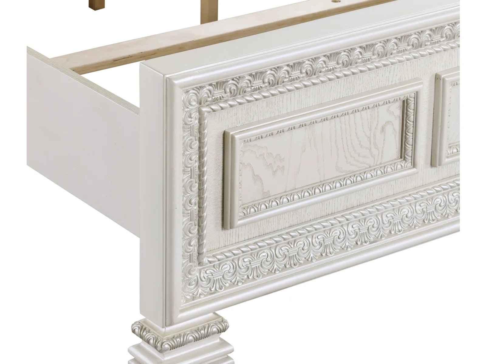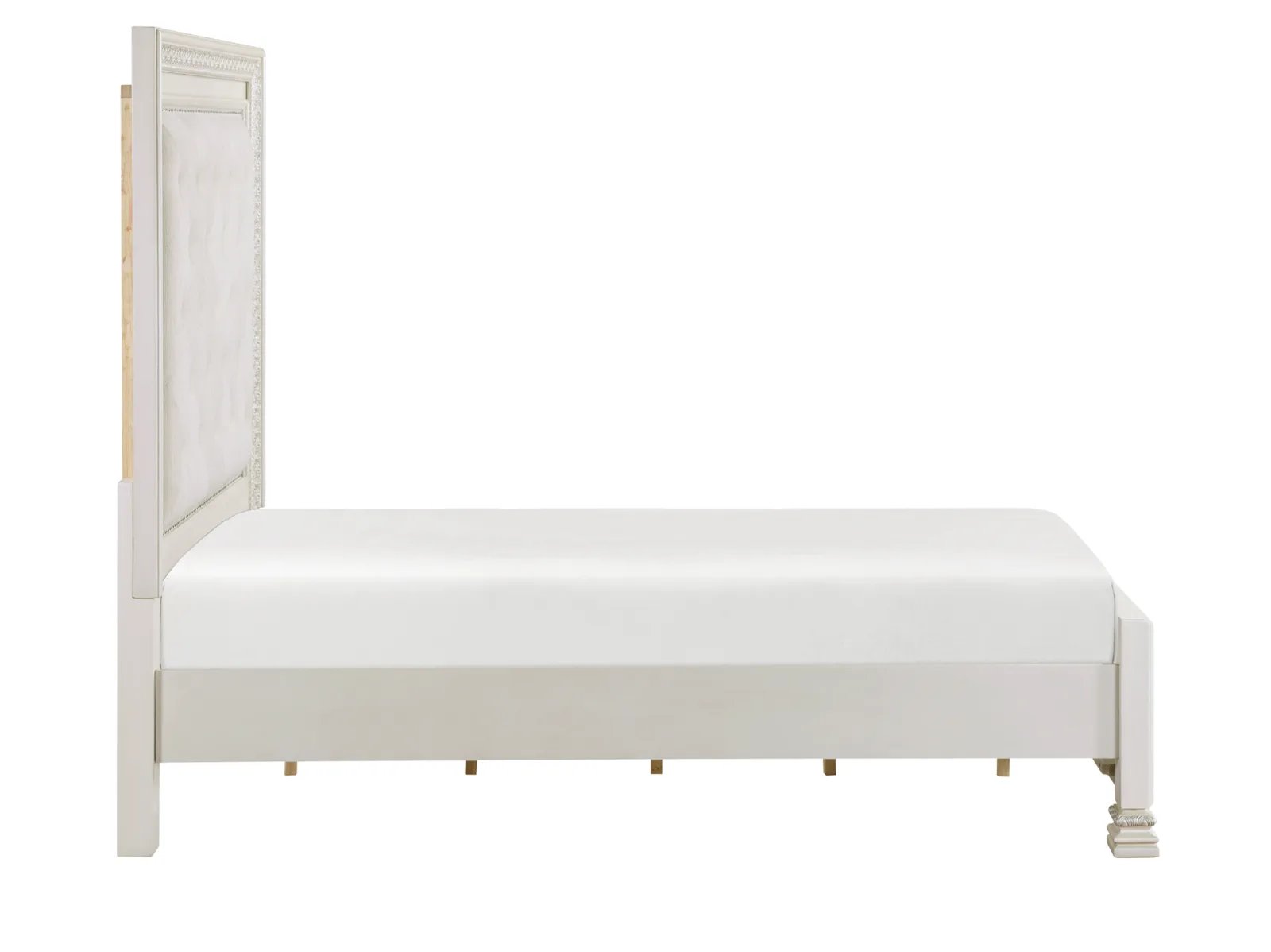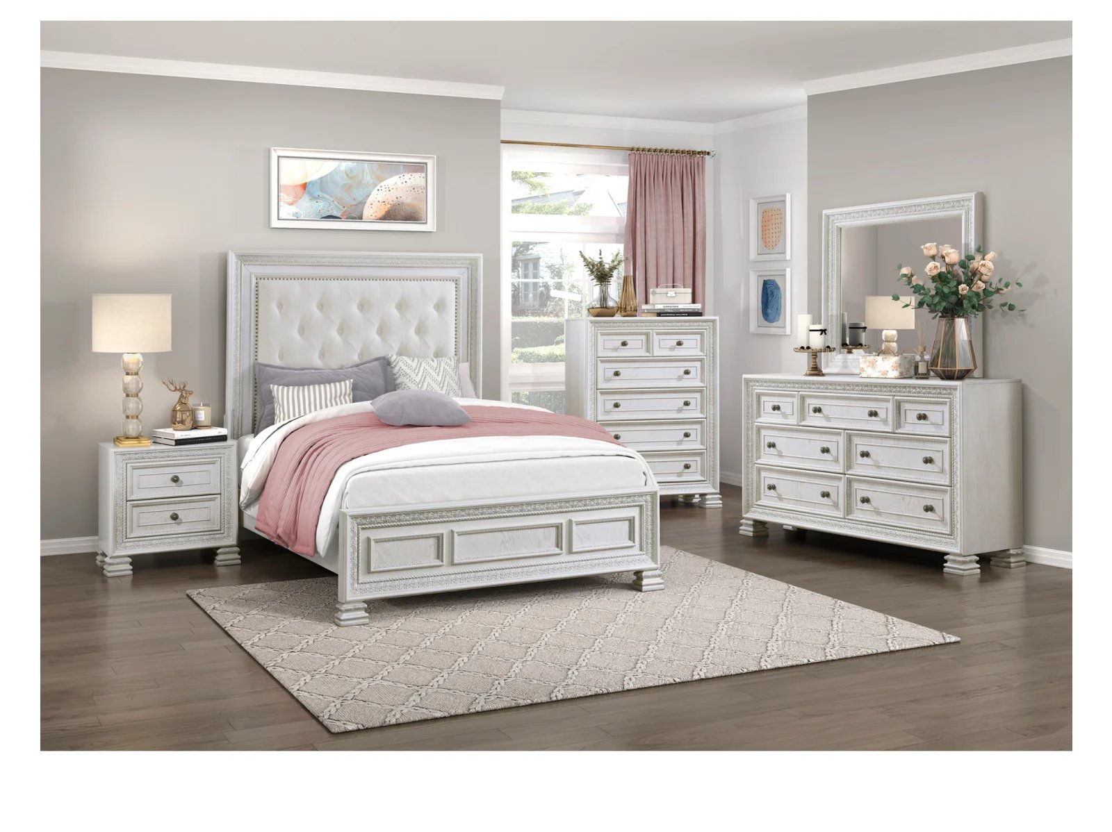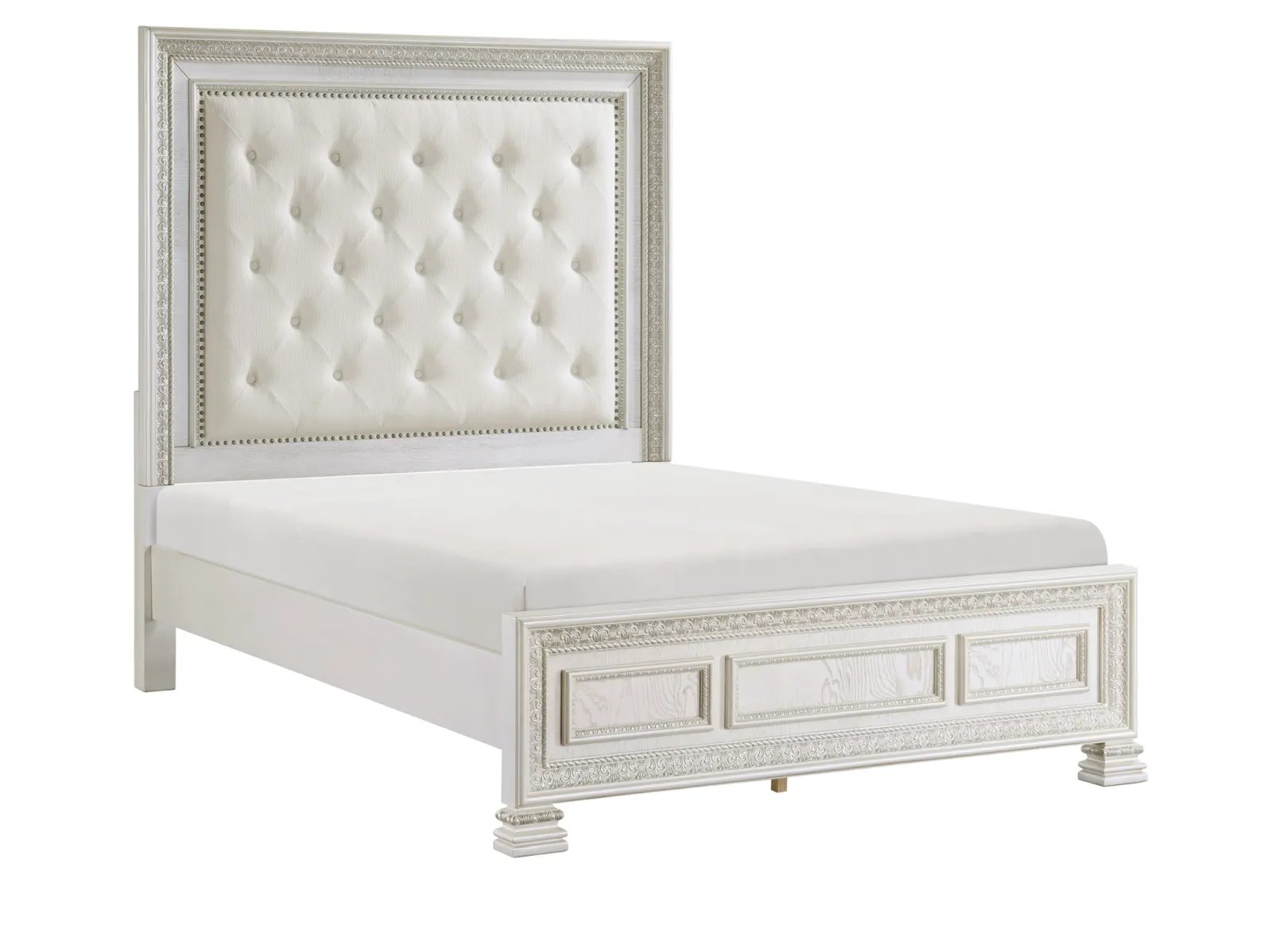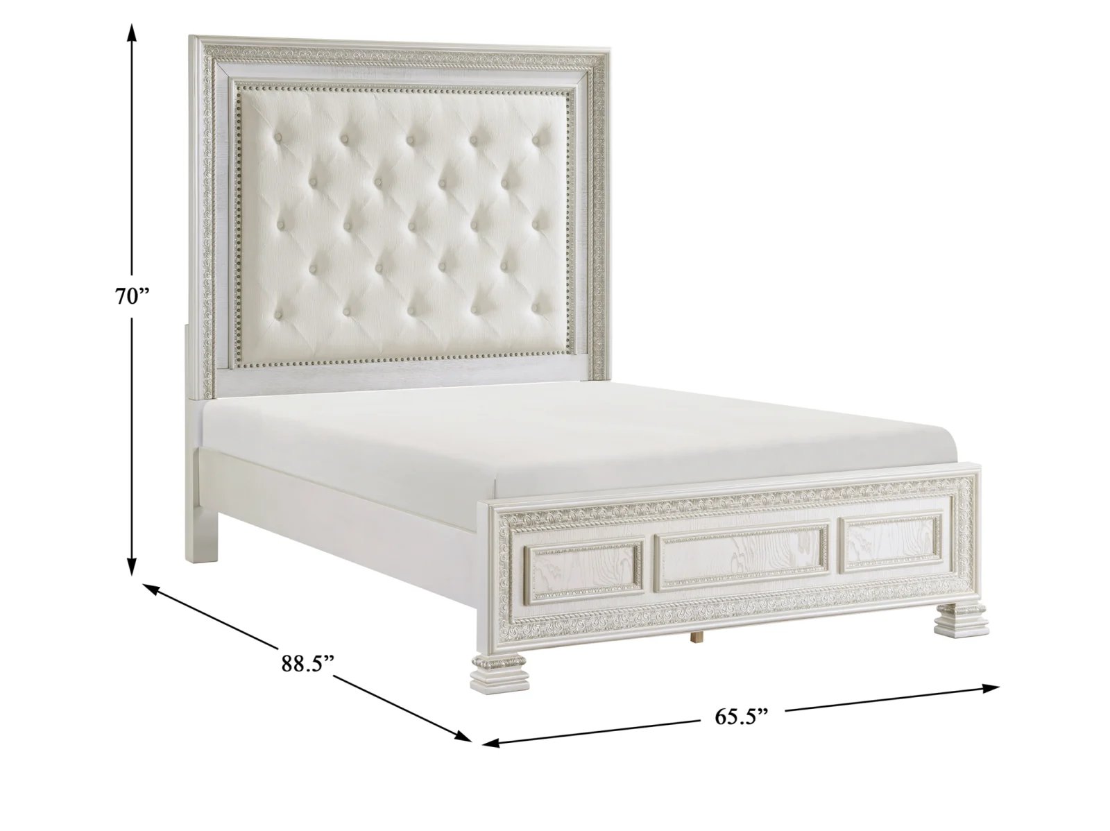 Modern Classicism meets serene comfort in the Macy Panel Bed. Dressed in a modern pearl white finish over exquisite ash veneer, this bed embodies timeless style with elegant old-world accents like egg and dart molding, acanthus detailing, and rope molding. The headboard features a pearl white textured fabric upholstery, beautifully button-tufted and accented with nailhead trim, creating a luxurious focal point for your bedroom.