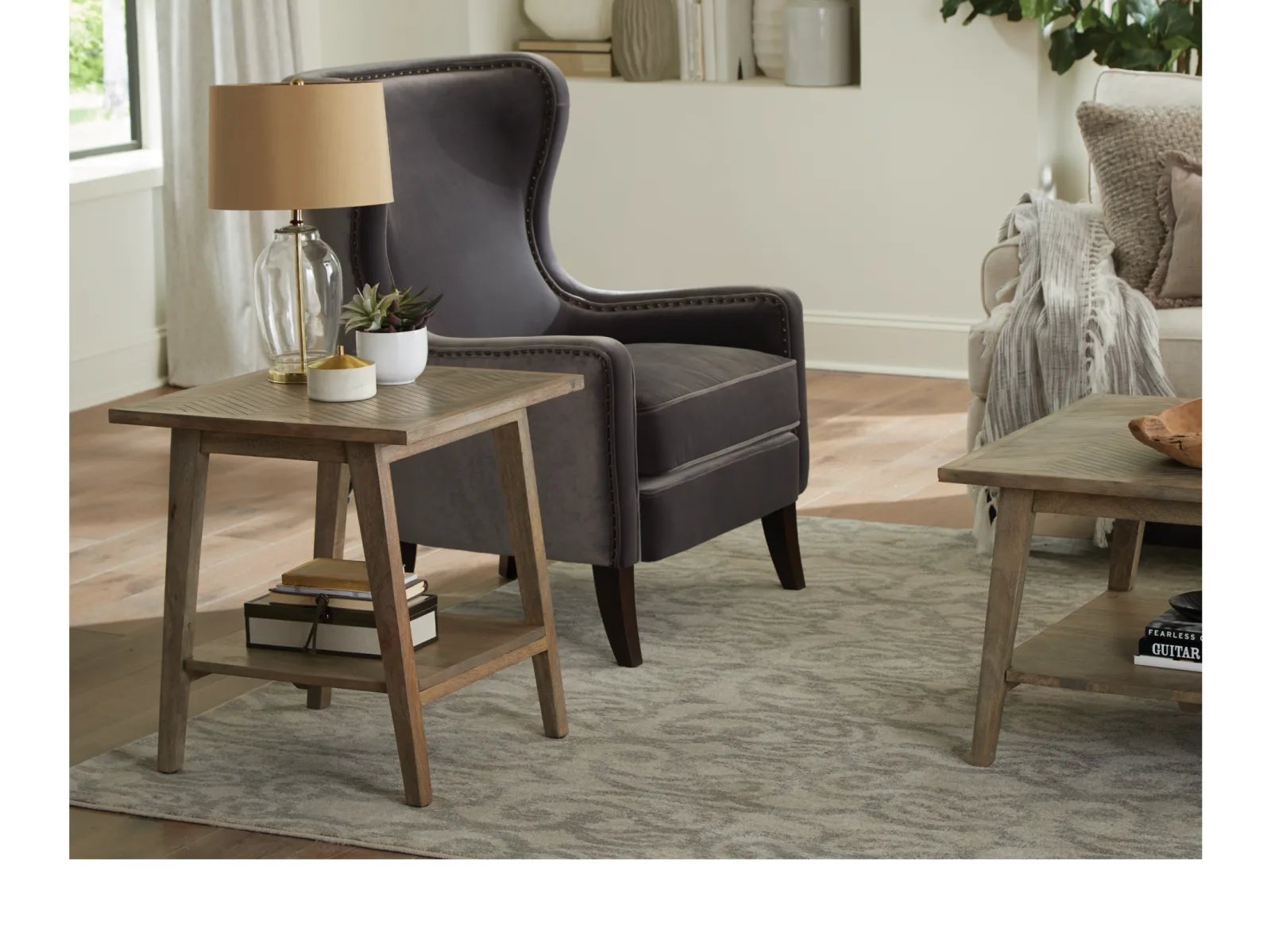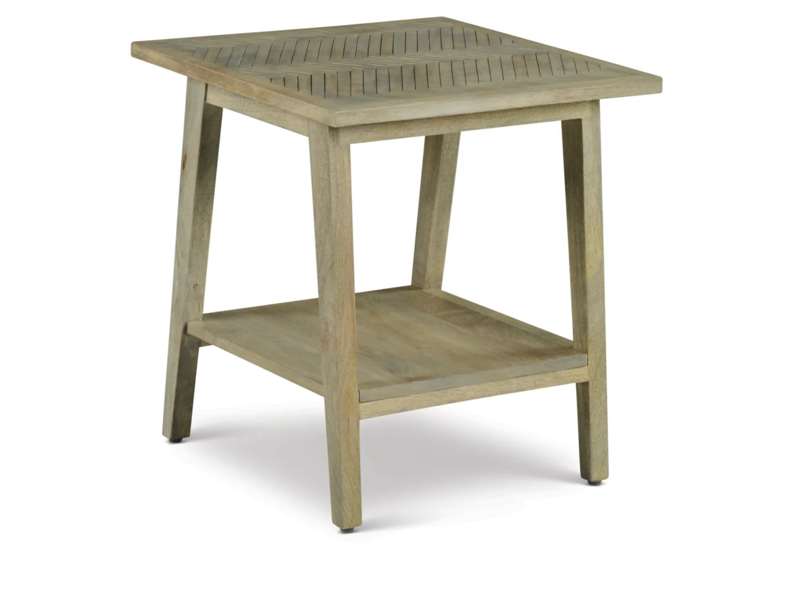 & Free ShippingExotic styling in a natural finish, the Manitou End Table features a chevron patterned top that fits most transitional styled interiors. Crafted of mango solids, the mid-century modern styling combines beautifully with the rustic charm of the natural finish to form an elegant silhouette. The bottom shelf adds to storage or display options and helps accessorize a room beautifully.