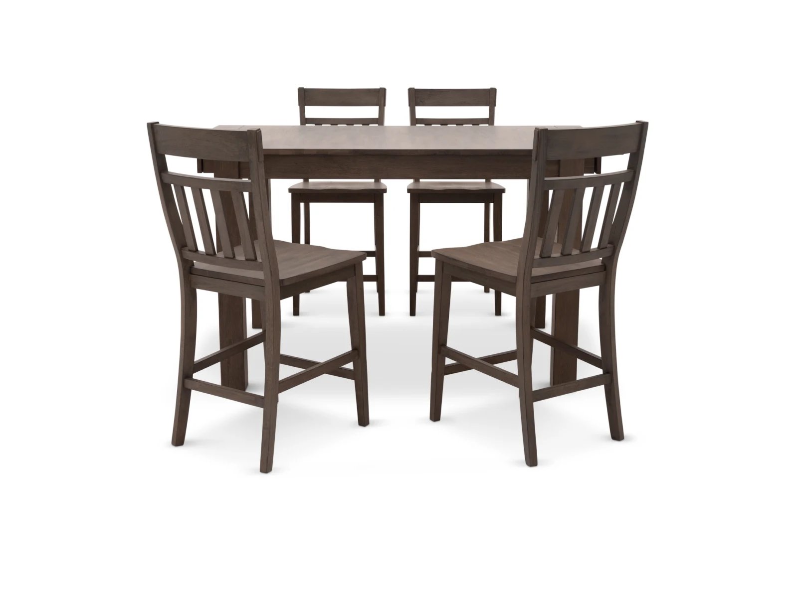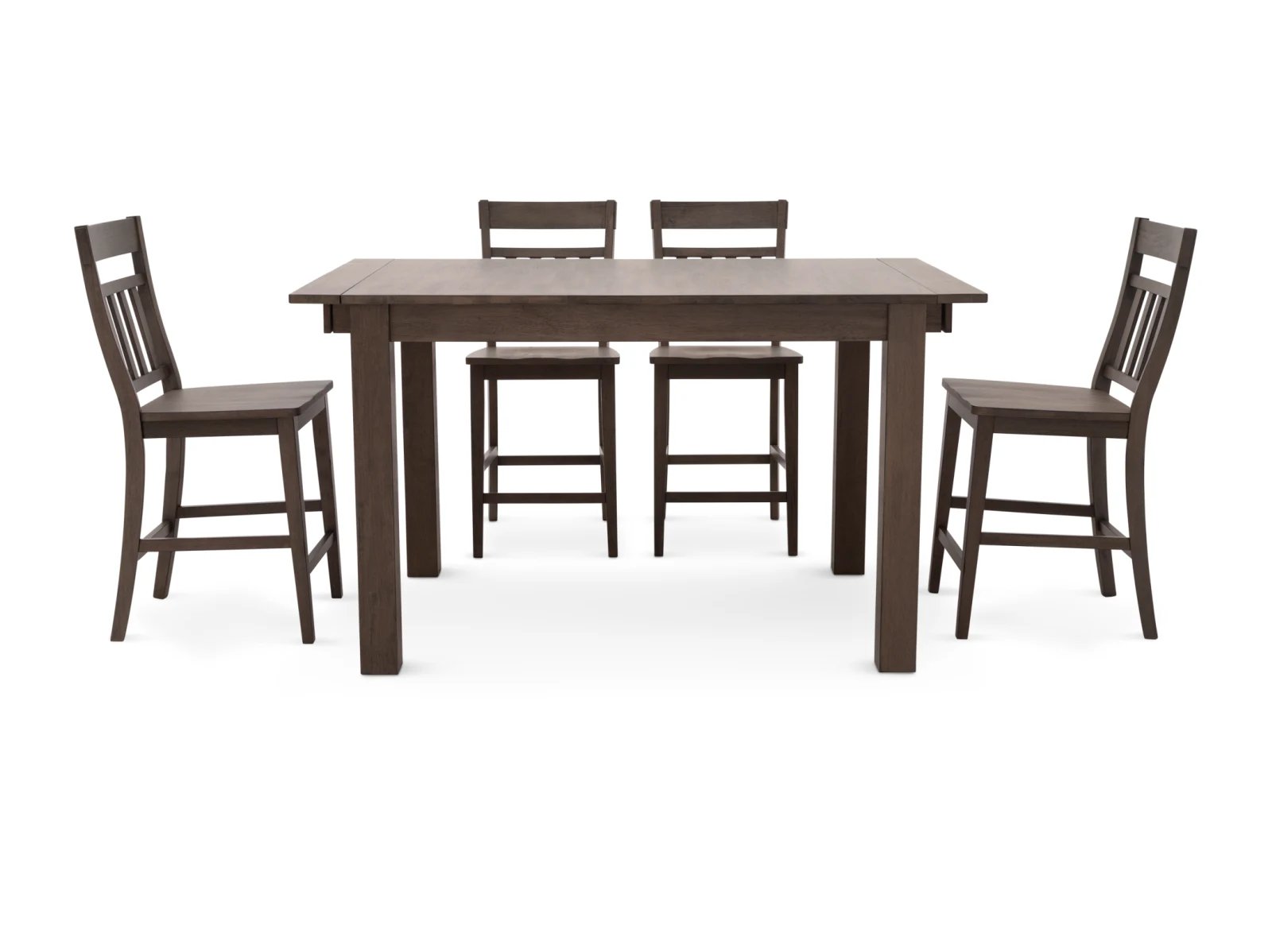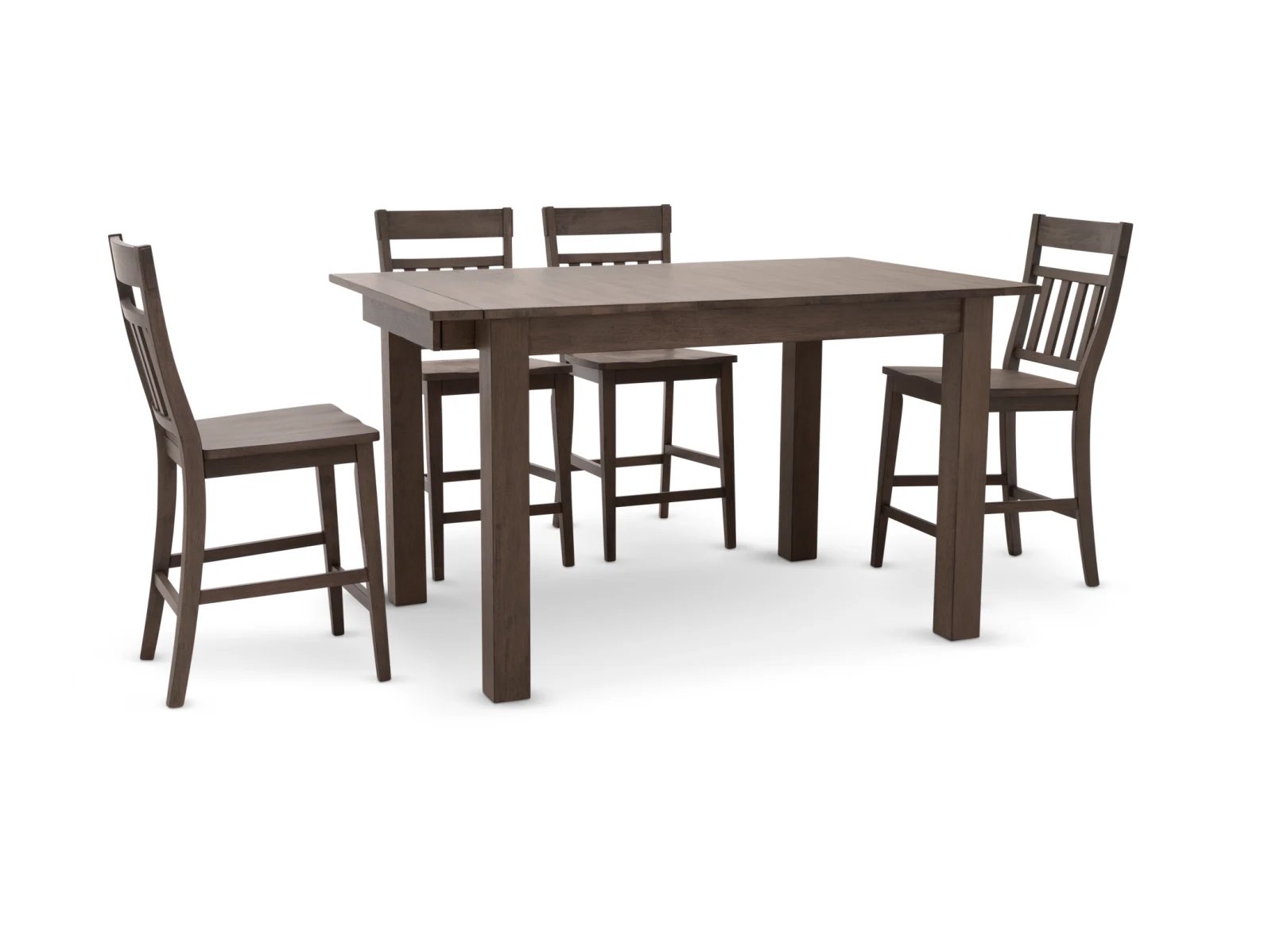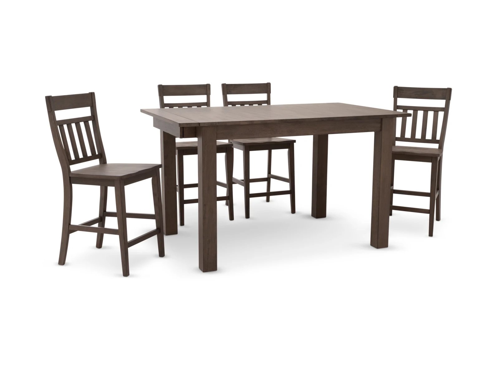 & Free ShippingThe Mariposa 5 Pc. Counter Height Dining Set offers a clean-lined contemporary look that’s perfect for today’s interiors. This attractive counter height set is crafted from solid rubberwood in a stylish washed gray finish, and the tall dining table features two self-storing 18” leaf extensions for added versatility. Four elegant barstools complete the set which feature modern slatted backrests as well as sturdy stretchers between their front and back legs. Add the Mariposa 5 Pc. Counter Height Dining Set to your collection today.